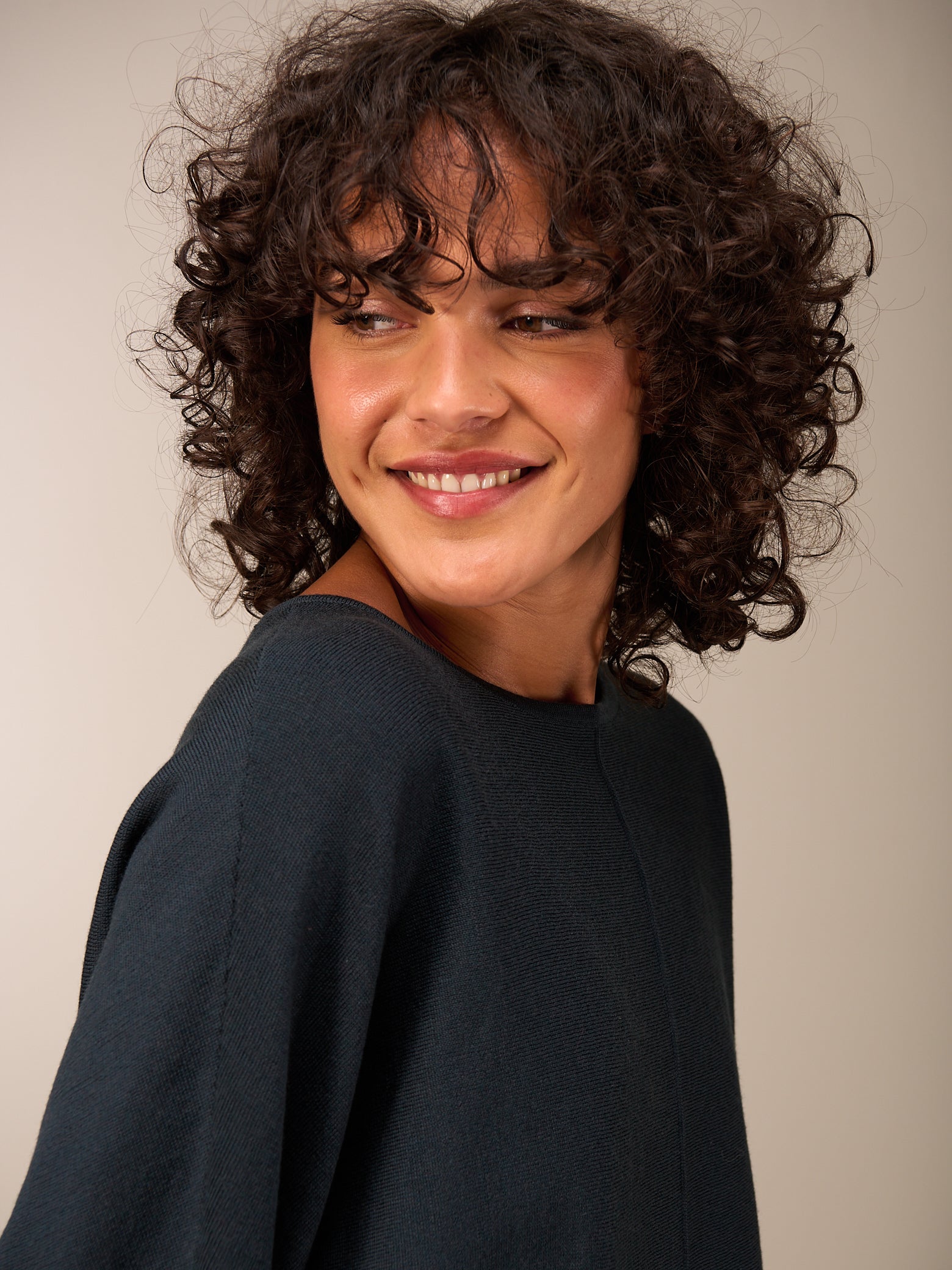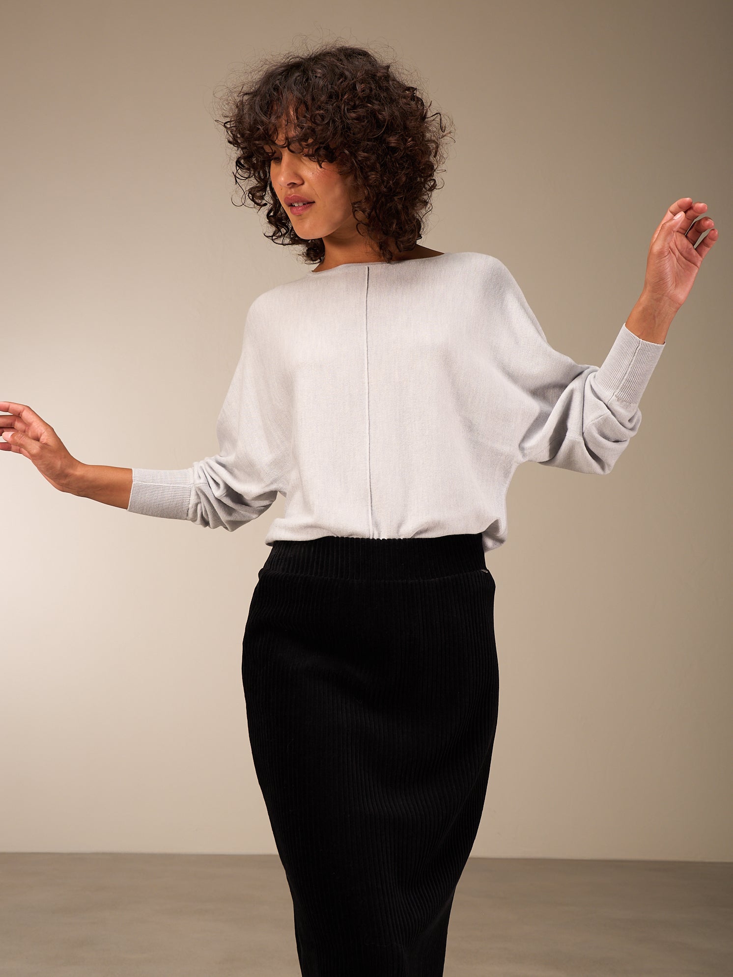 Maglia dal taglio ampio e alla moda in uno speciale filato melange con ampie maniche a pipistrello, cuciture decorative e scollo rotondo. Particolarmente bello con i pantaloni larghi.