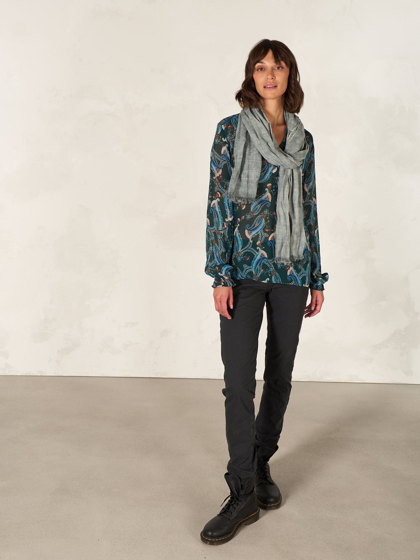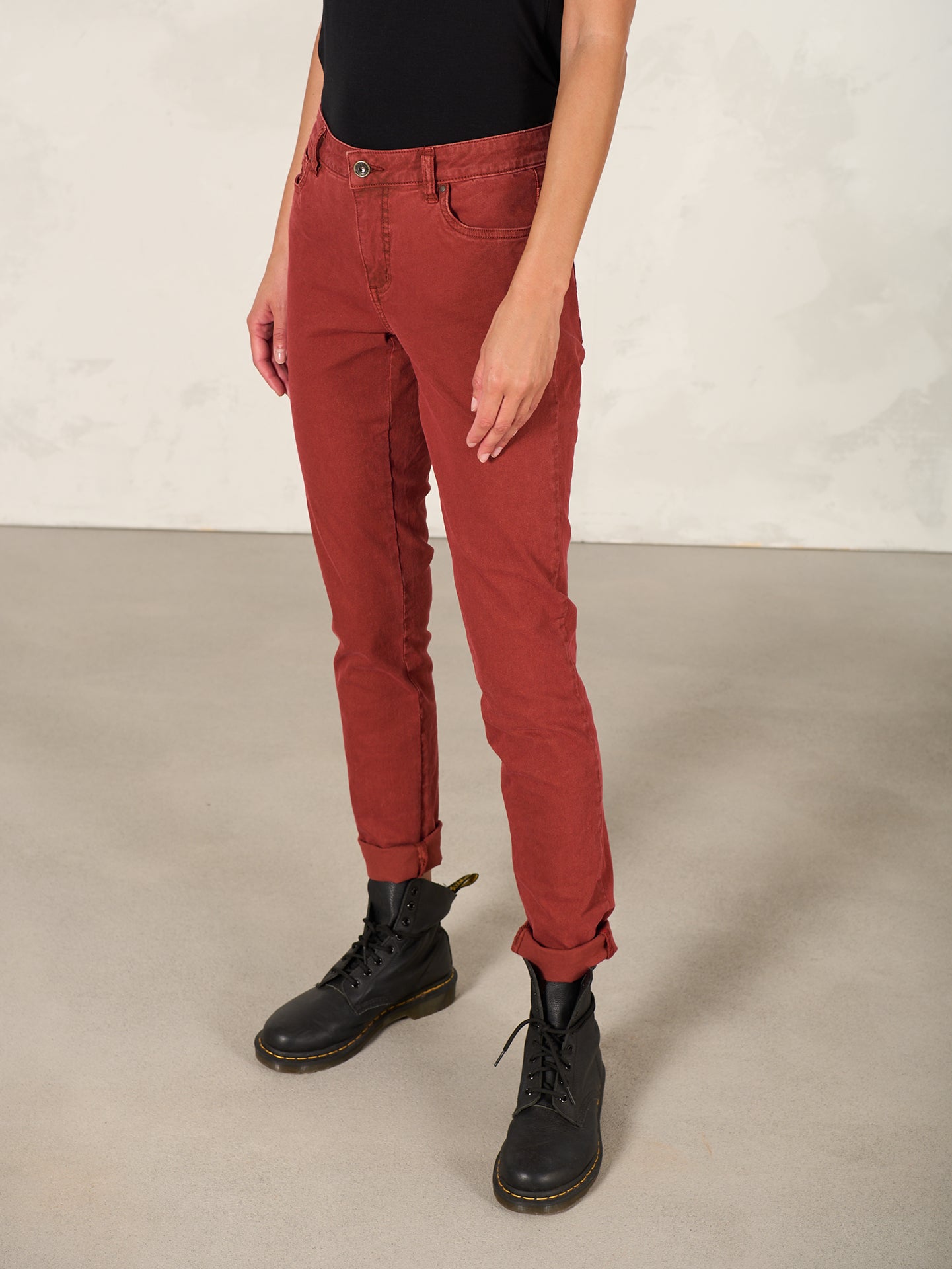 Pantaloni aderenti alla figura con cintura inferiore. Tasche a 5 scomparti con dettagli trapuntati. I nastri decorativi sul risvolto e il piccolo ricamo sul taschino portamonete valorizzano ulteriormente i pantaloni.