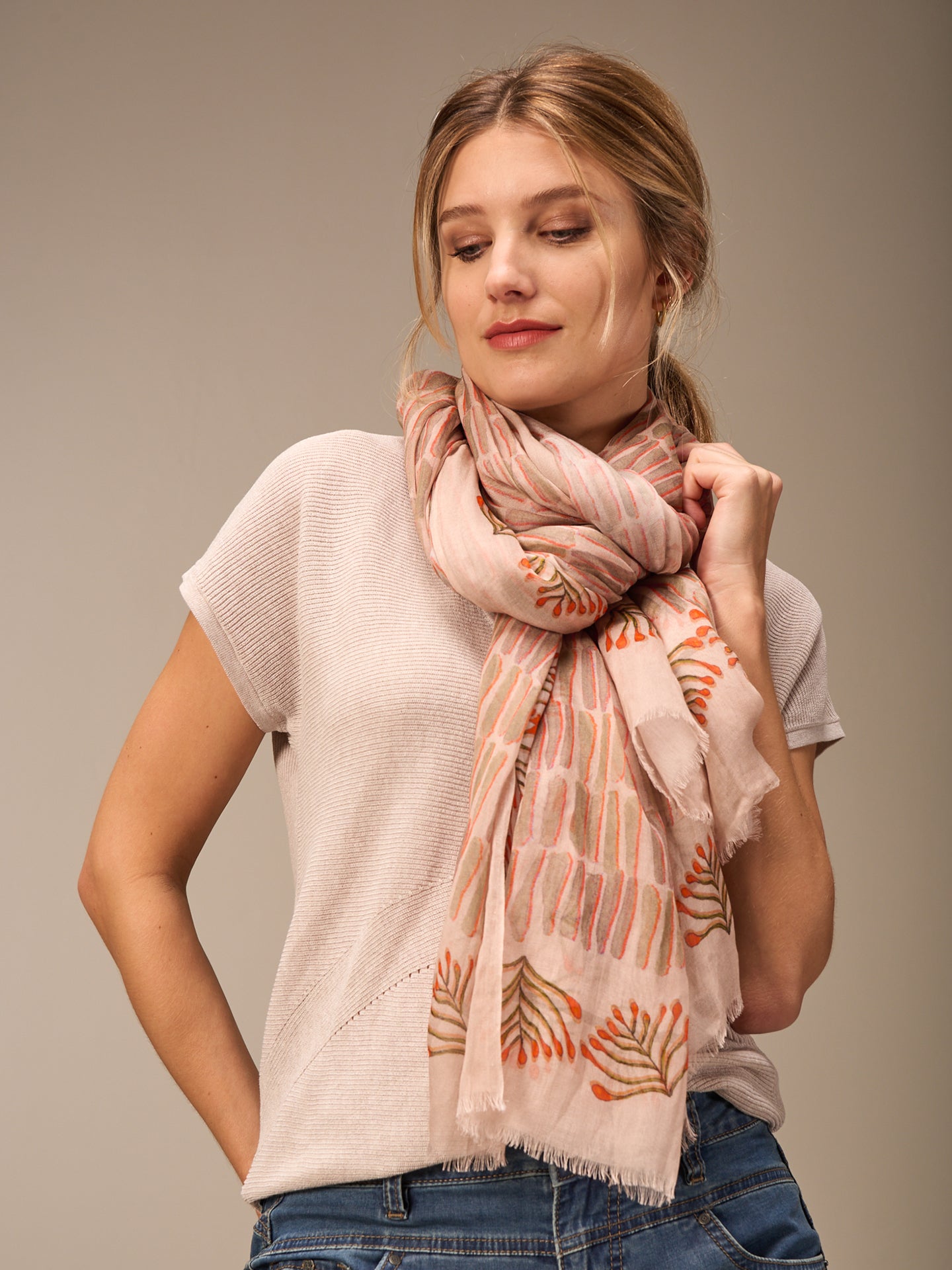 Sciarpa rettangolare leggermente trasparente con stampa all-over e frange sul bordo più corto. 100% modal (certificato TENCELTM).