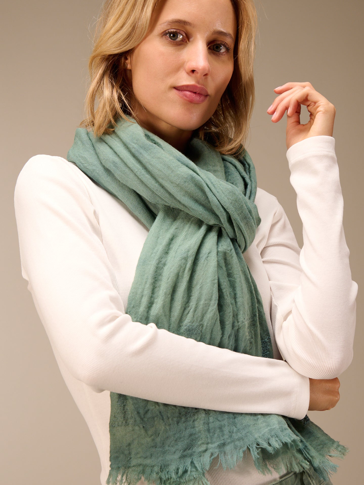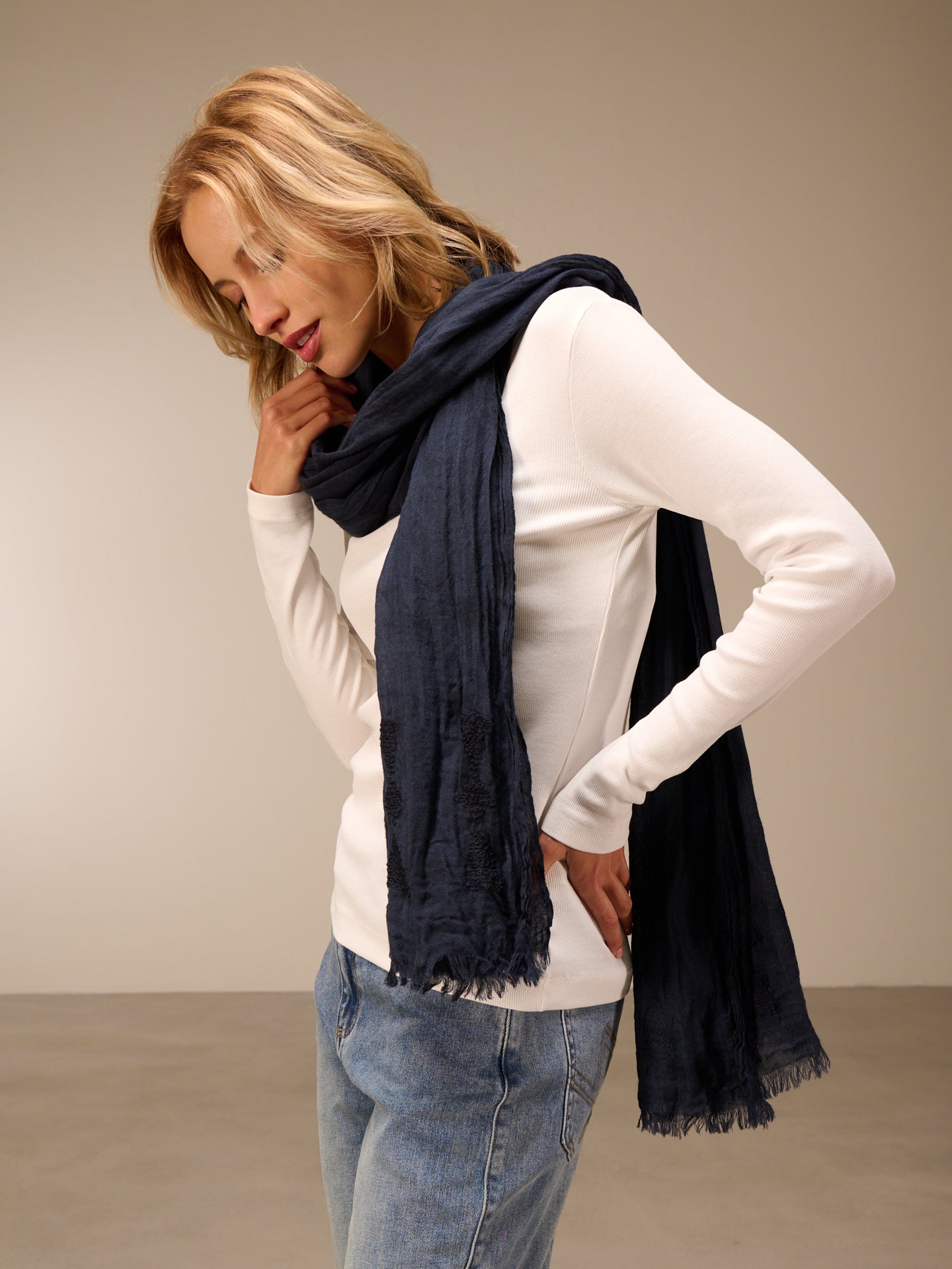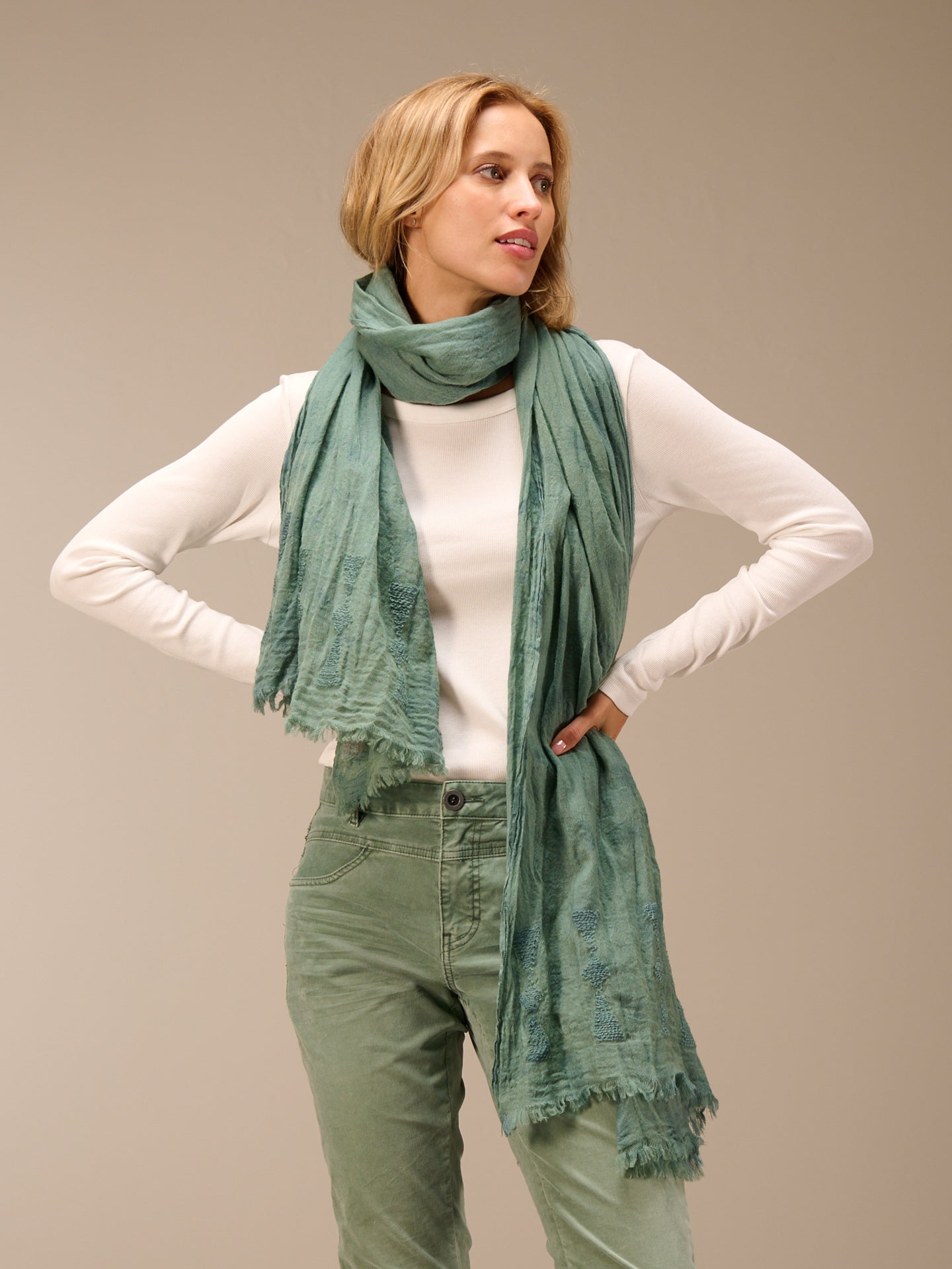 Sciarpa monocolore con frange e ricami, dimensioni 75x200 cm. Grazie a uno speciale processo di tintura, la sciarpa acquista un bellissimo effetto slavato. Le irregolarità nel colore rendono questo capo unico. L'effetto slavato è accentuato.