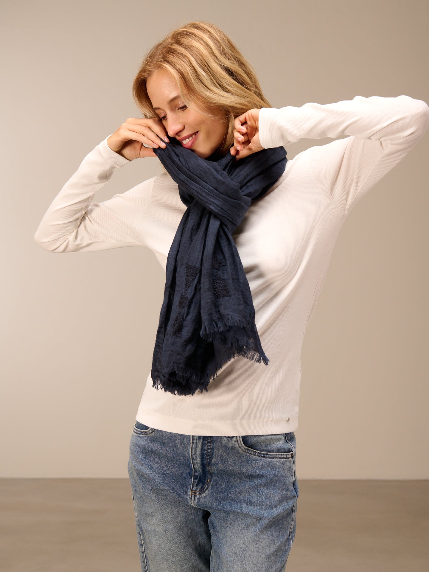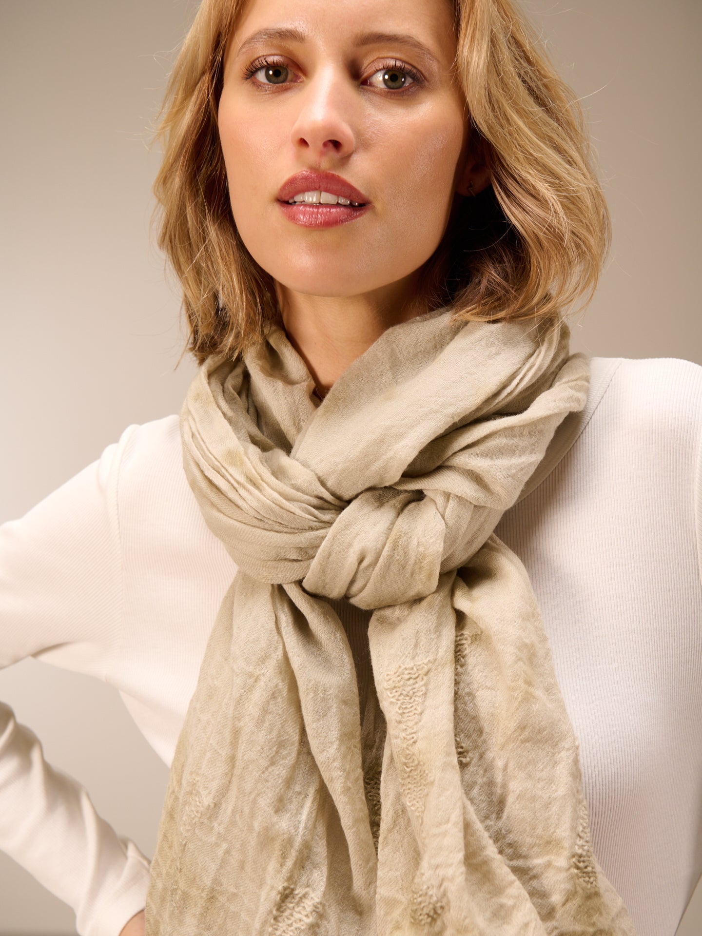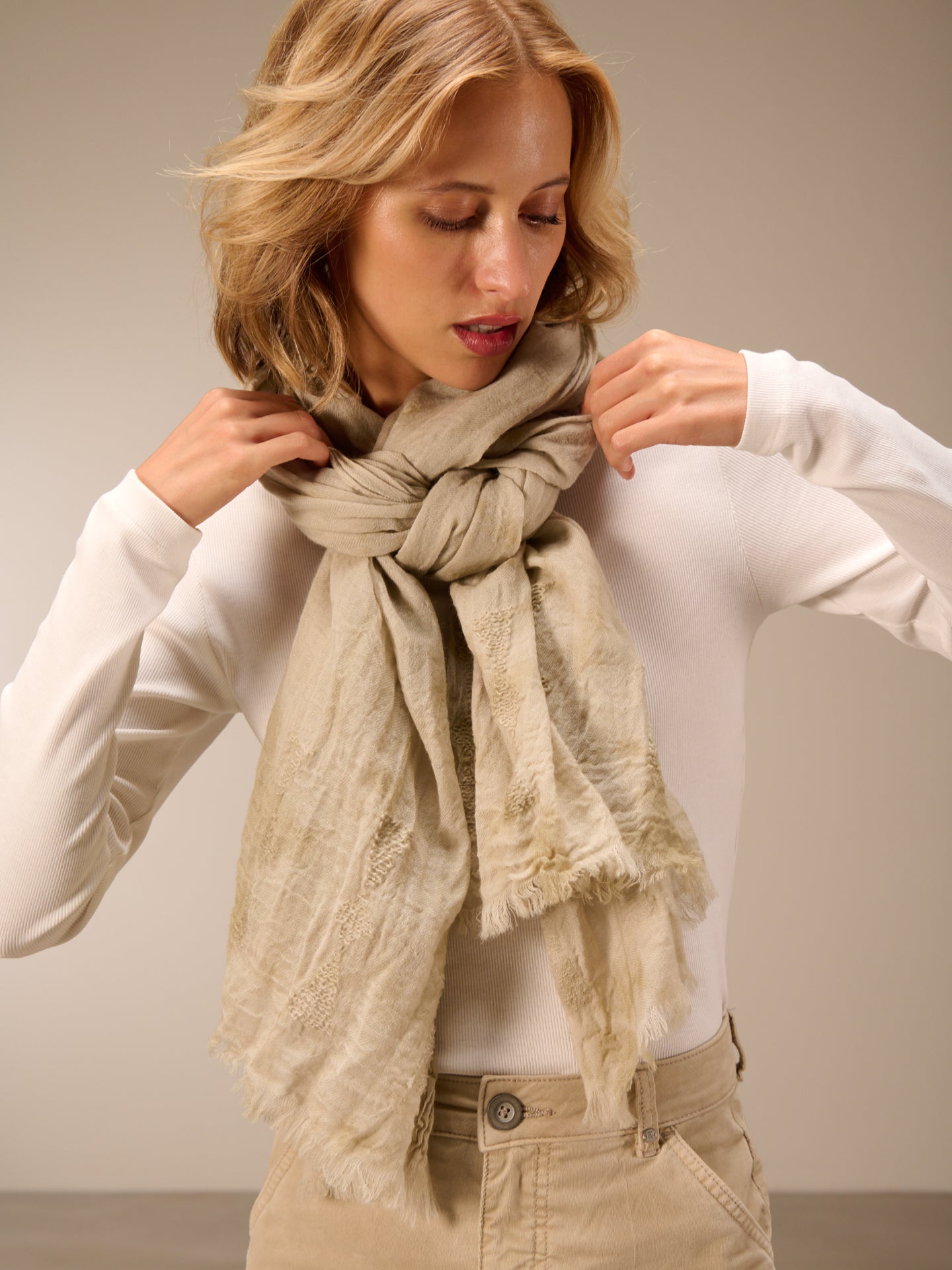 Sciarpa monocolore con frange e ricami, dimensioni 75x200 cm. Grazie a uno speciale processo di tintura, la sciarpa acquista un bellissimo effetto slavato. Le irregolarità nel colore rendono questo capo unico. L'effetto slavato è accentuato.