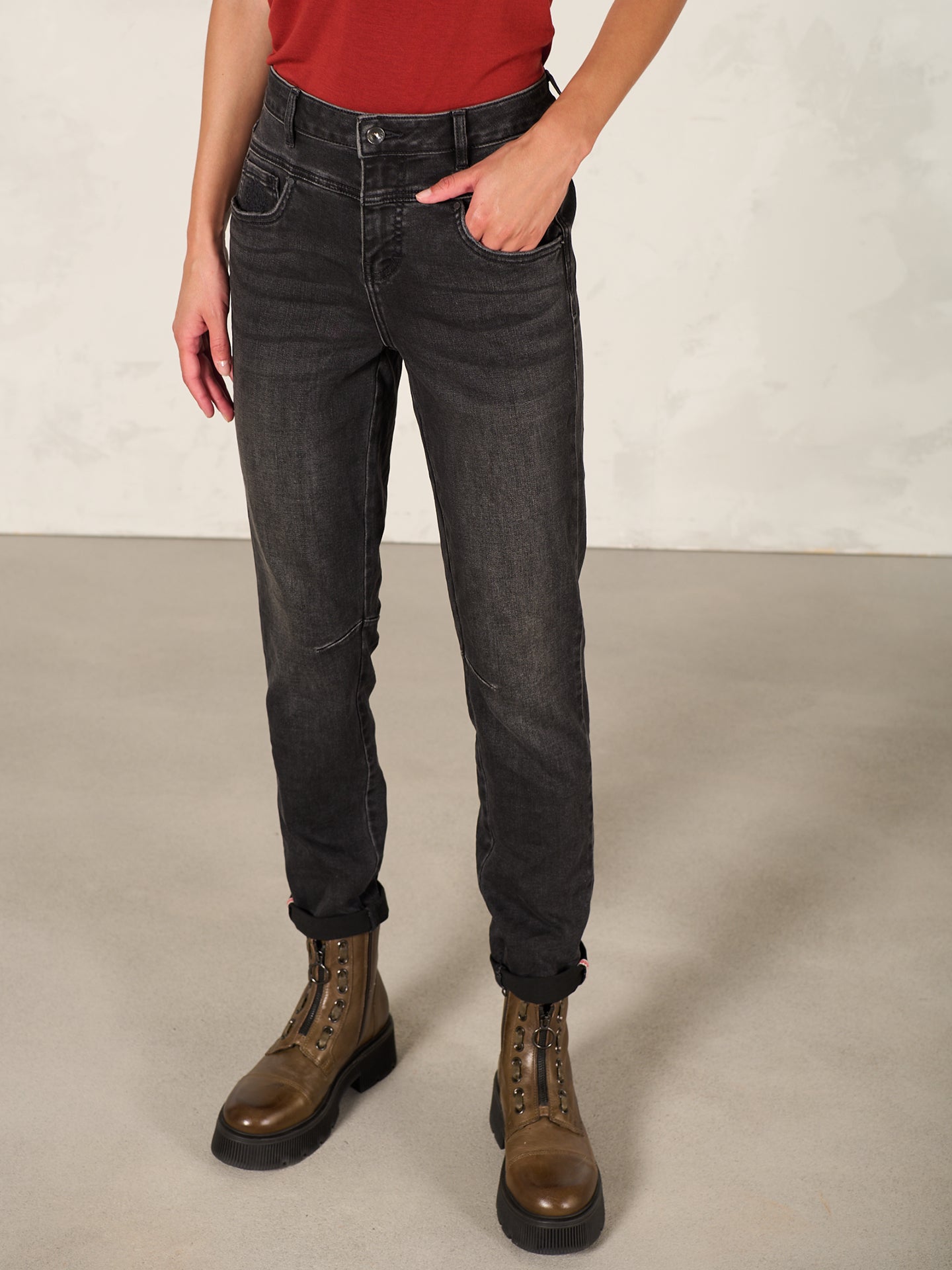 Pantaloni dalla vestibilità casual sui fianchi. Le gambe dei pantaloni si assottigliano verso la caviglia e sono arrotolate per un look fresco. I nastri decorativi sul risvolto e il piccolo ricamo sull'apertura delle tasche valorizzano ulteriormente il jeans. Le irregolarità del colore rendono il capo unico. L'effetto sbiadito si intensifica durante il lavaggio. Il prodotto può macchiare gli indumenti e le superfici.