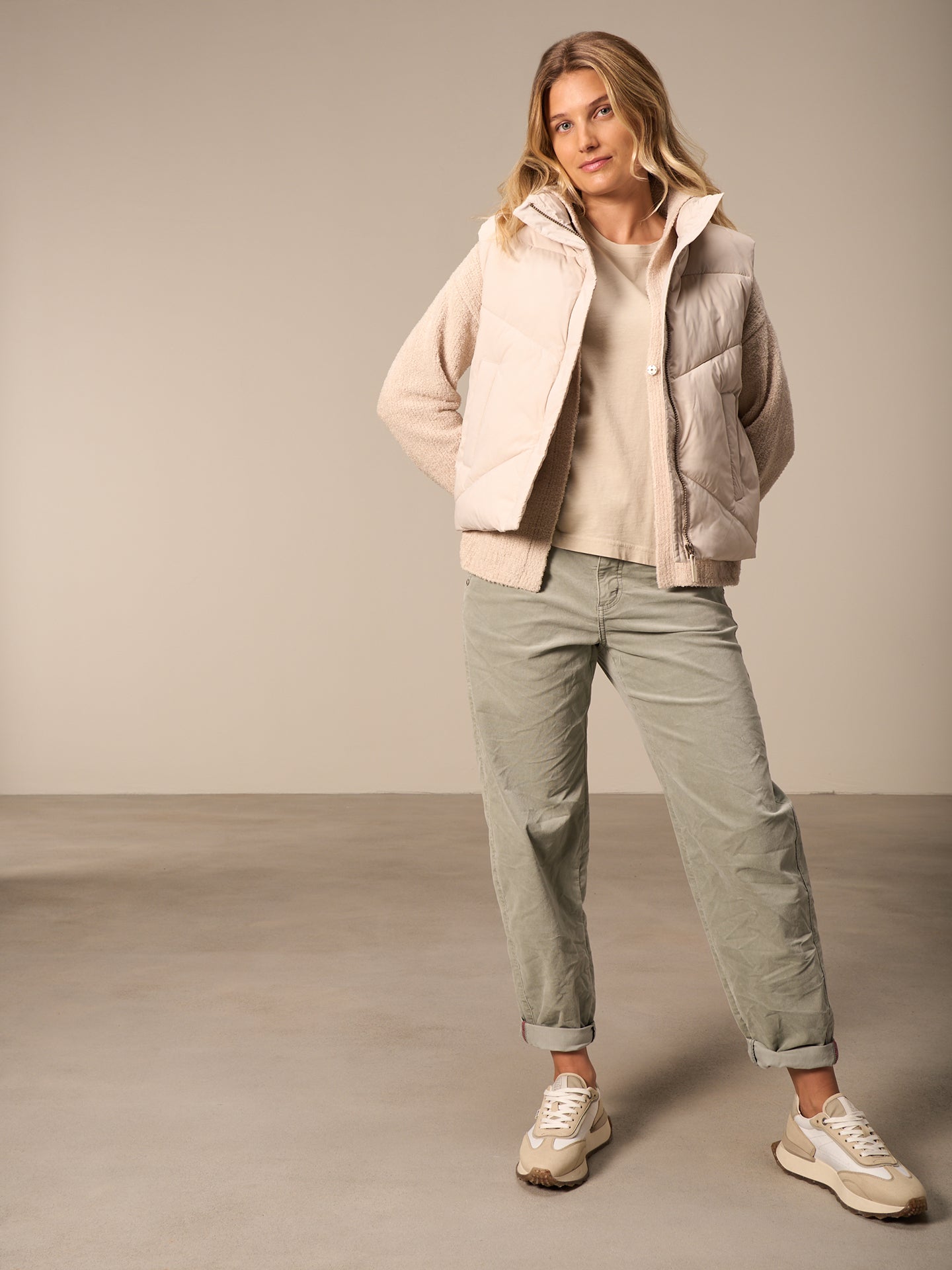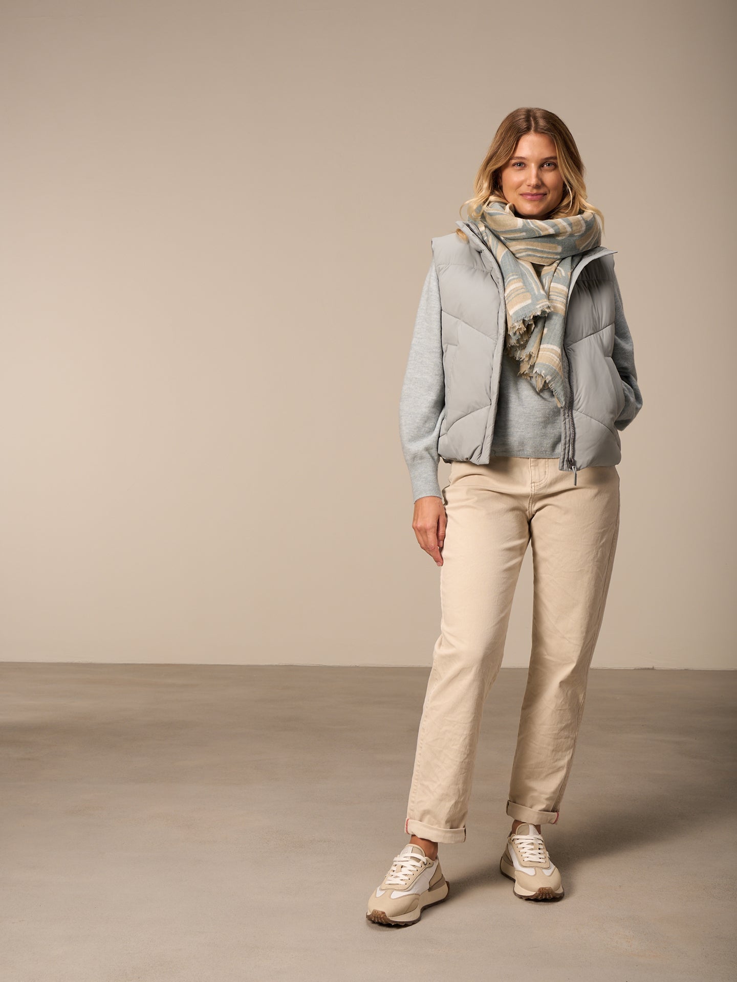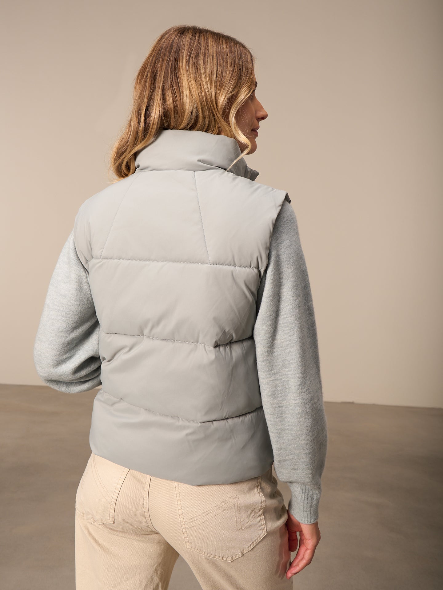 Moderno gilet corto di forma squadrata con tasche laterali con cerniera e finitura opaca idrorepellente ed elegante. L'ampiezza dell'orlo può essere regolata con un cordoncino elastico. Il tessuto no-down di tendenza con morbida imbottitura è ultraleggero ma caldo. L'imbottitura ThermoPlume di PrimaLoft è la nostra alternativa alla piuma d'oca e offre un'elevata ritenzione di calore, è resistente all'umidità e ha una sensazione morbida e piumosa.
