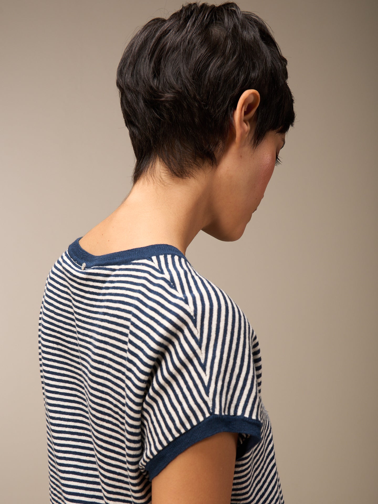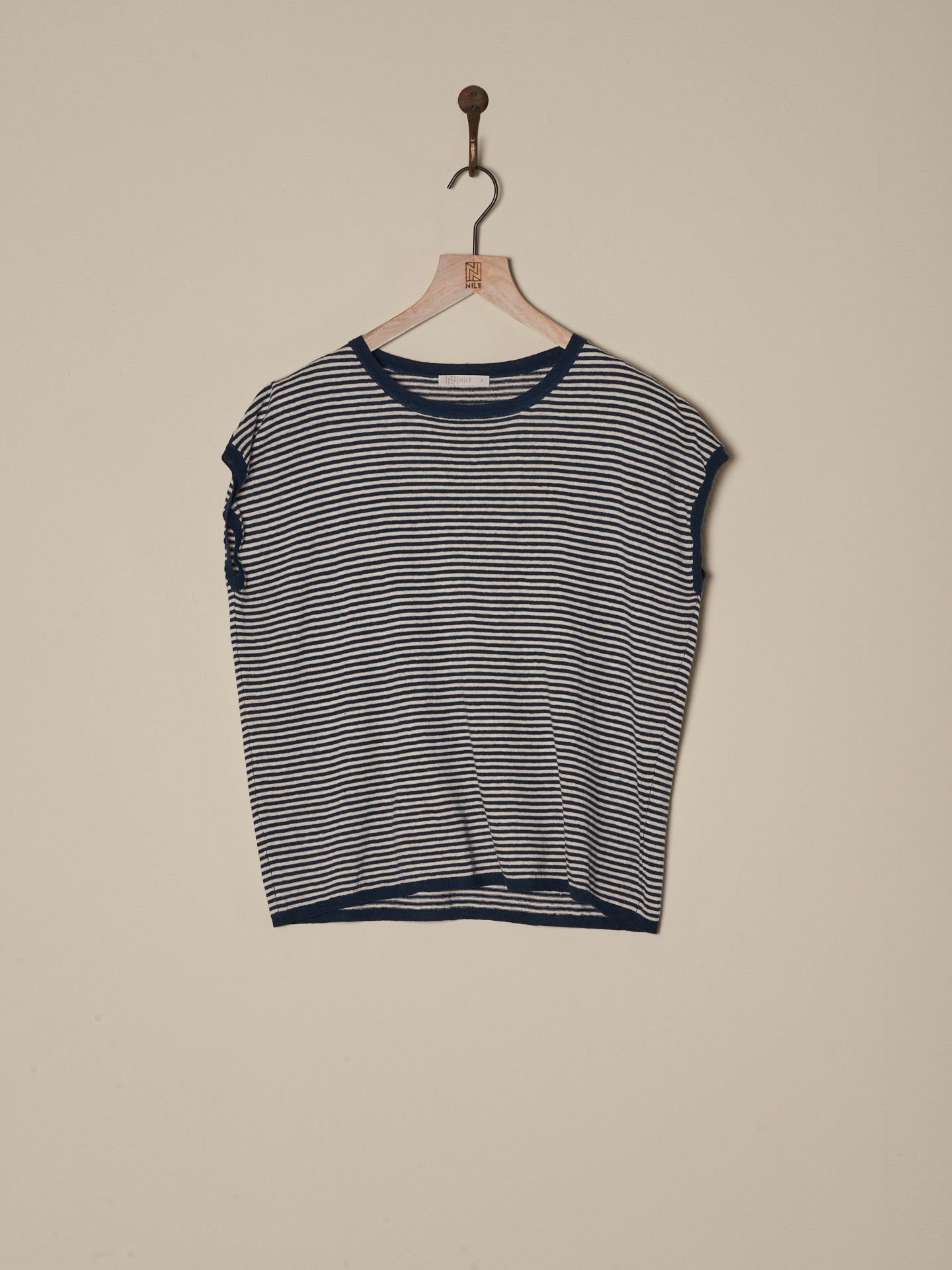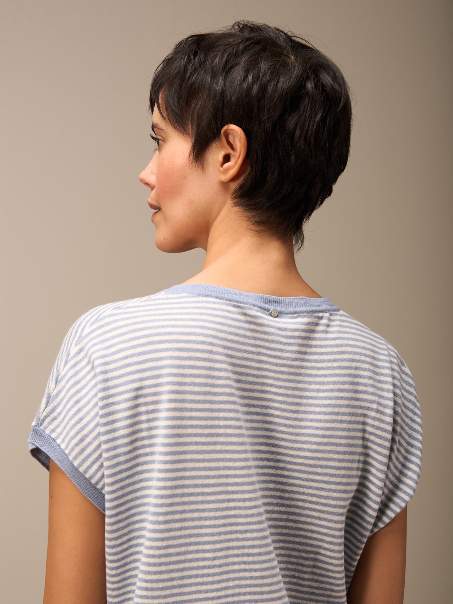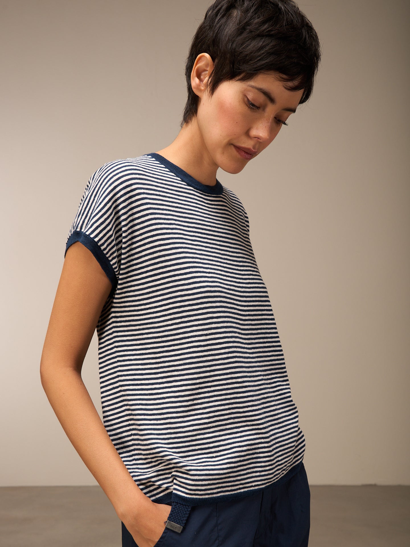 Maglione senza maniche con motivo a maglia rasata, spalle scese, scollo rotondo e speciale bordo a costine sull'orlo e sul giromanica. Le righe conferiscono al maglione un tocco sportivo e casual.
