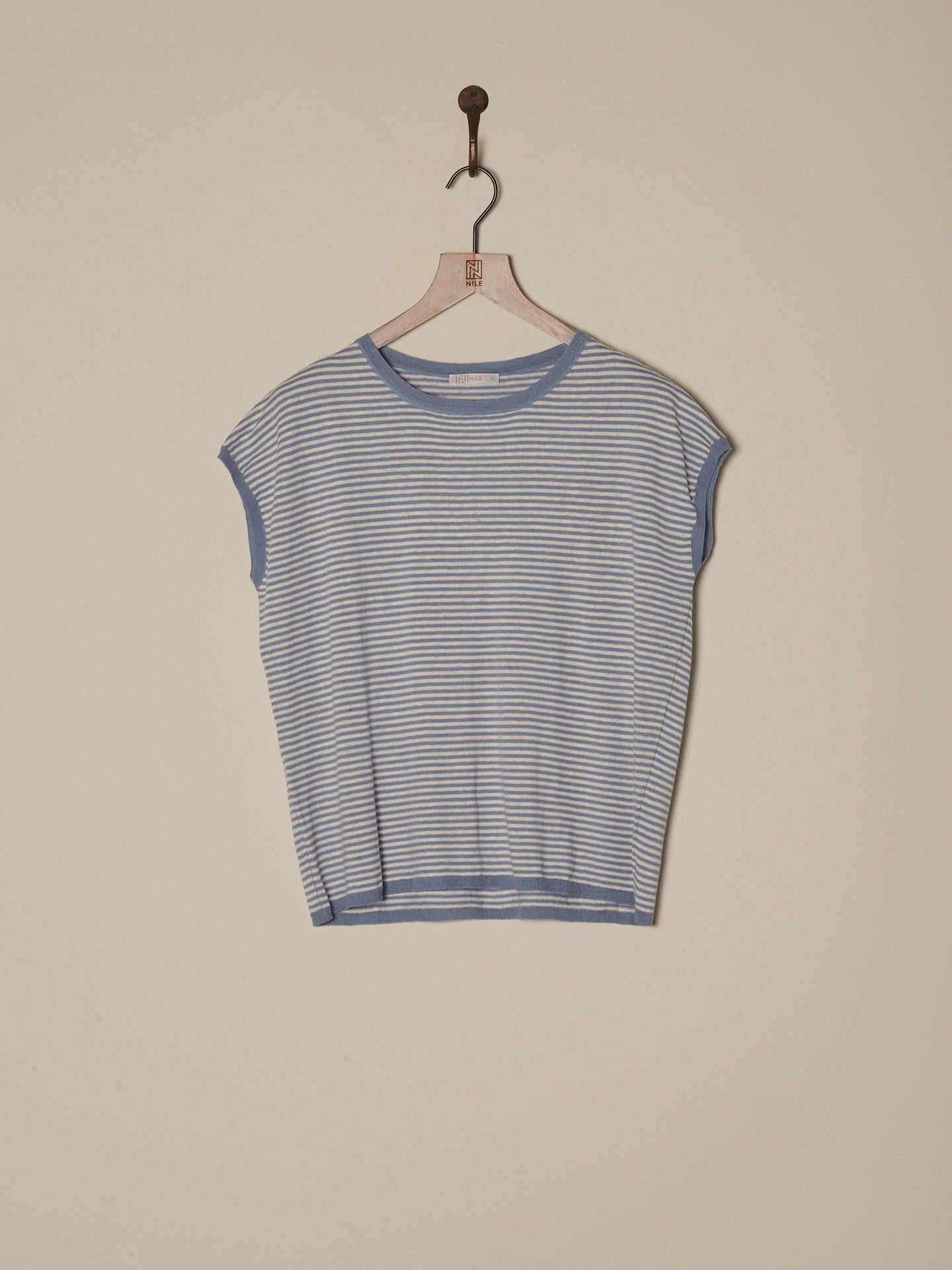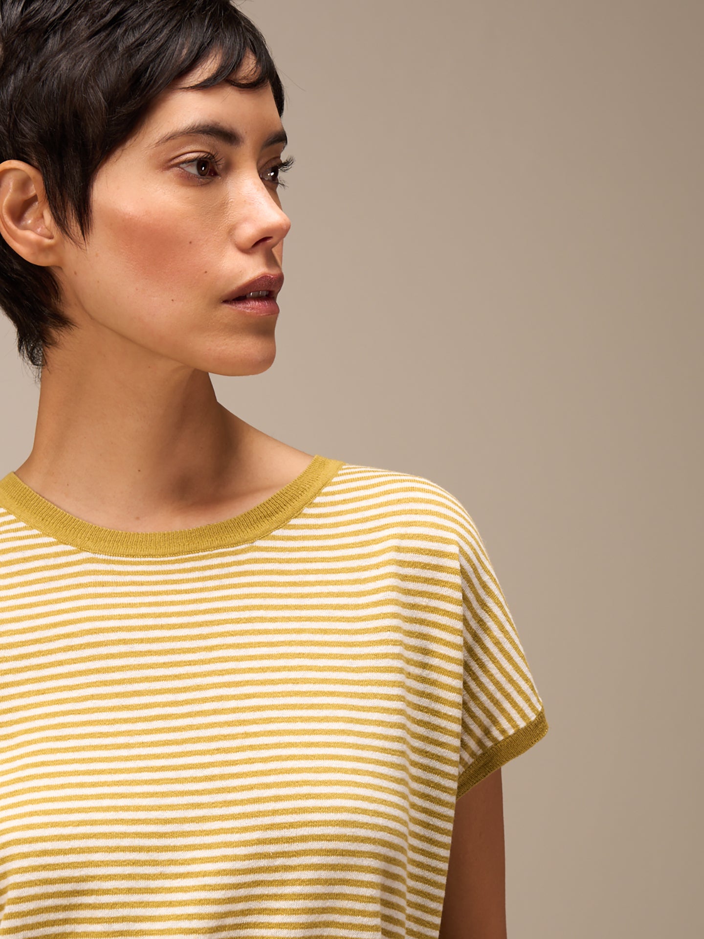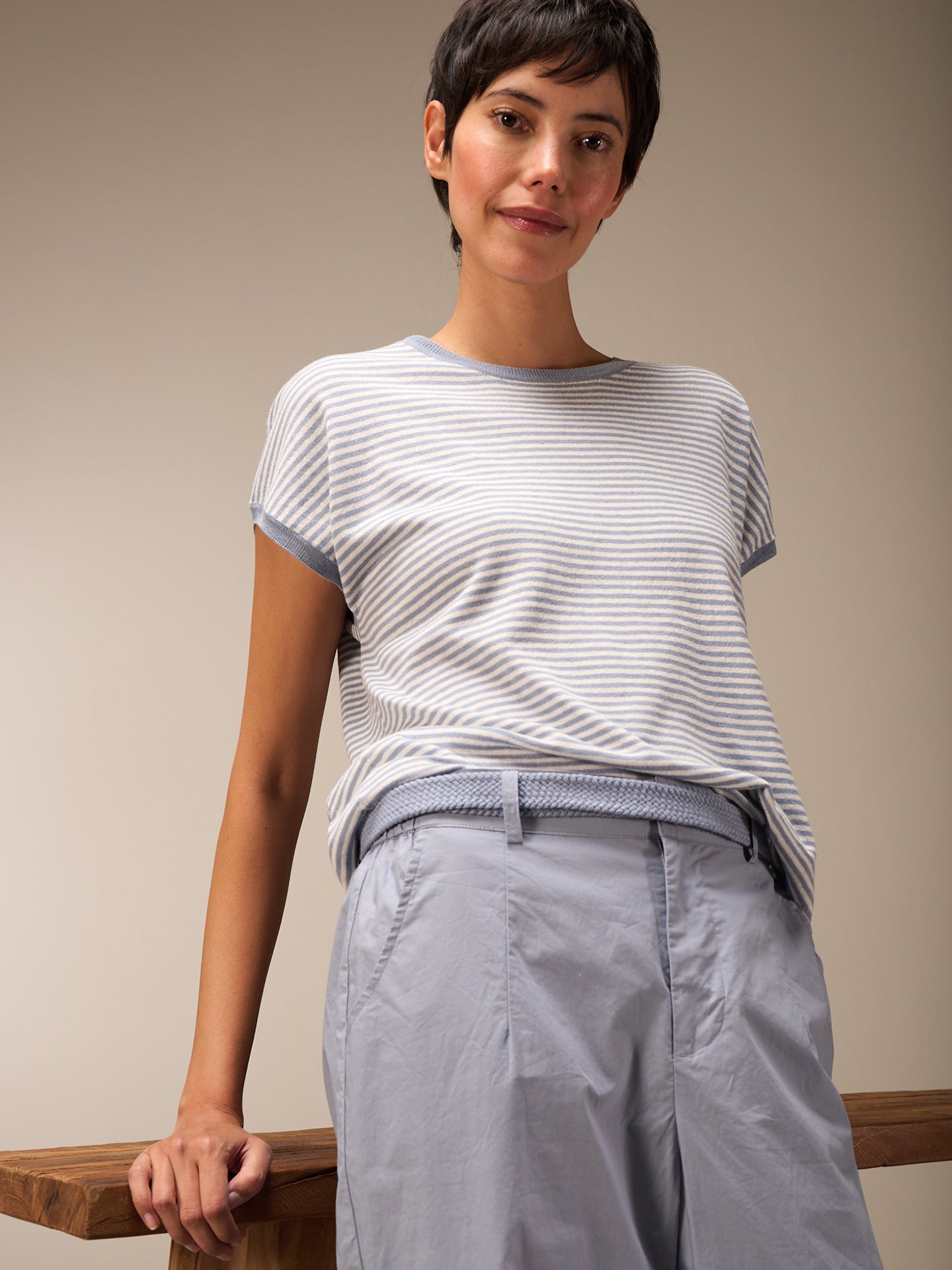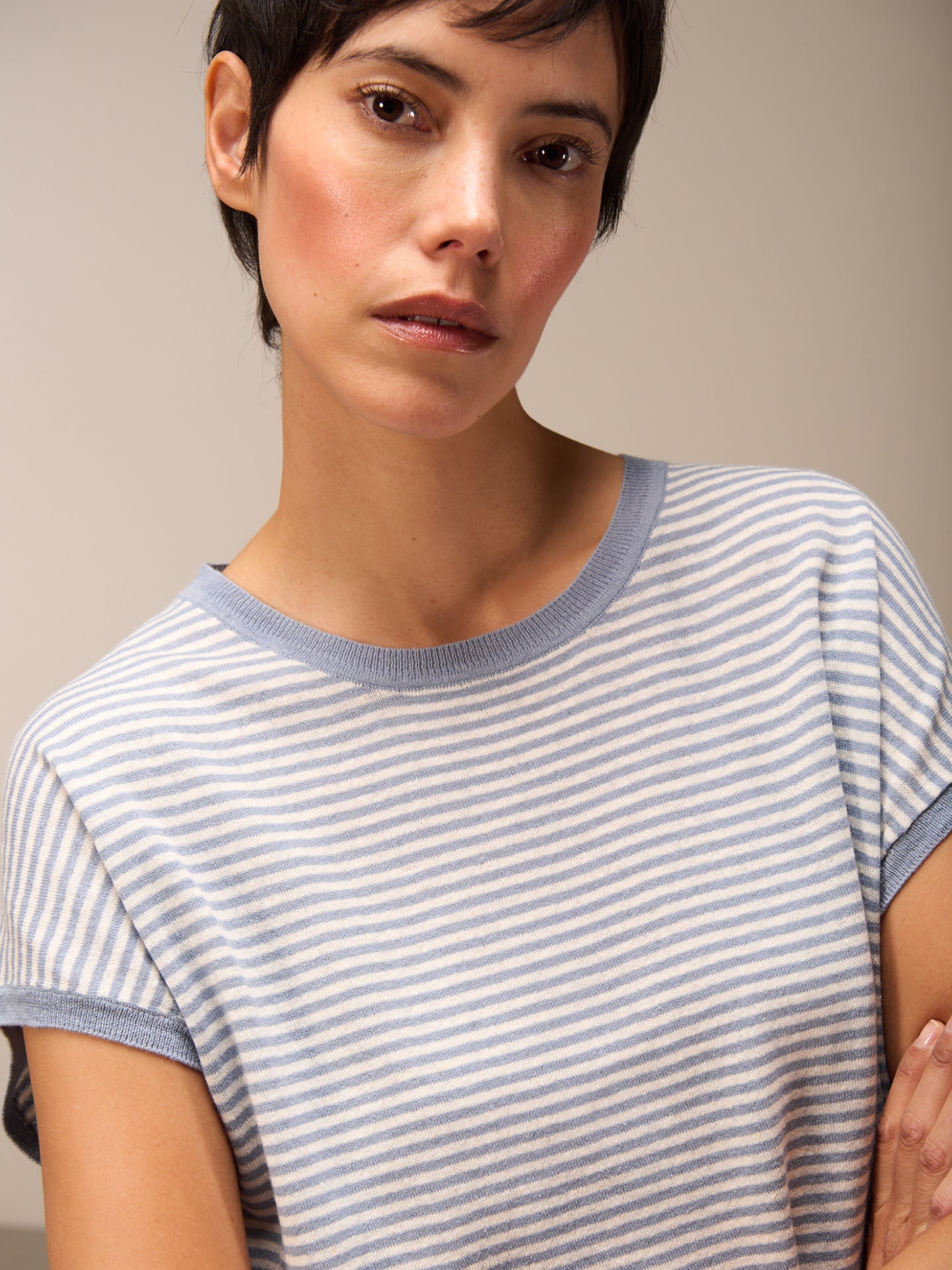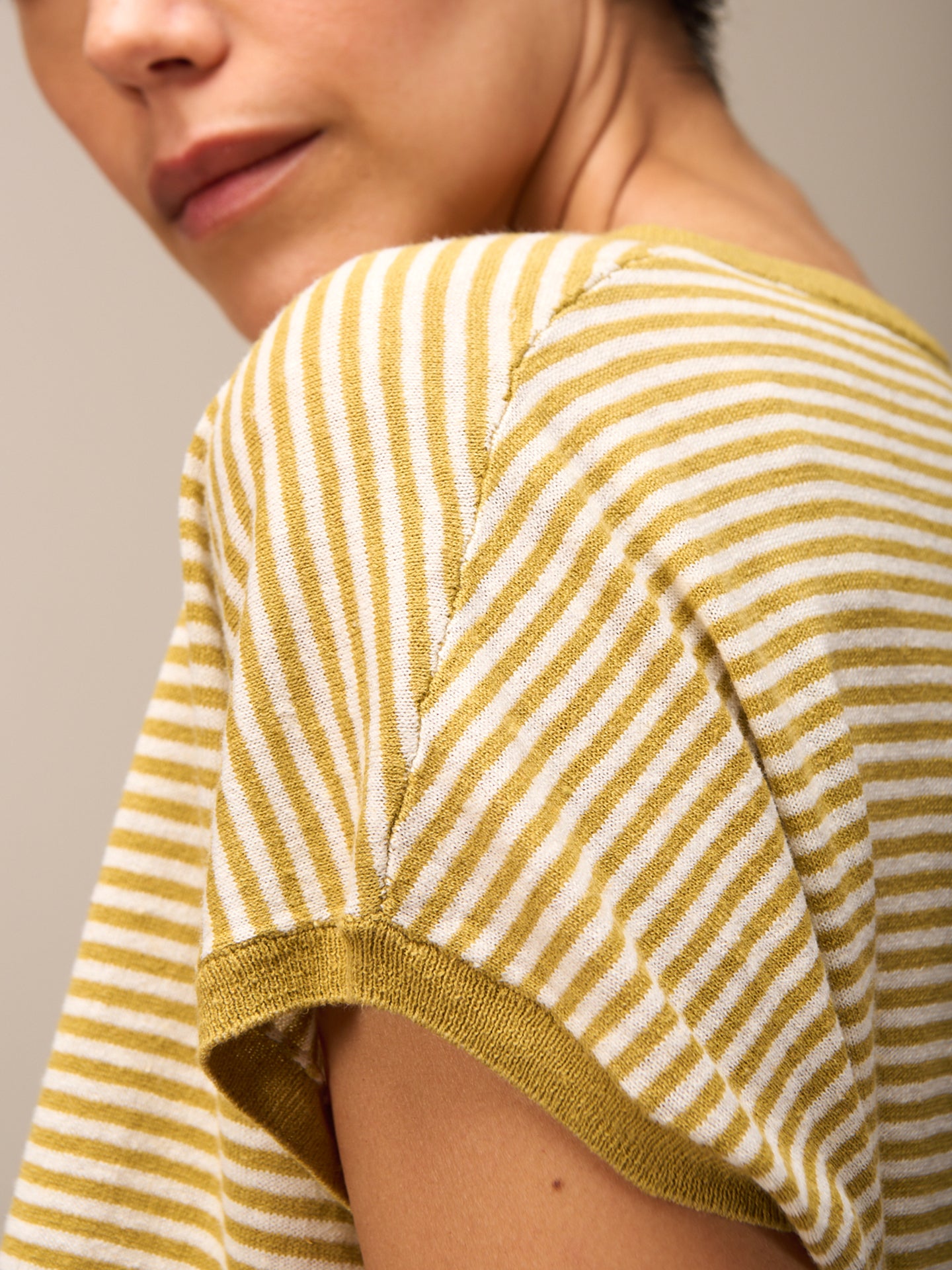 Maglione senza maniche con motivo a maglia rasata, spalle scese, scollo rotondo e speciale bordo a costine sull'orlo e sul giromanica. Le righe conferiscono al maglione un tocco sportivo e casual.