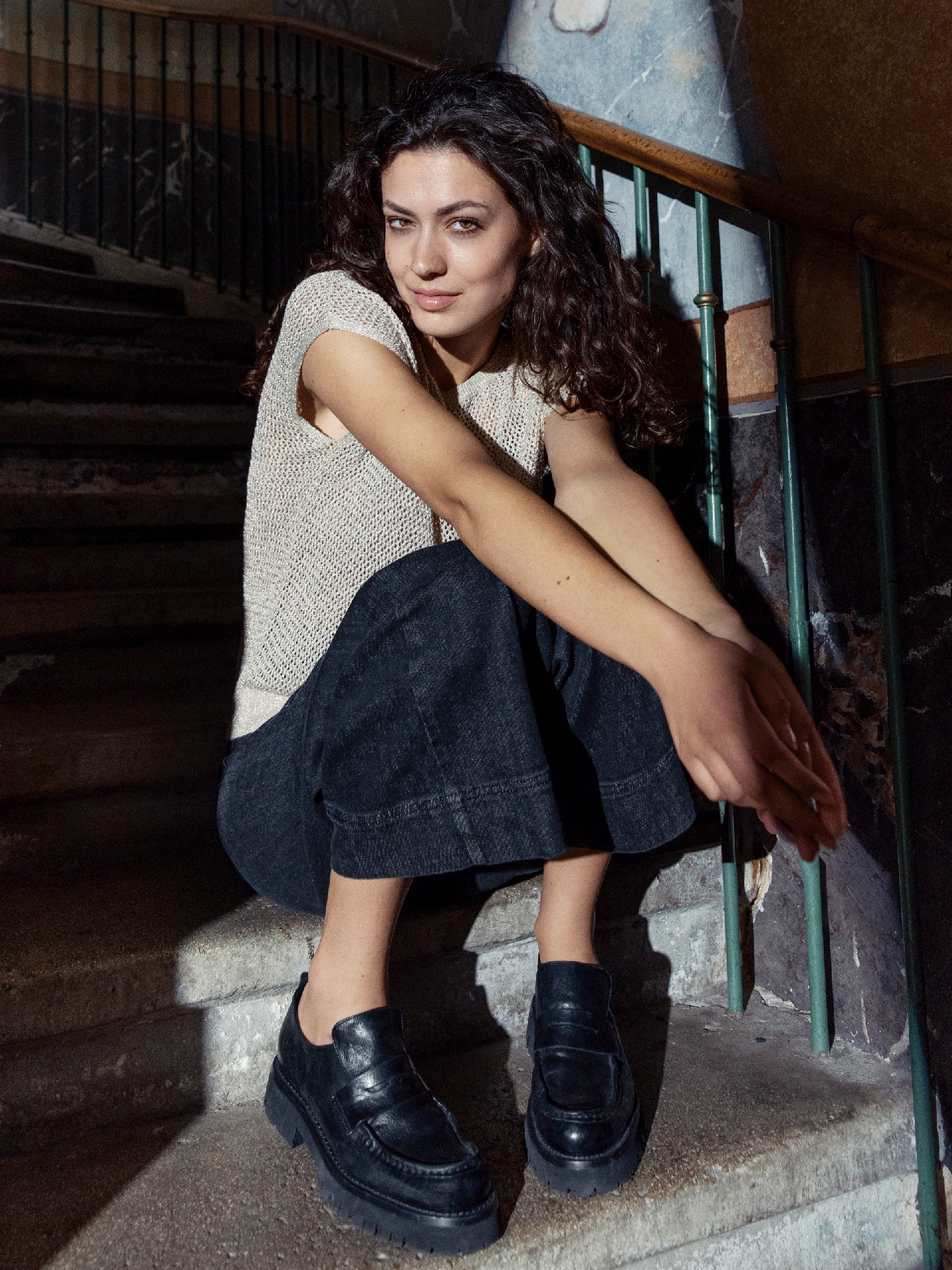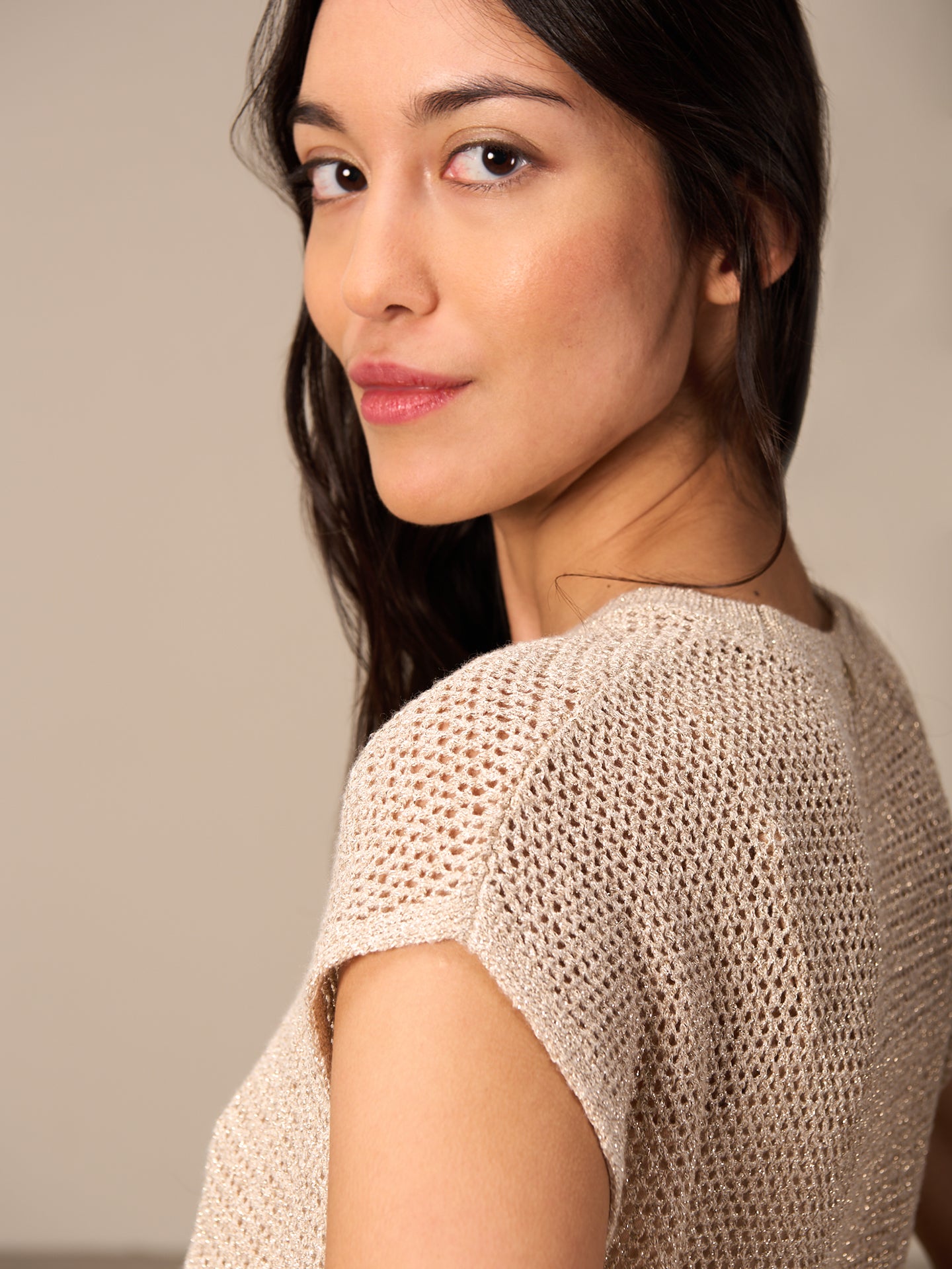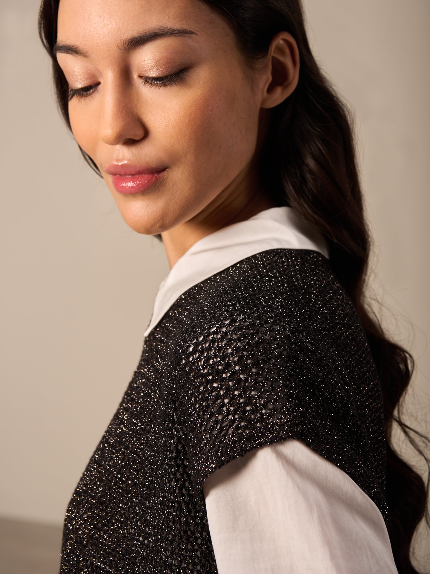Maglia dritta senza maniche in filato lurex metallizzato e viscosa. Un compagno decorativo per i giorni di festa.