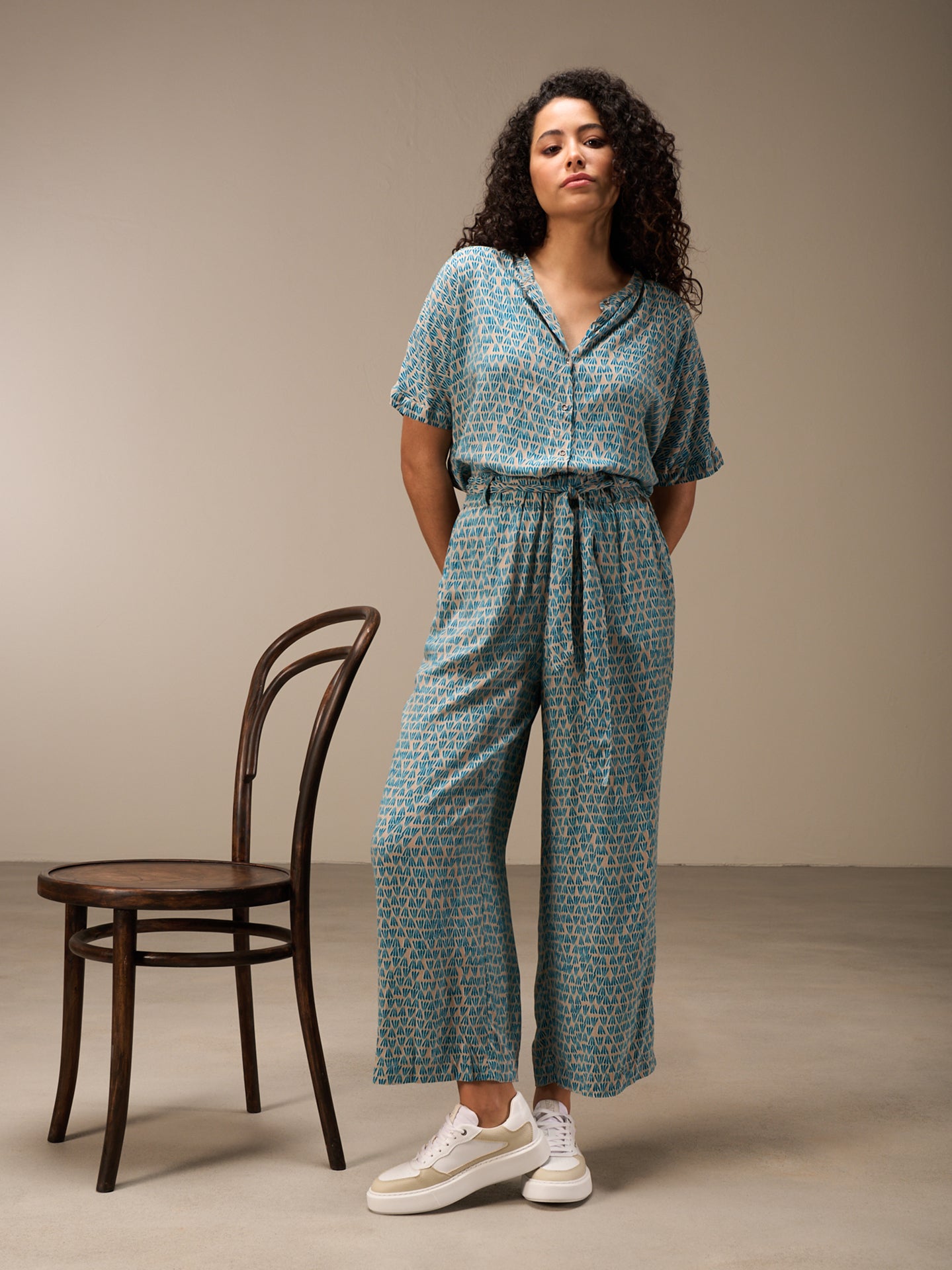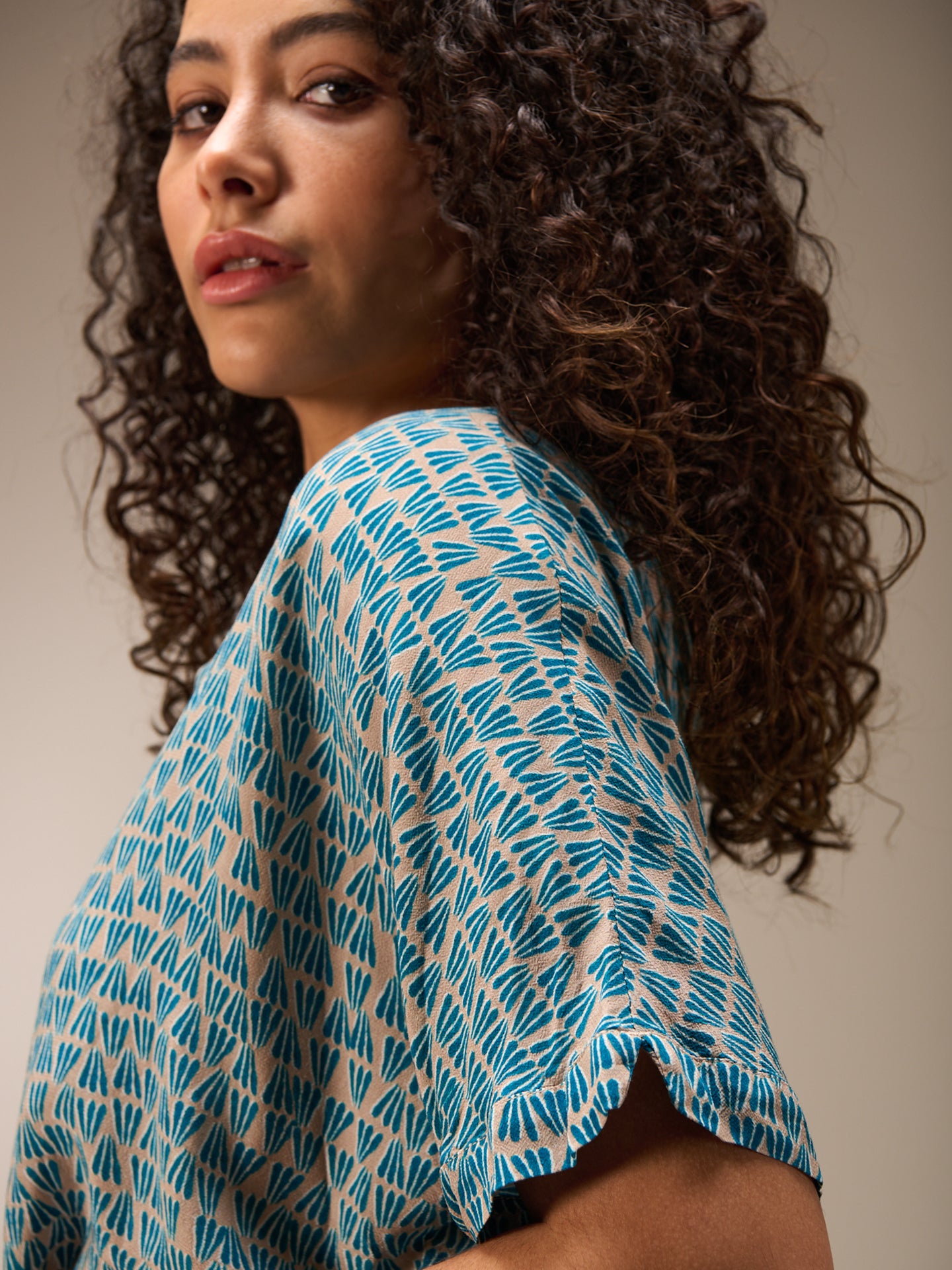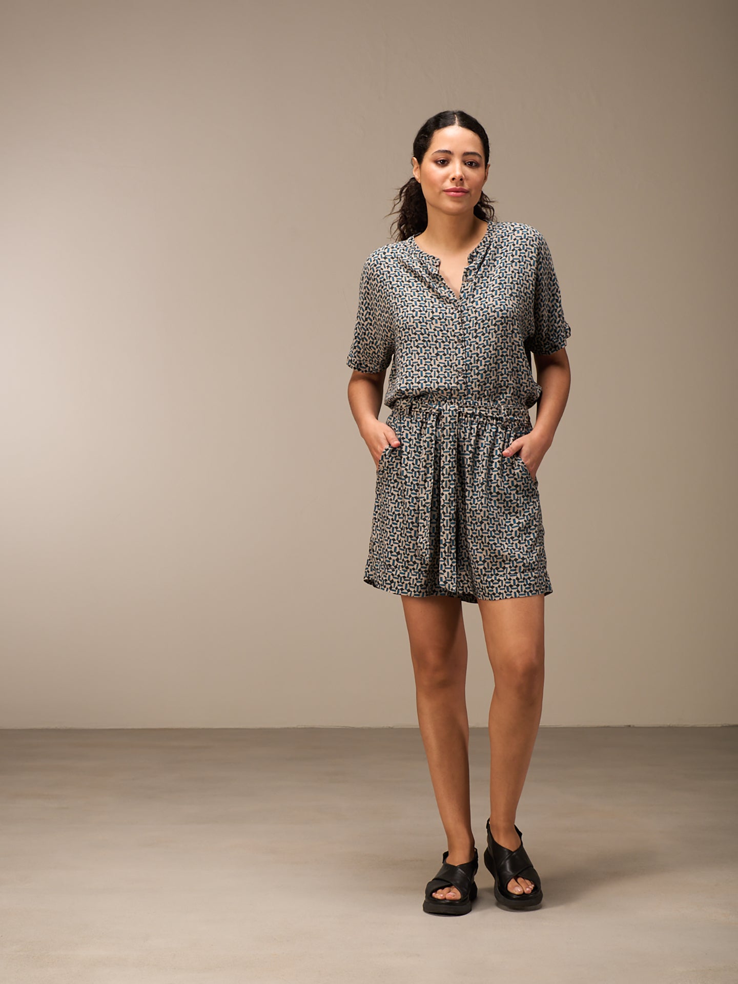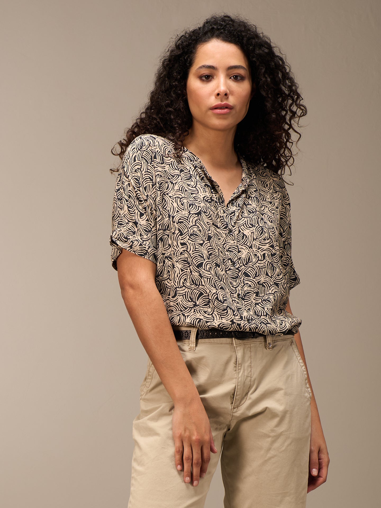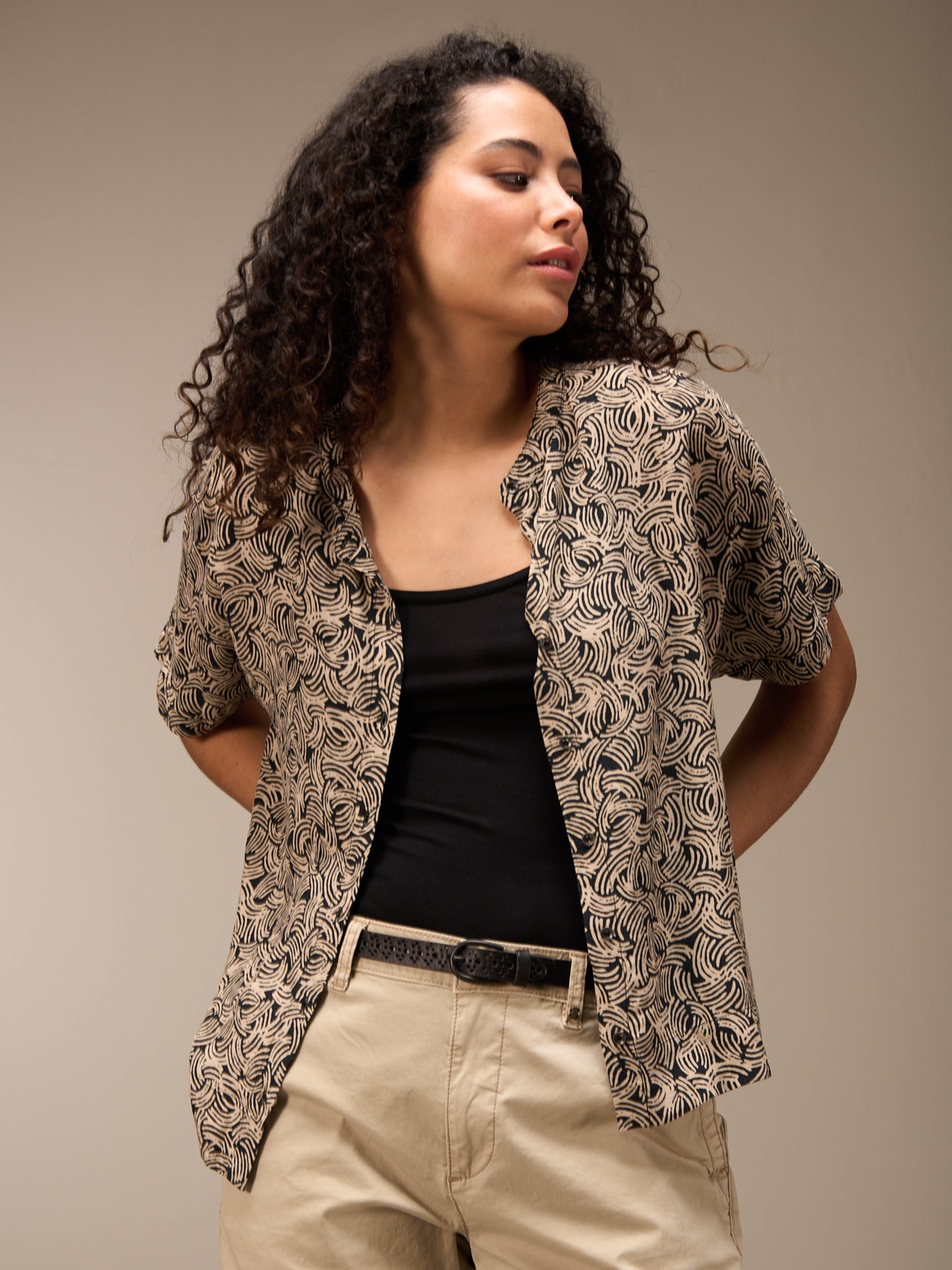 Lässige durchgeknöpfte Kurzarmbluse in verkürzter, kastiger Form und handgezeichnetem Alloverprint.