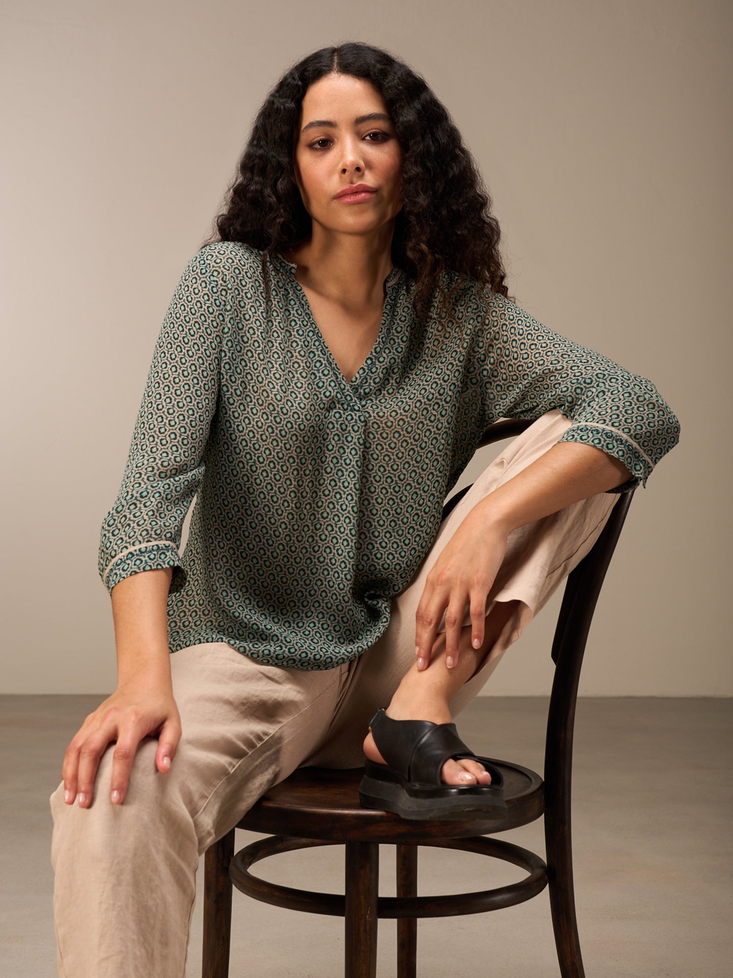 Gerade geschnittene Bluse mit 3/4-Ärmeln, femininem V-Ausschnitt und handgezeichnetem Alloverprint.