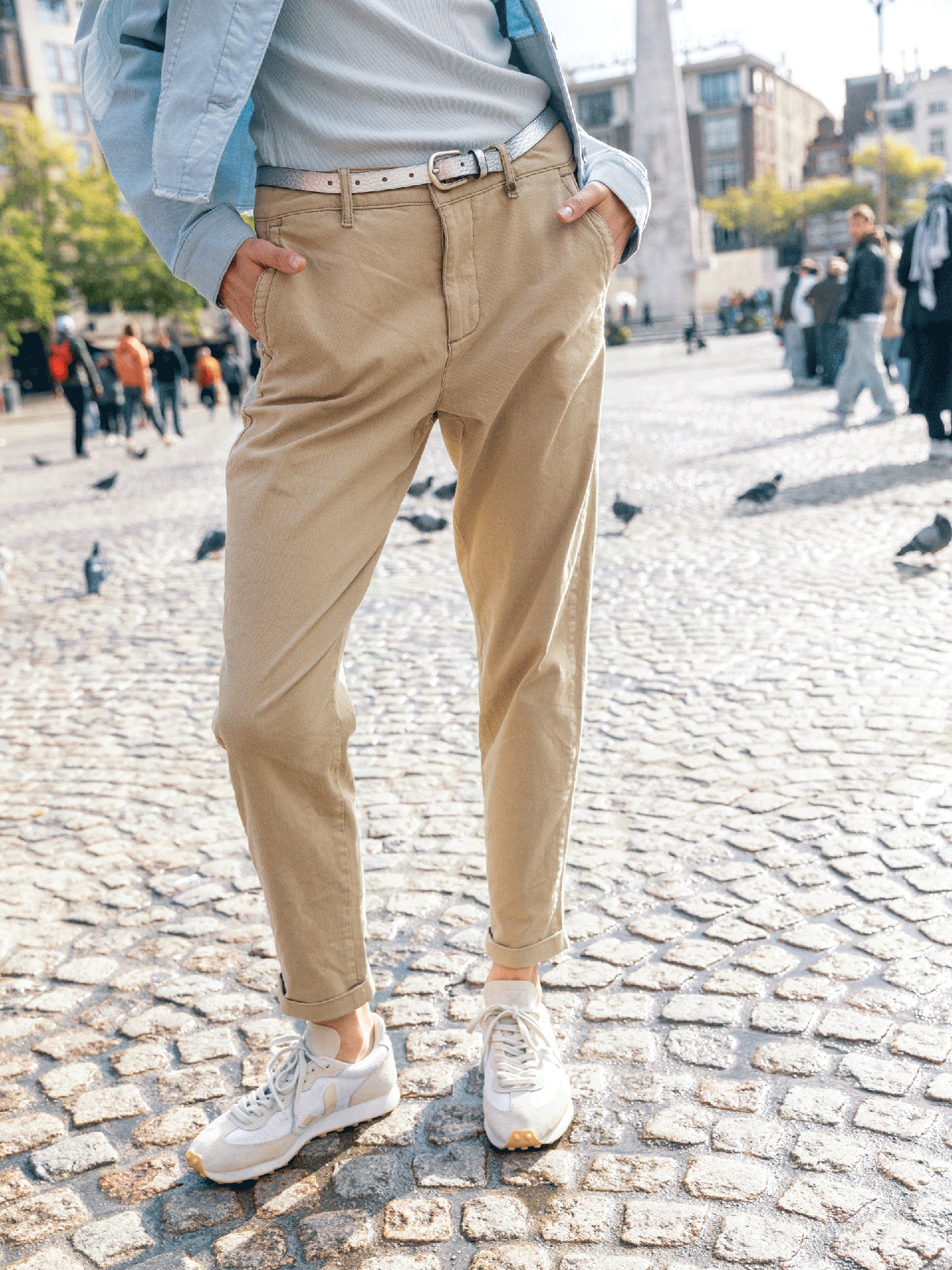 Locker sitzende Hose mit anliegendem Bein, mittelhohem Bund mit Gürtelschlaufen, Reisverschluss und seitlichen Eingrifftaschen. Der elastische Stoff mit feiner Struktur ist aus 98% Bio-Baumwolle aus zertifiziertem Anbau und 2% Elasthan.