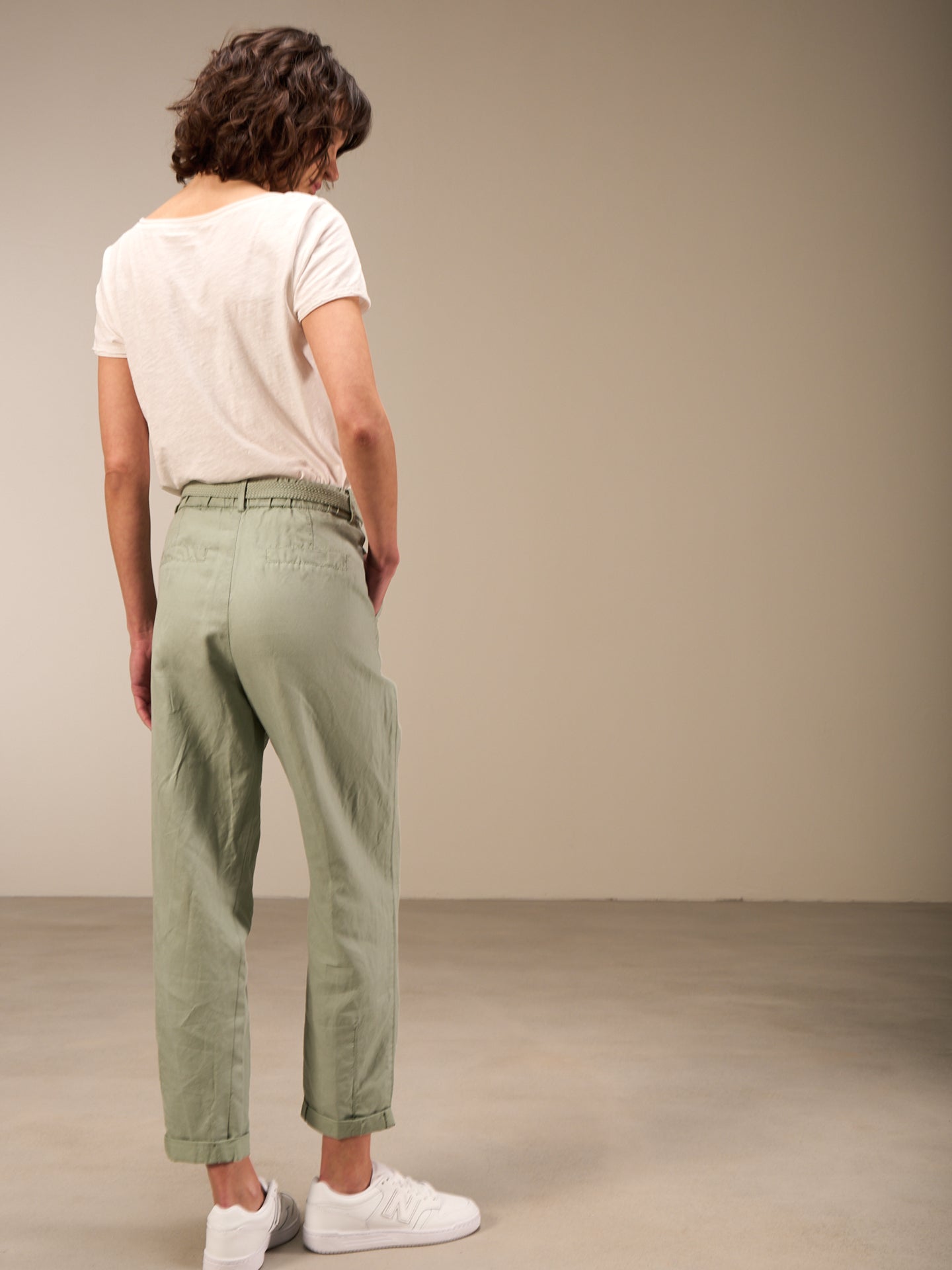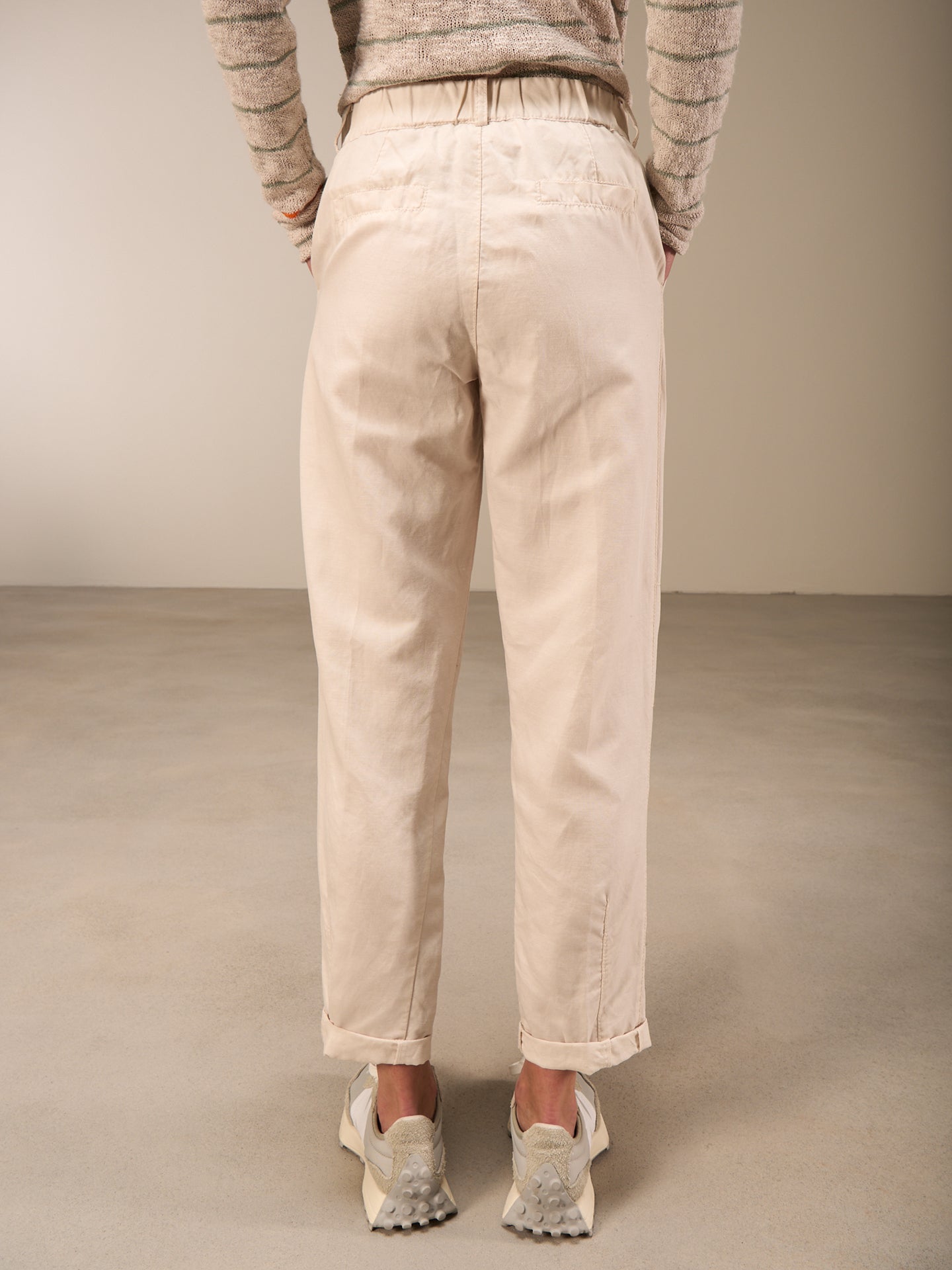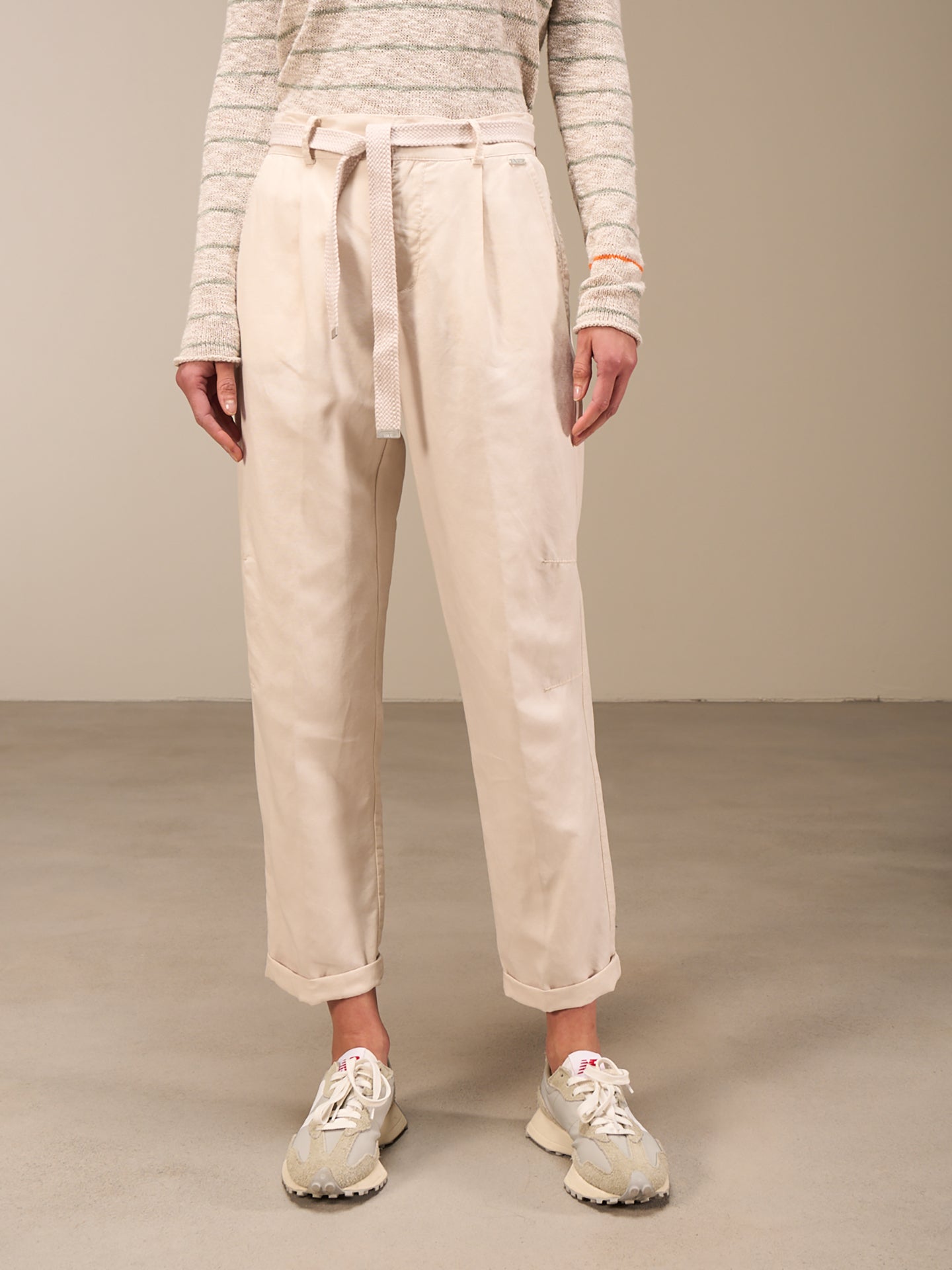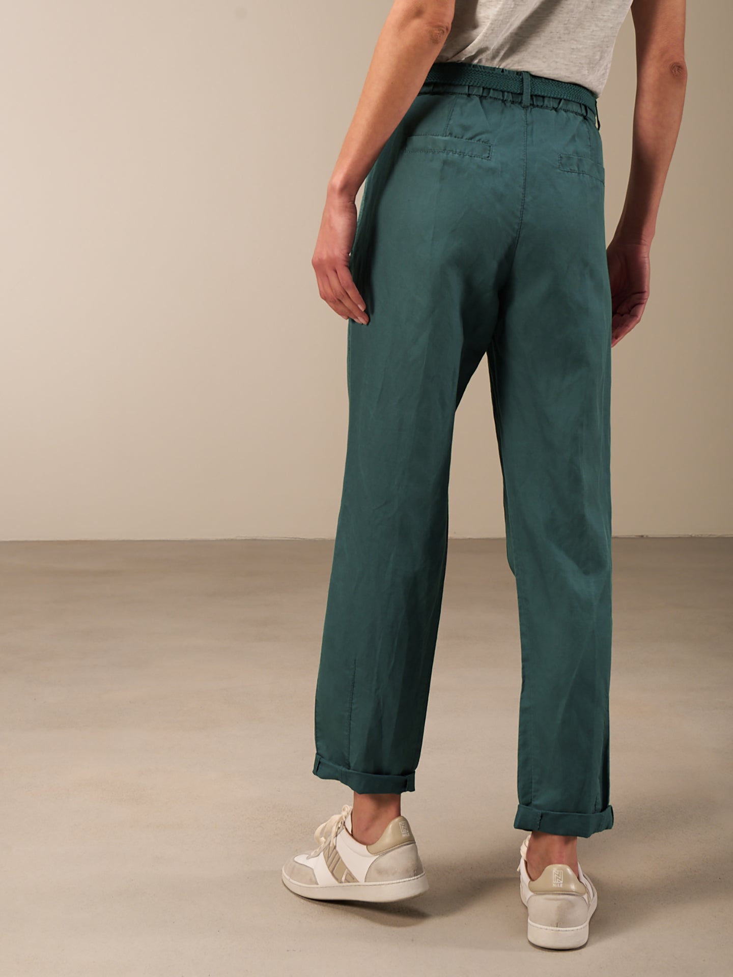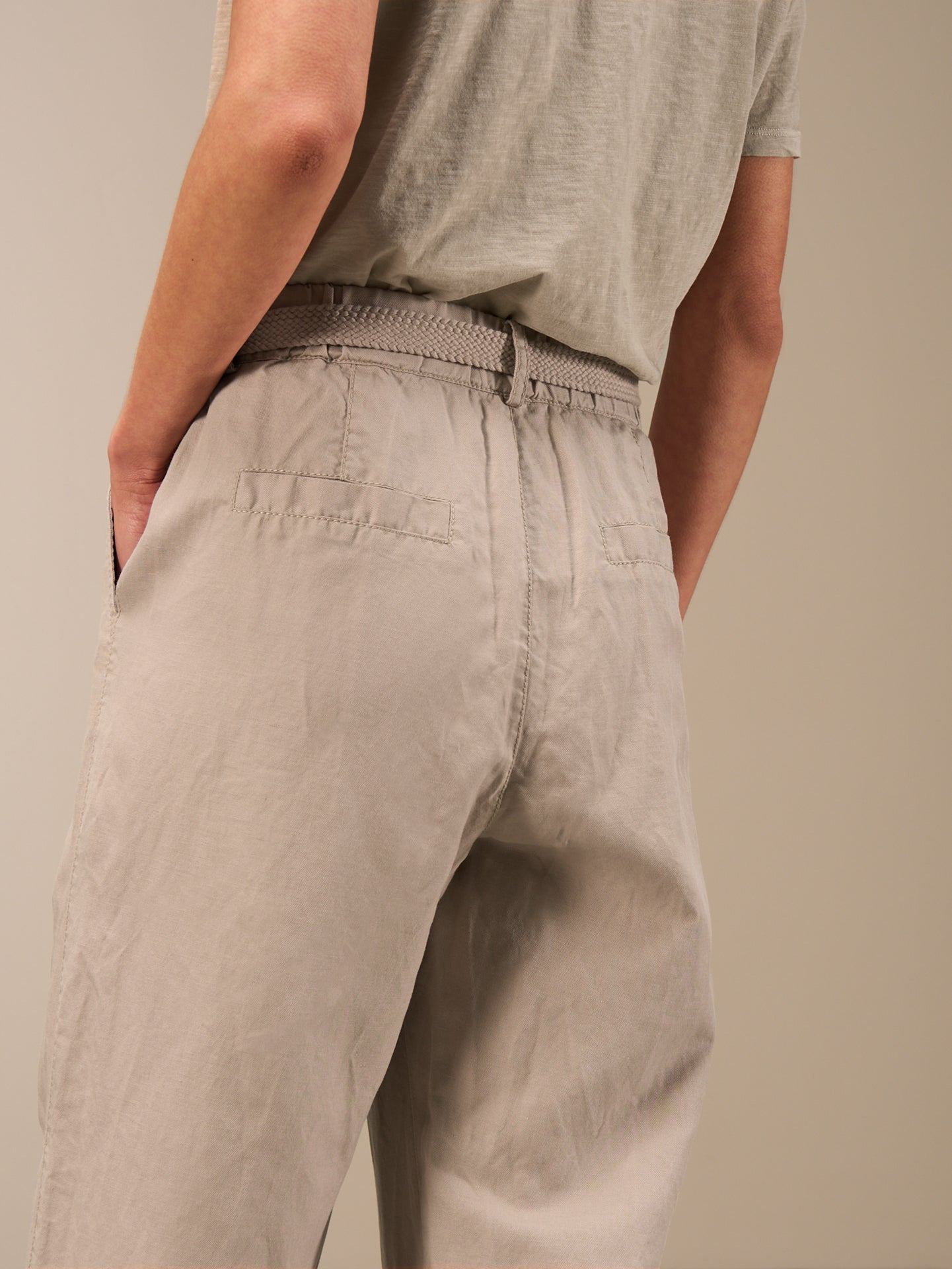 Lässige Hose mit Elastikbund hinten für eine bequeme Passform. Der Stoffgürtel und die seitlichen Abnäher runden den edlen Look ab.