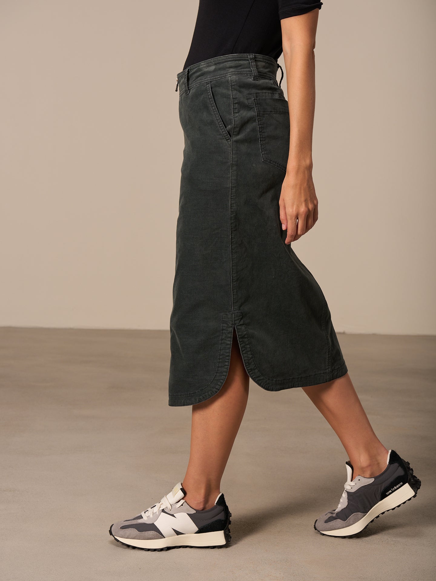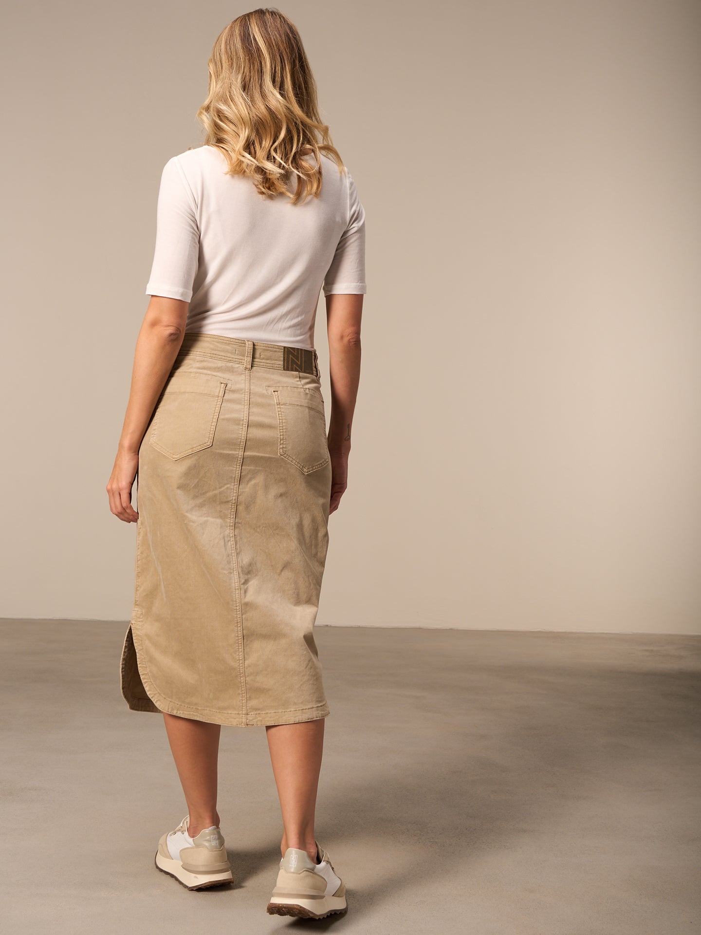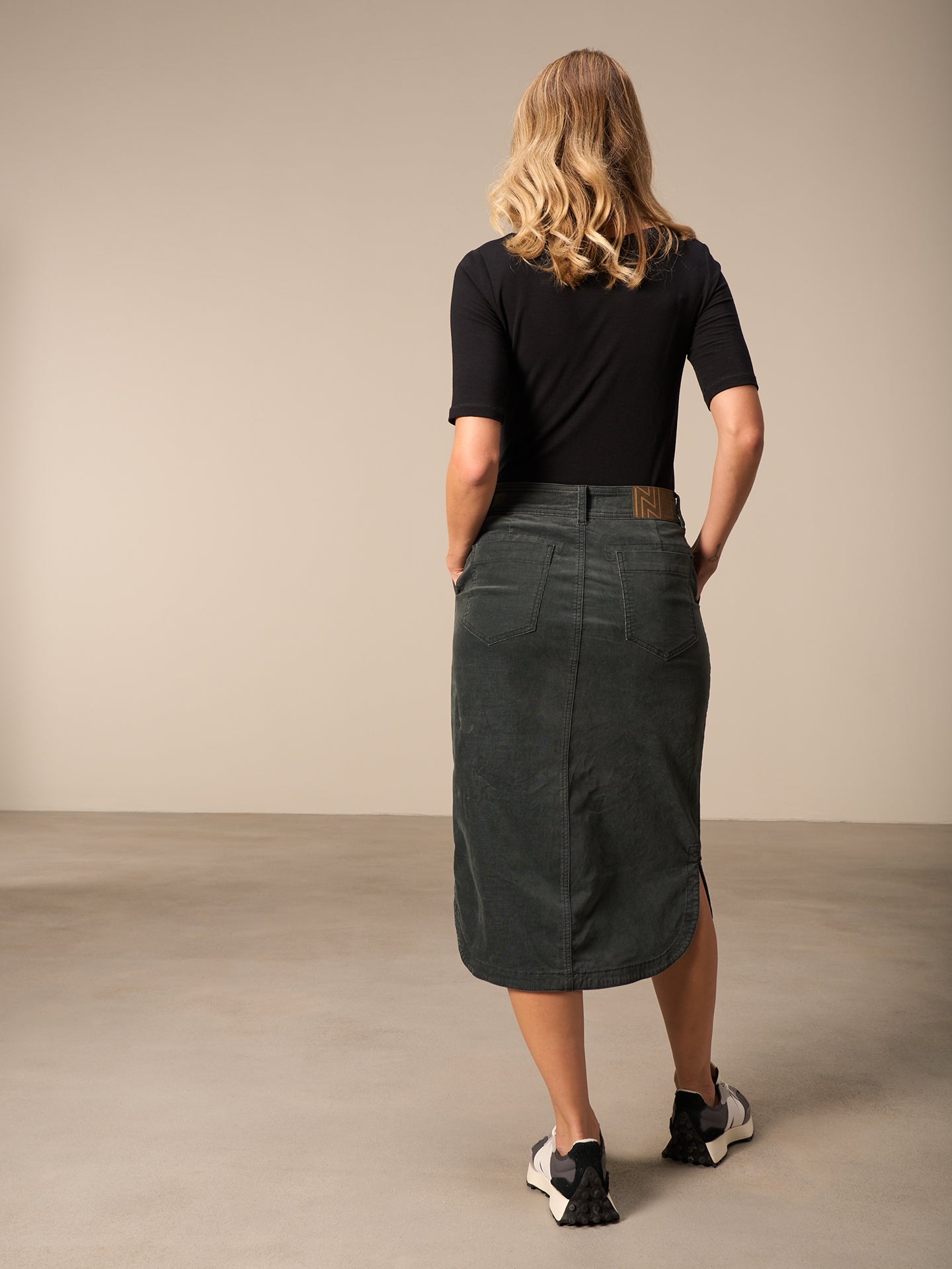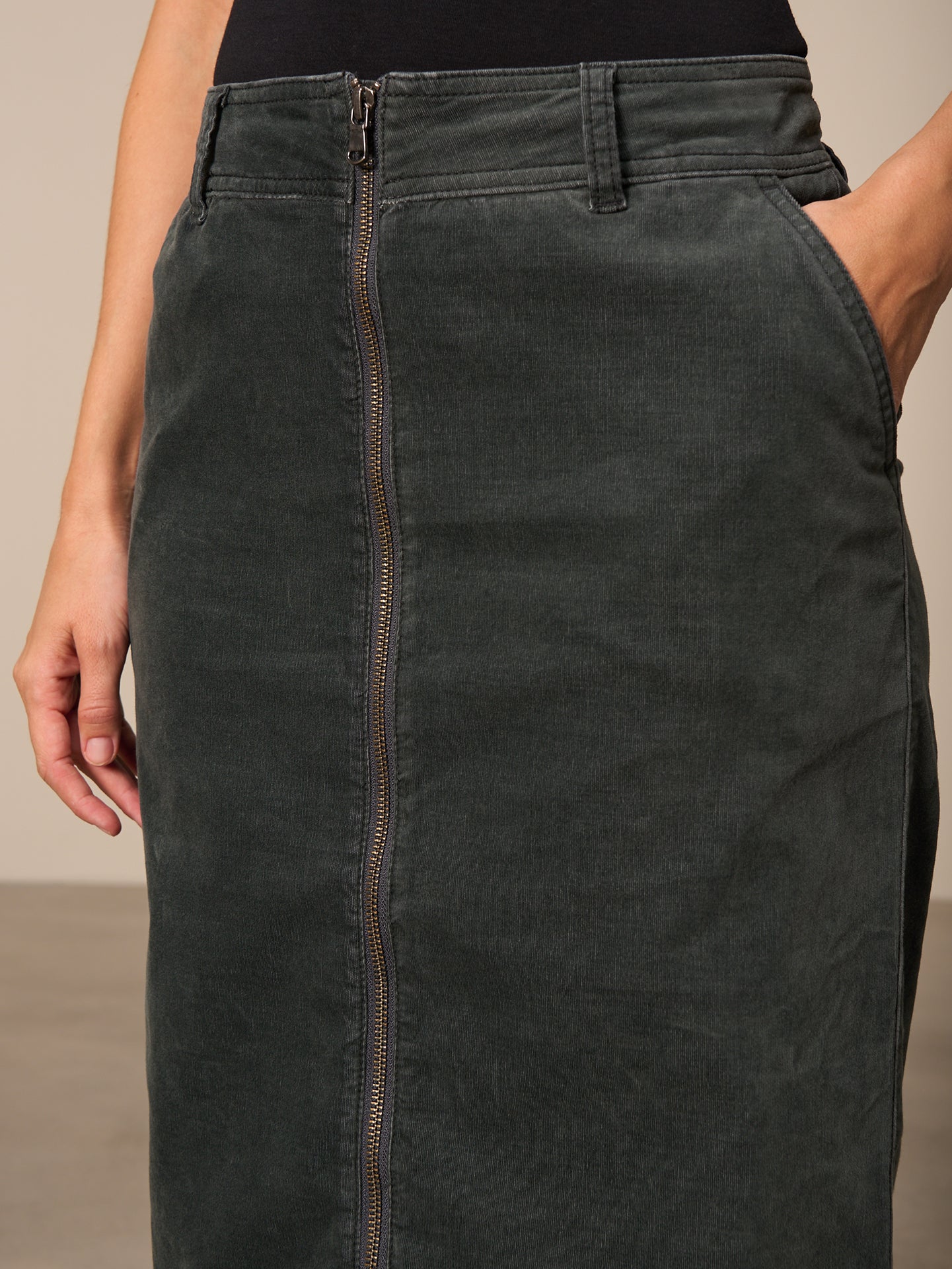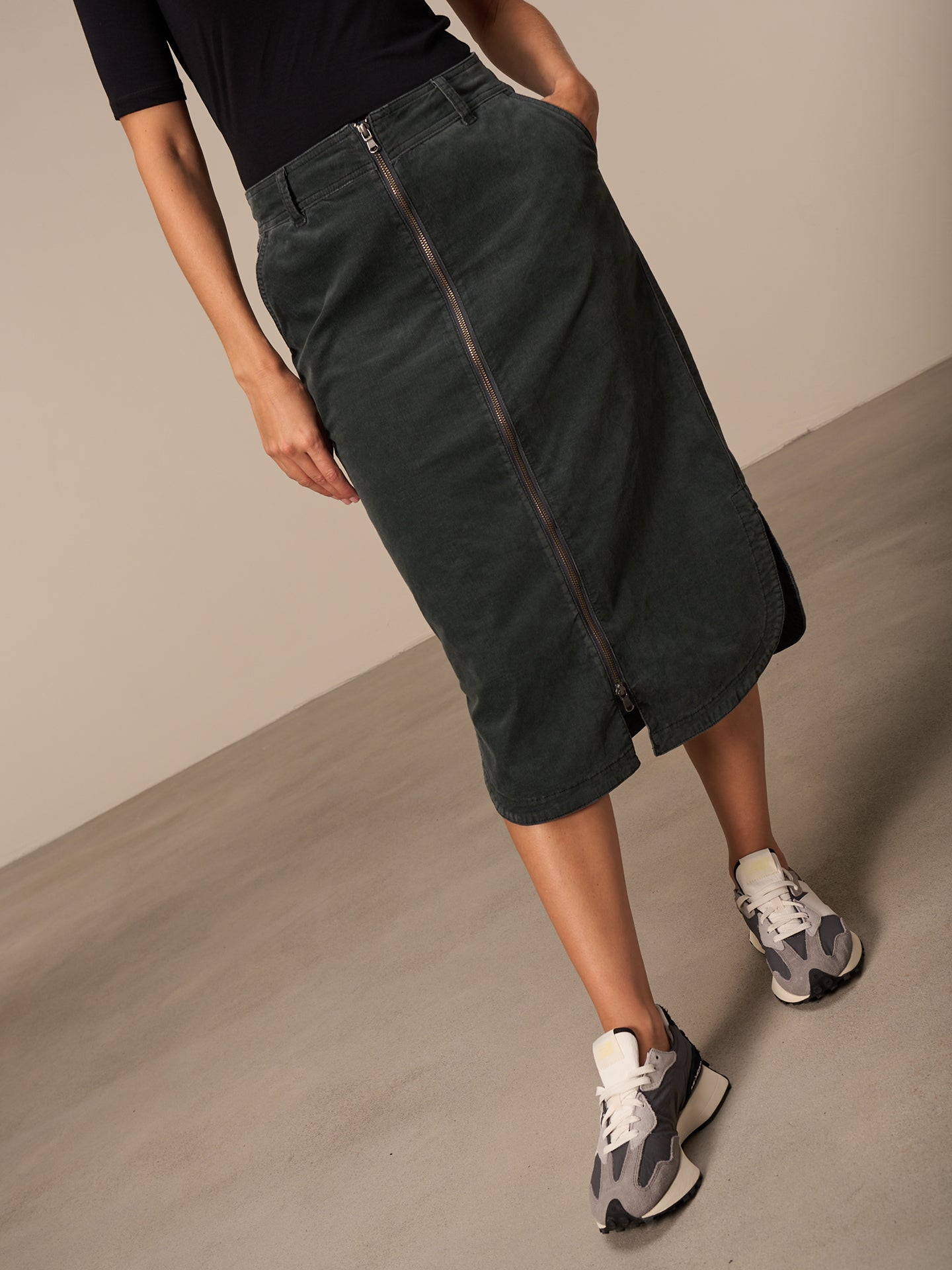 Stückgefärbter Midi-Jupe in feinrippigem Cord mit stylischem Doppelreissverschluss auf der Vorderseite. Materialmix mit Bio Baumwolle aus zertifiziertem Anbau und recyceltem Polyester in sehr angenehm strechiger Babycord-Qualität.