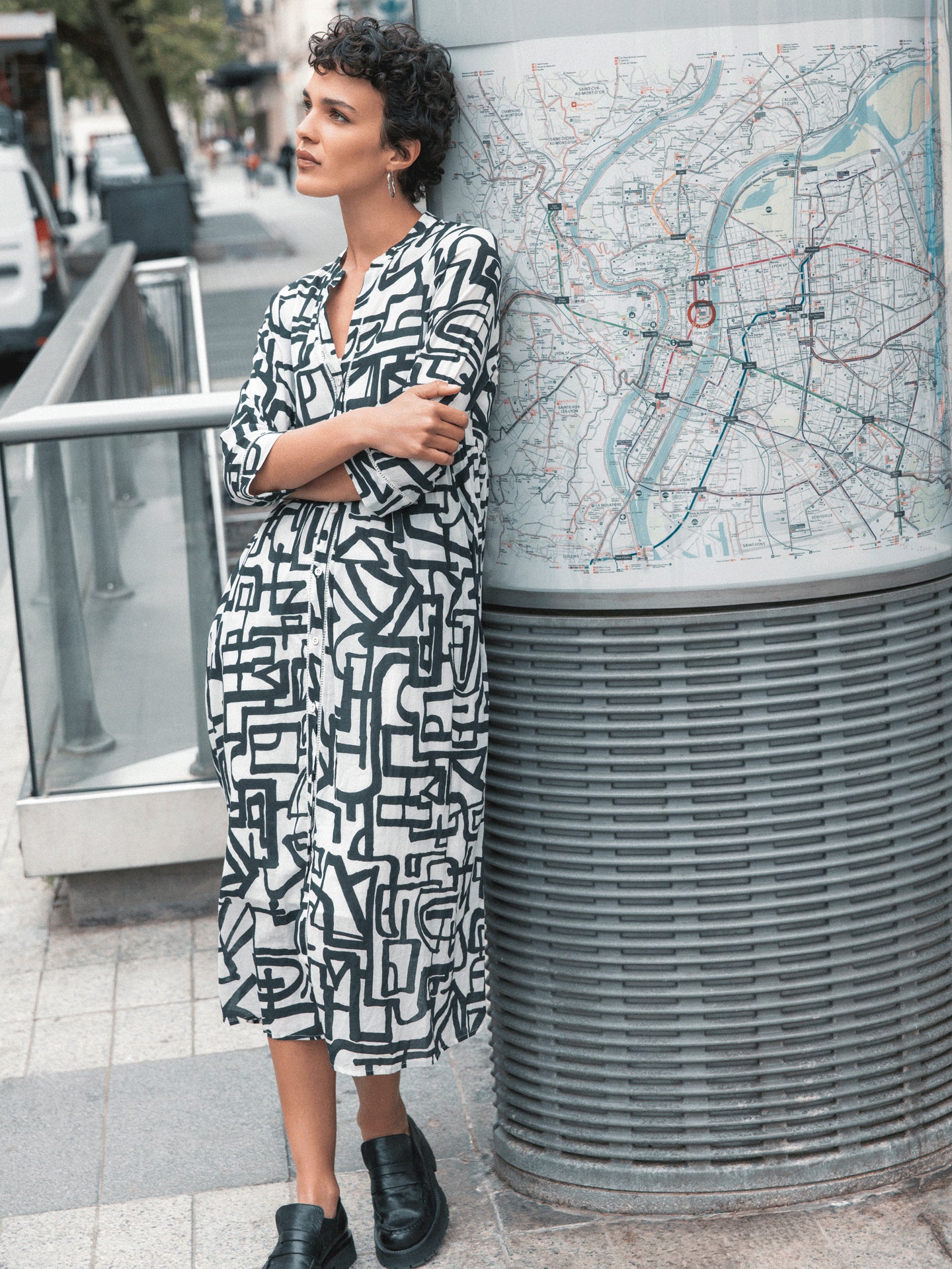 Durchgeknöpftes, feminines Kleid in Midilänge in graphischem Alloverprint, kleinem Stehkragen und einem separaten Unterkleid. 100% Bio-Baumwolle aus zertifiziertem Anbau.