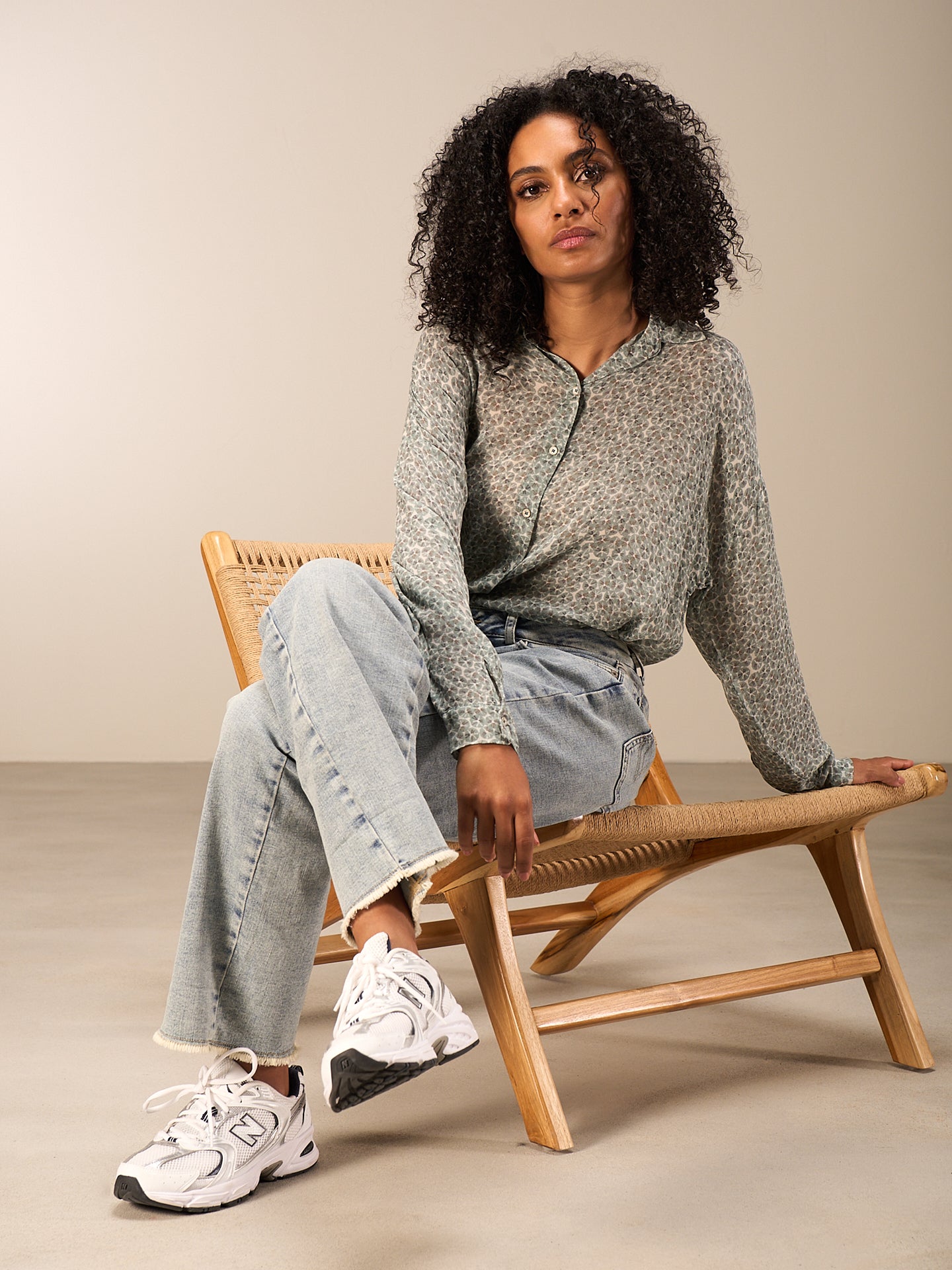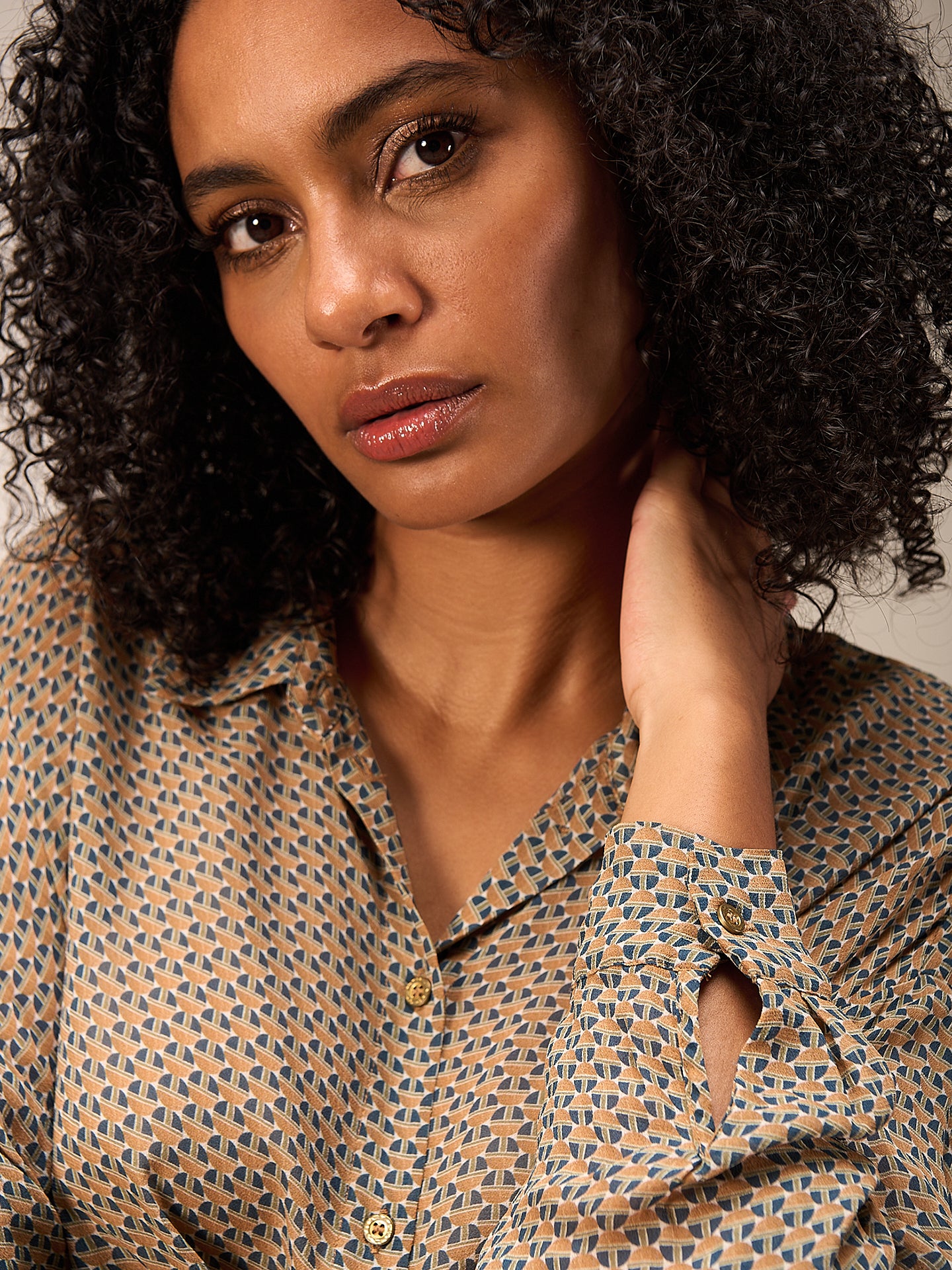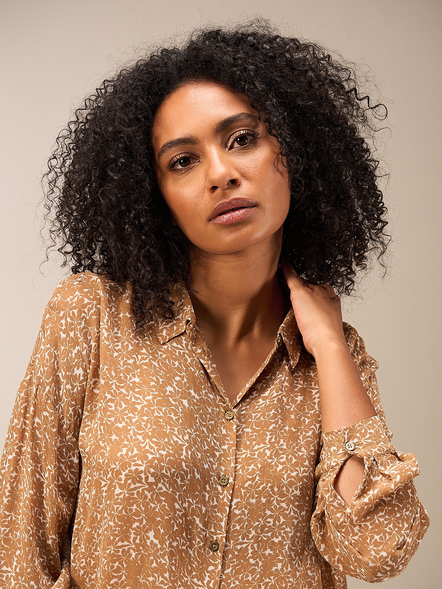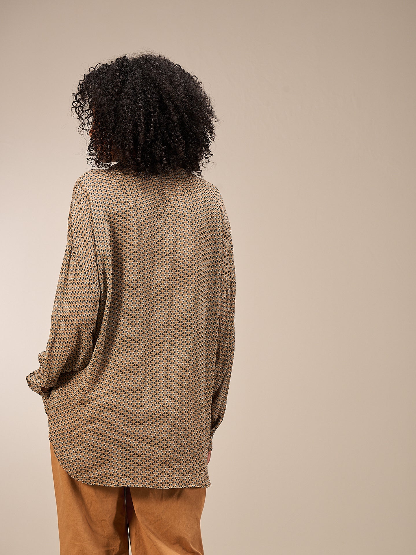 Durchgeknöpfte Hemdbluse in gerade geschnittener Passform und überschnittenen Schultern. Die langen Ärmel sind mit einem Knopf an der Manschette versehen. Der passende handgezeichnete Alloverprint runden den Look der Bluse ab. Aus 100% Eco Viskose, die aus nachhaltiger Holzwirtschaft gewonnen wird.