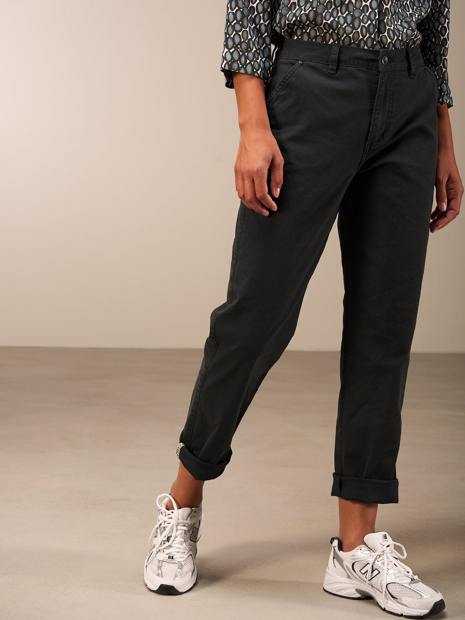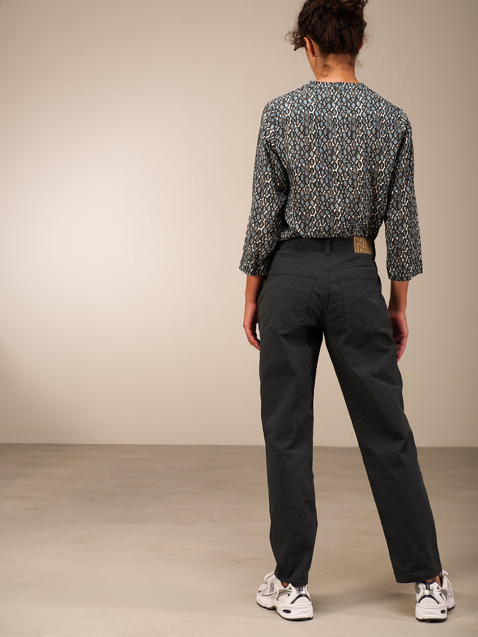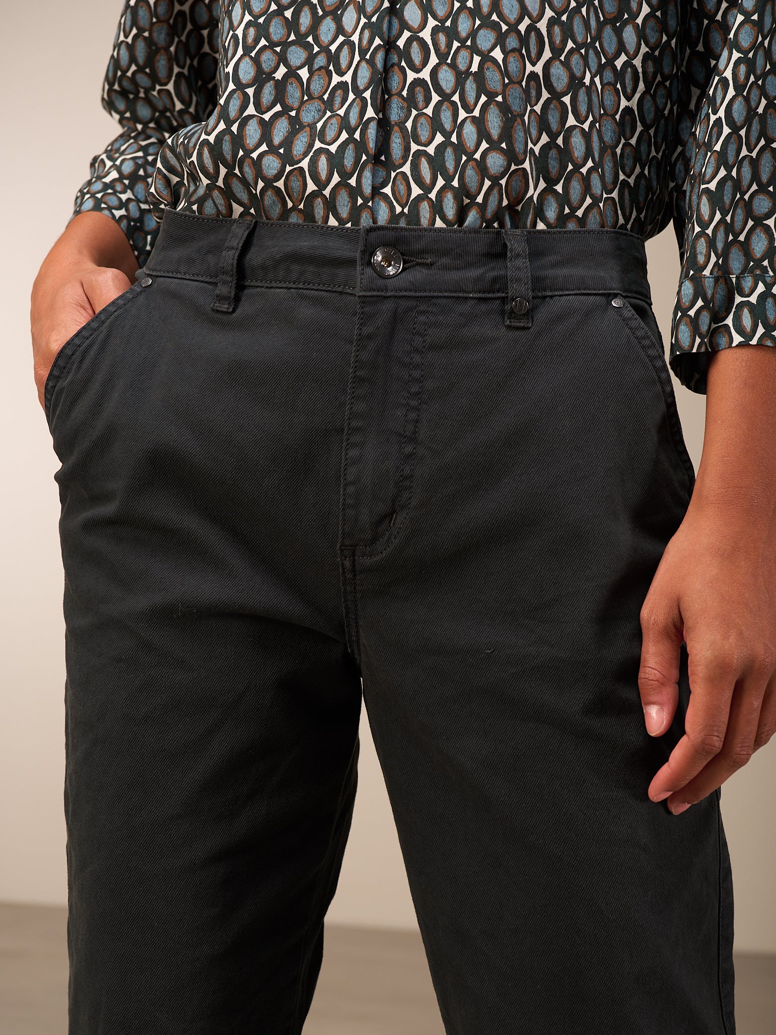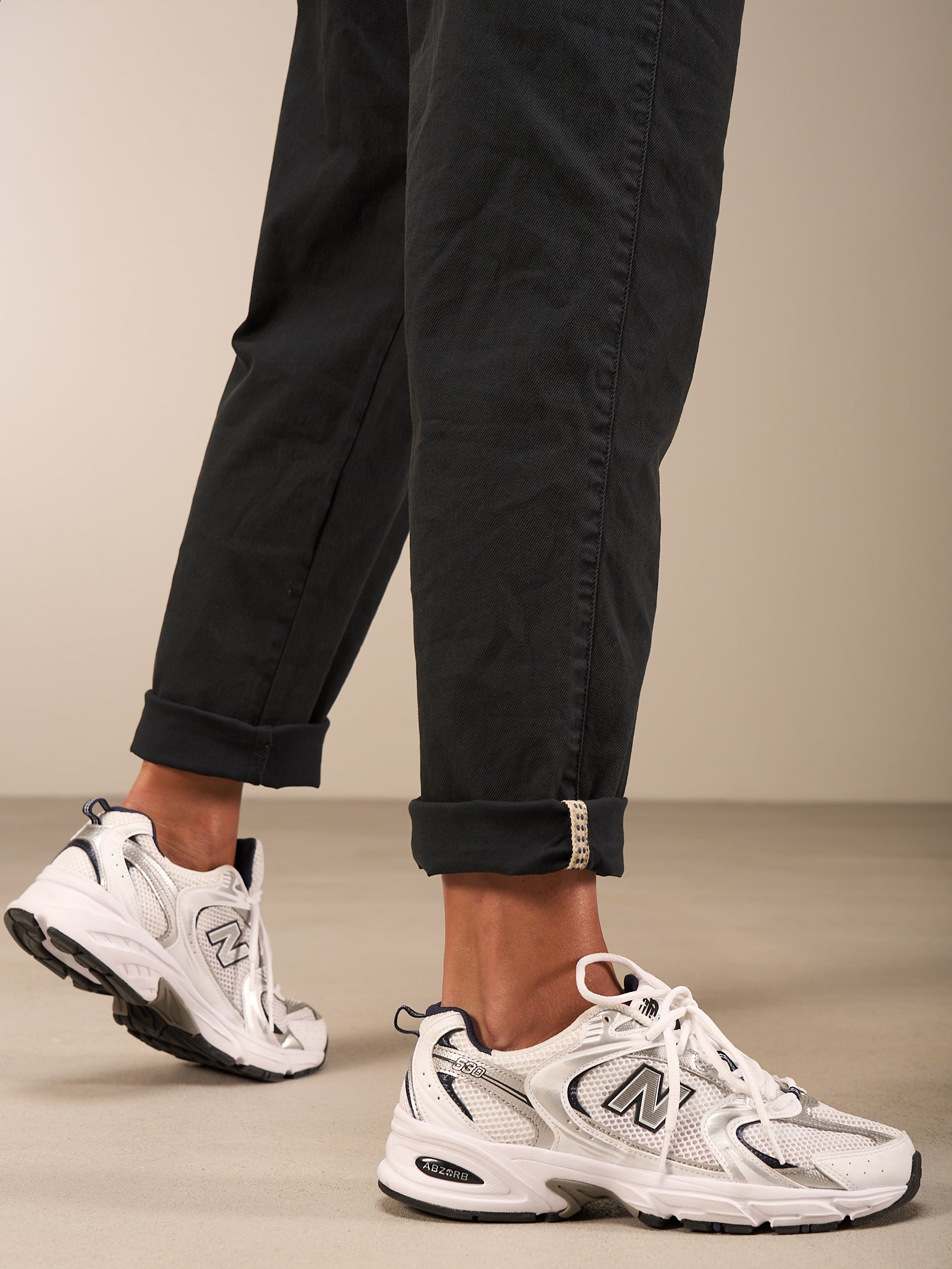 Locker sitzende Hose mit mittelhohem Bund in leichter O-Shape-Form. Die Hosenbeine sind gekrempelt und Dekobänder am Umschlag werten die Hose in der feinen Struktur zusätzlich auf. Unregelmässigkeiten in der Farbe und ein verstärkter Ausbleicheffekt sind gewollt und machen das Stück einzigartig. Das Produkt kann auf Kleidung und Oberflächen abfärben.