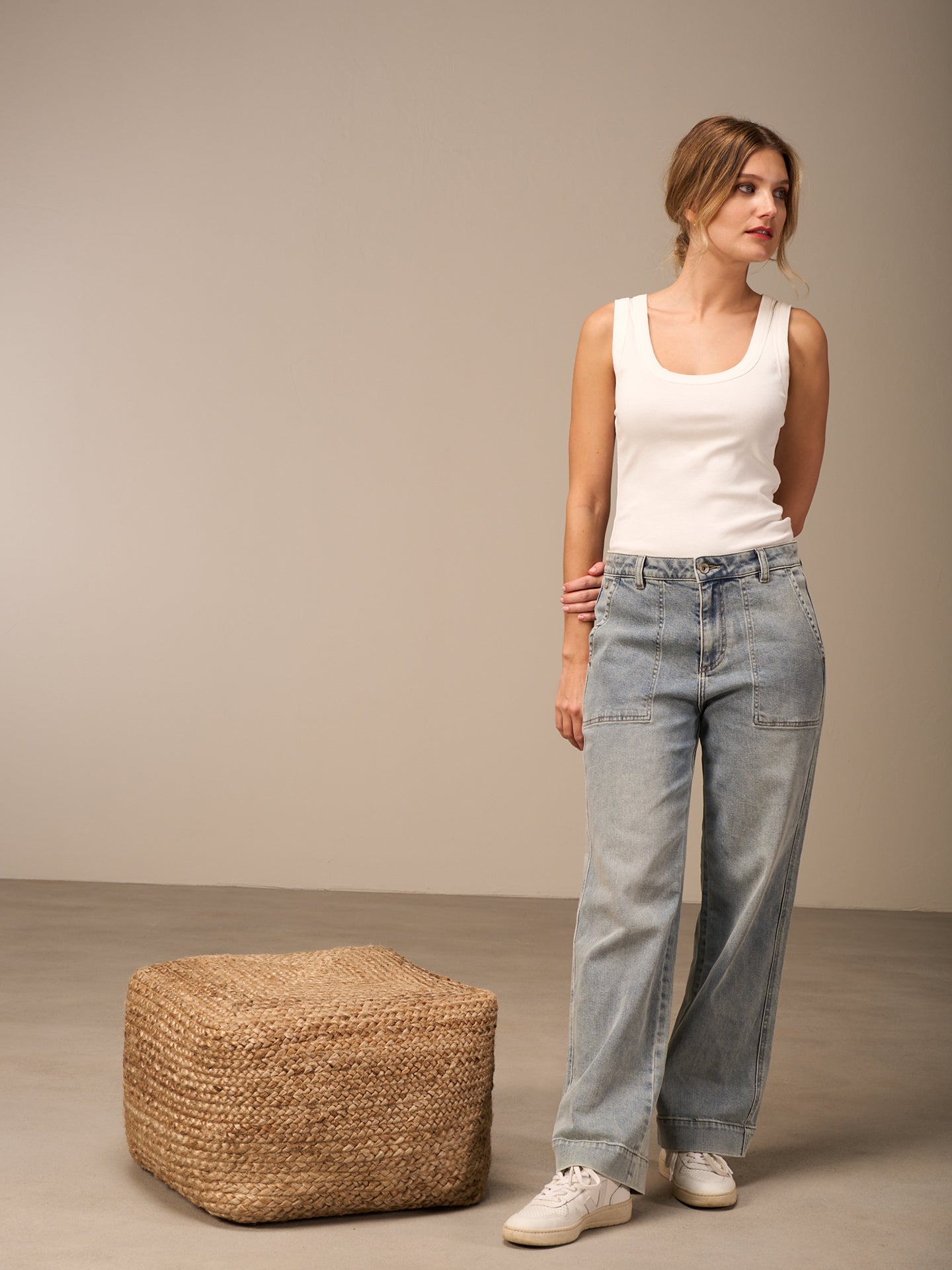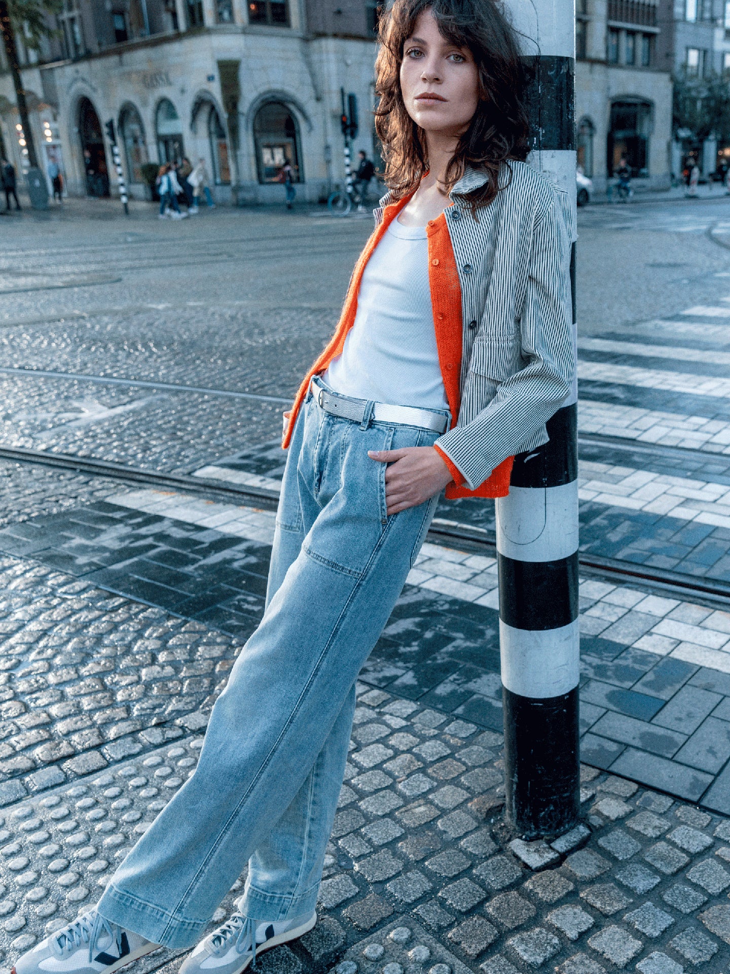 Locker sitzende Hose mit gerade geschnittenem Bein und grossen abgesteppten Taschen. Die Hosenbeine sind mit einem breiten Saumumschlag versehen. Ein fester Denim aus 99% Bio-Baumwolle aus zertifiziertem Anbau. Die leichte Dehnbarkeit und die klassischen Demin Waschungen vereinen Style und Tragekomfort. Unregelmässigkeiten in der Farbe und ein verstärkter Ausbleicheffekt sind gewollt und machen das Stück einzigartig. Das Produkt kann auf Kleidung und Oberflächen abfärben.