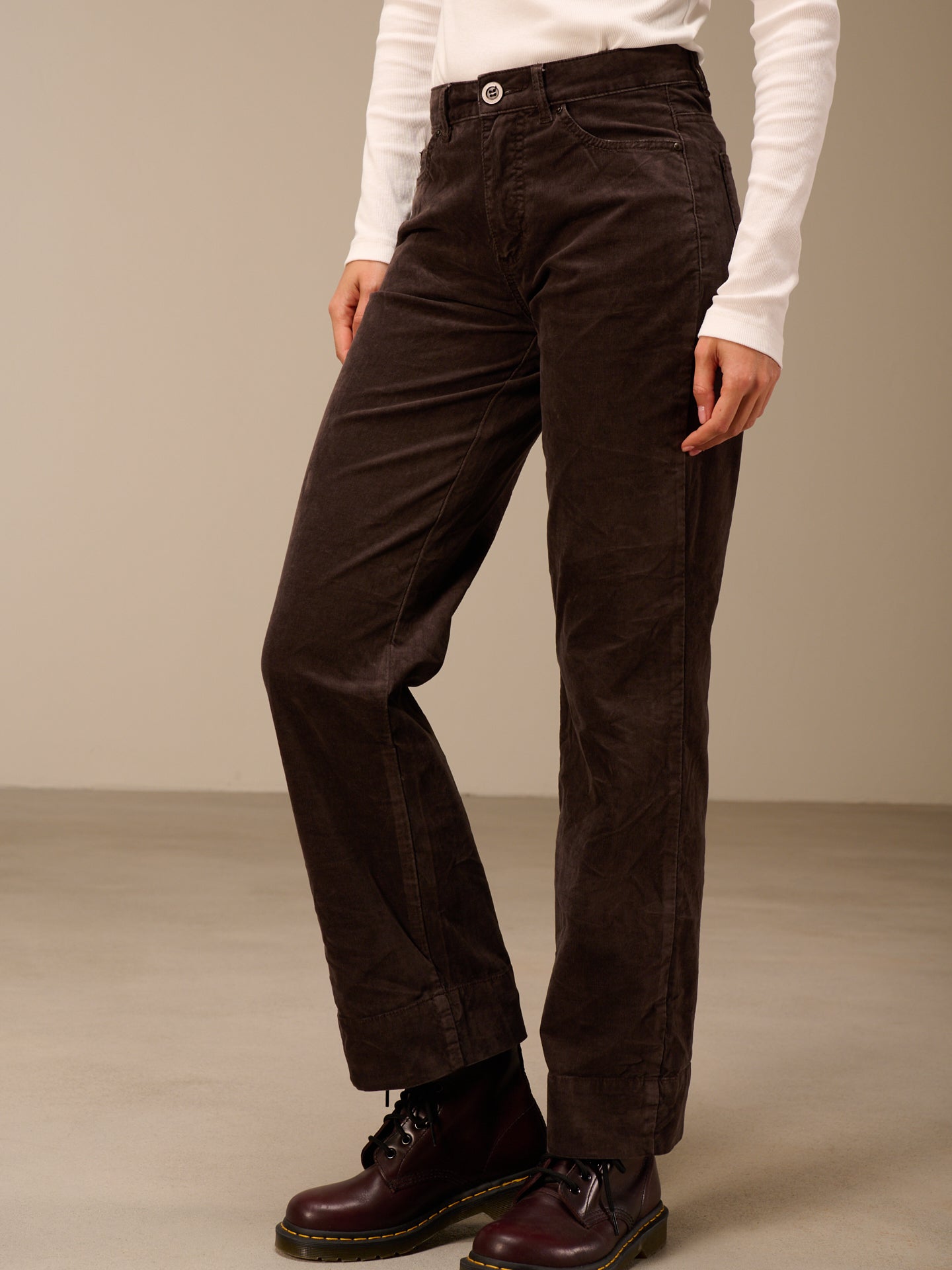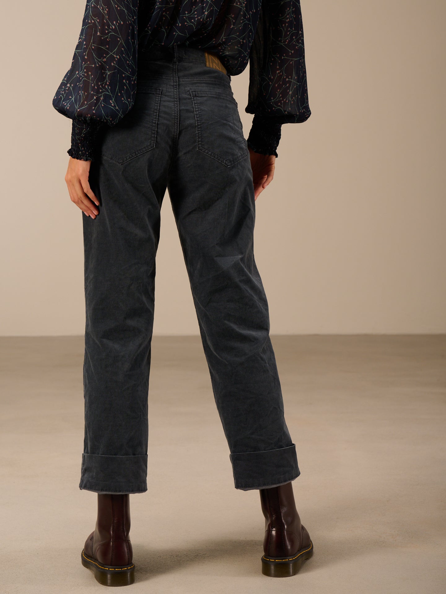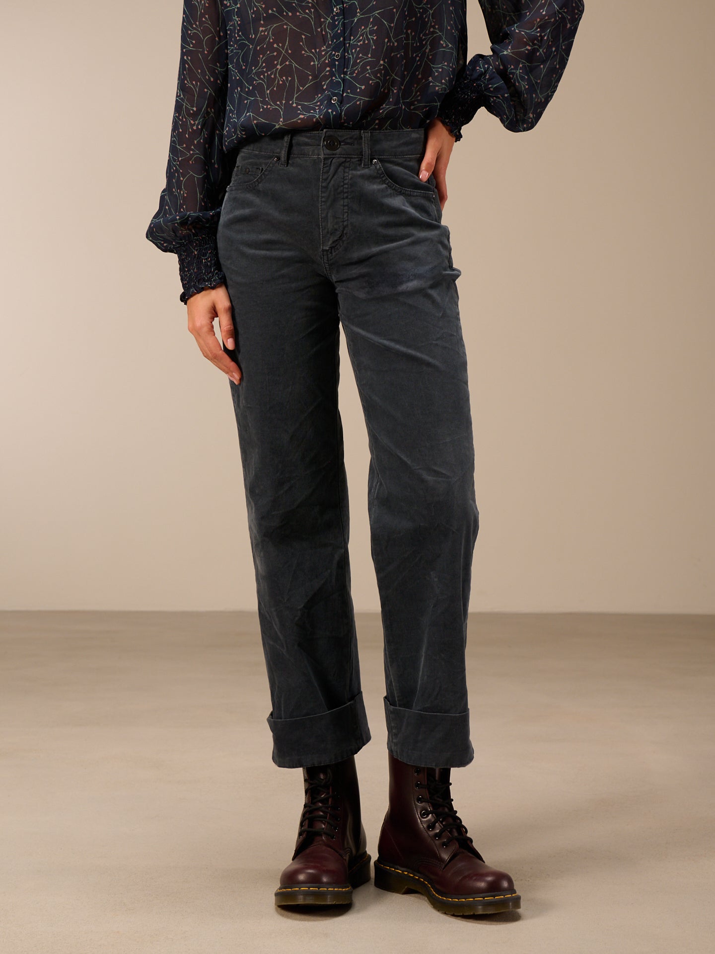 Hose mit geradem Bein mit breitem Saumaufschlag und einem mittelhohen Bund. Die Hose ist stückgefärbt, was zu Unregelmässigkeiten in der Farbe führt, den Ausbleicheffekt verstärkt und das Stück einzigartig macht.
