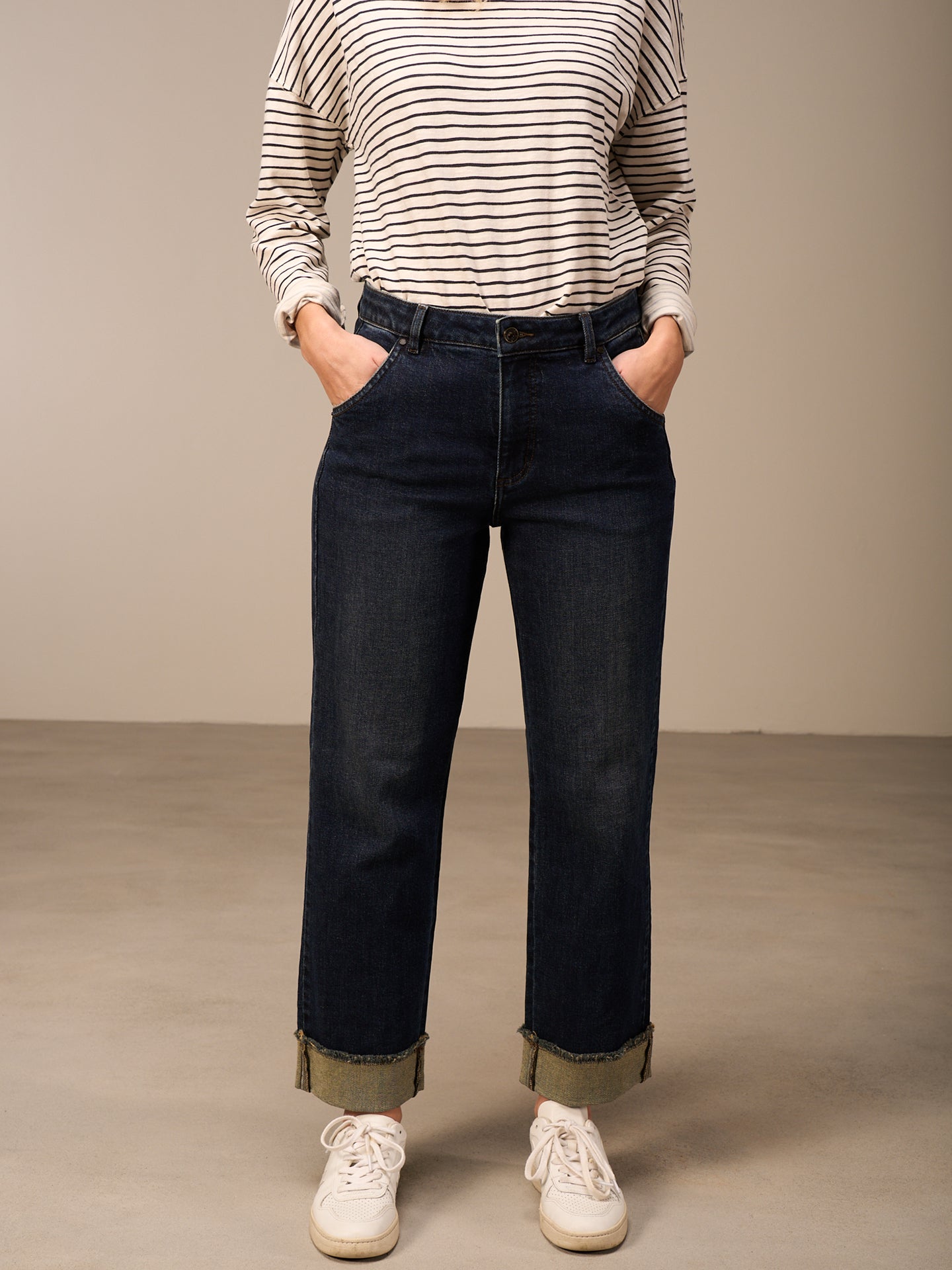 In der Hüfte anliegende Hose mit mittelhohem Bund und gerade geschnittenem Bein. Die Hosenbeine sind mit einem breiten Saumumschlag versehen und Dekobänder am Umschlag werten die Jeans zusätzlich auf. Ein fester Denim aus 99% Bio-Baumwolle aus zertifiziertem Anbau. Die leichte Dehnbarkeit und die klassischen Demin Waschungen vereinen Style und Tragekomfort. Unregelmässigkeiten in der Farbe und ein verstärkter Ausbleicheffekt sind gewollt und machen das Stück einzigartig. Das Produkt kann auf Kleidung und Oberflächen abfärben.