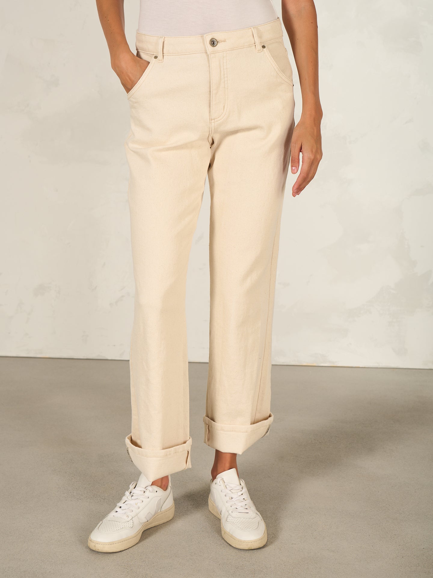 In der Hüfte anliegende Hose mit mittelhohem Bund und gerade geschnittenem Bein. Die Hosenbeine sind mit einem breiten Saumumschlag versehen und Dekobänder am Umschlag werten die Jeans zusätzlich auf. Ein fester Denim mit leichter Dehnbarkeit und klassischen Demin Waschungen vereinen Style und Tragekomfort. Unregelmässigkeiten in der Farbe und ein verstärkter Ausbleicheffekt sind gewollt und machen das Stück einzigartig. Das Produkt kann auf Kleidung und Oberflächen abfärben.