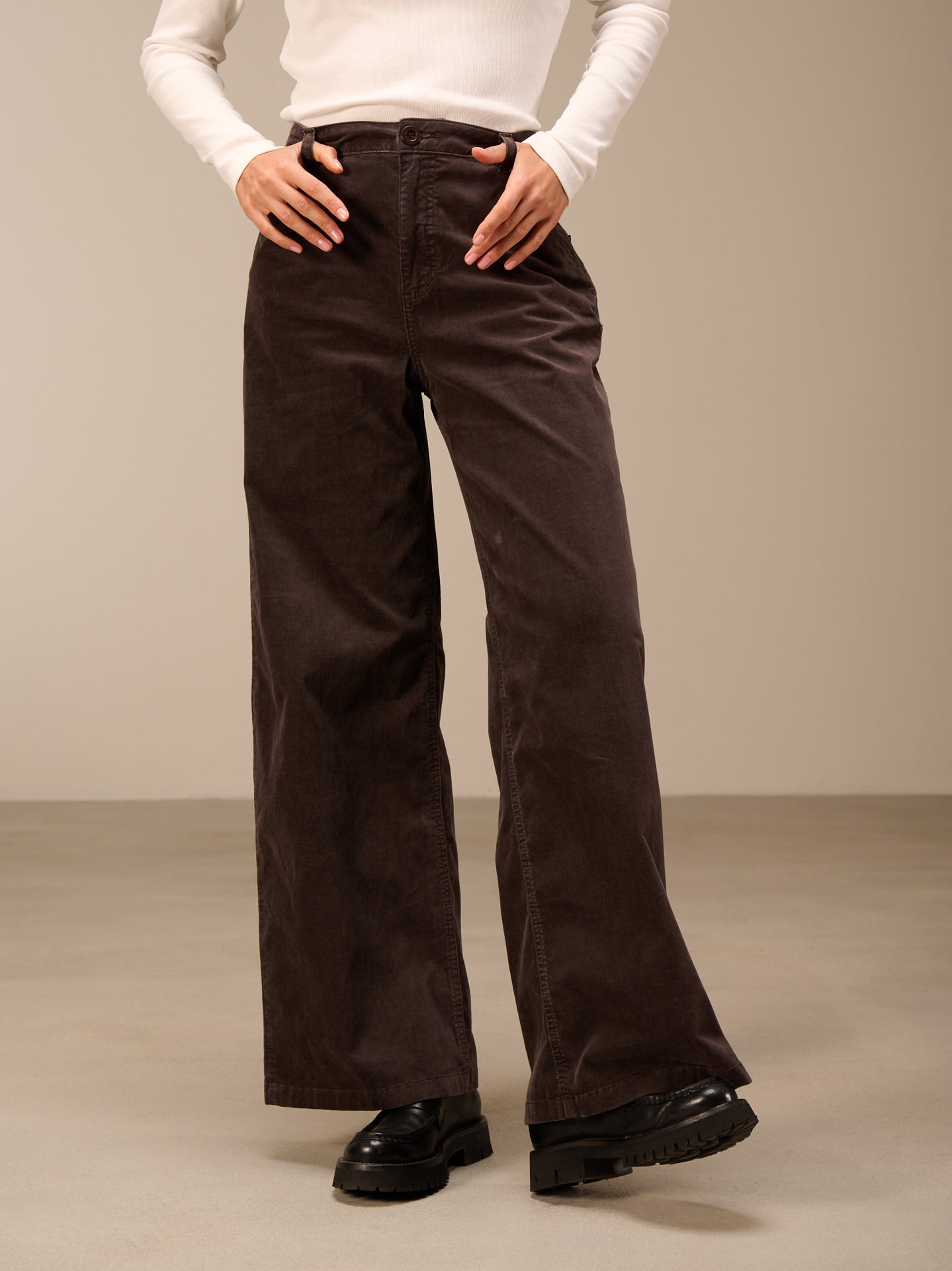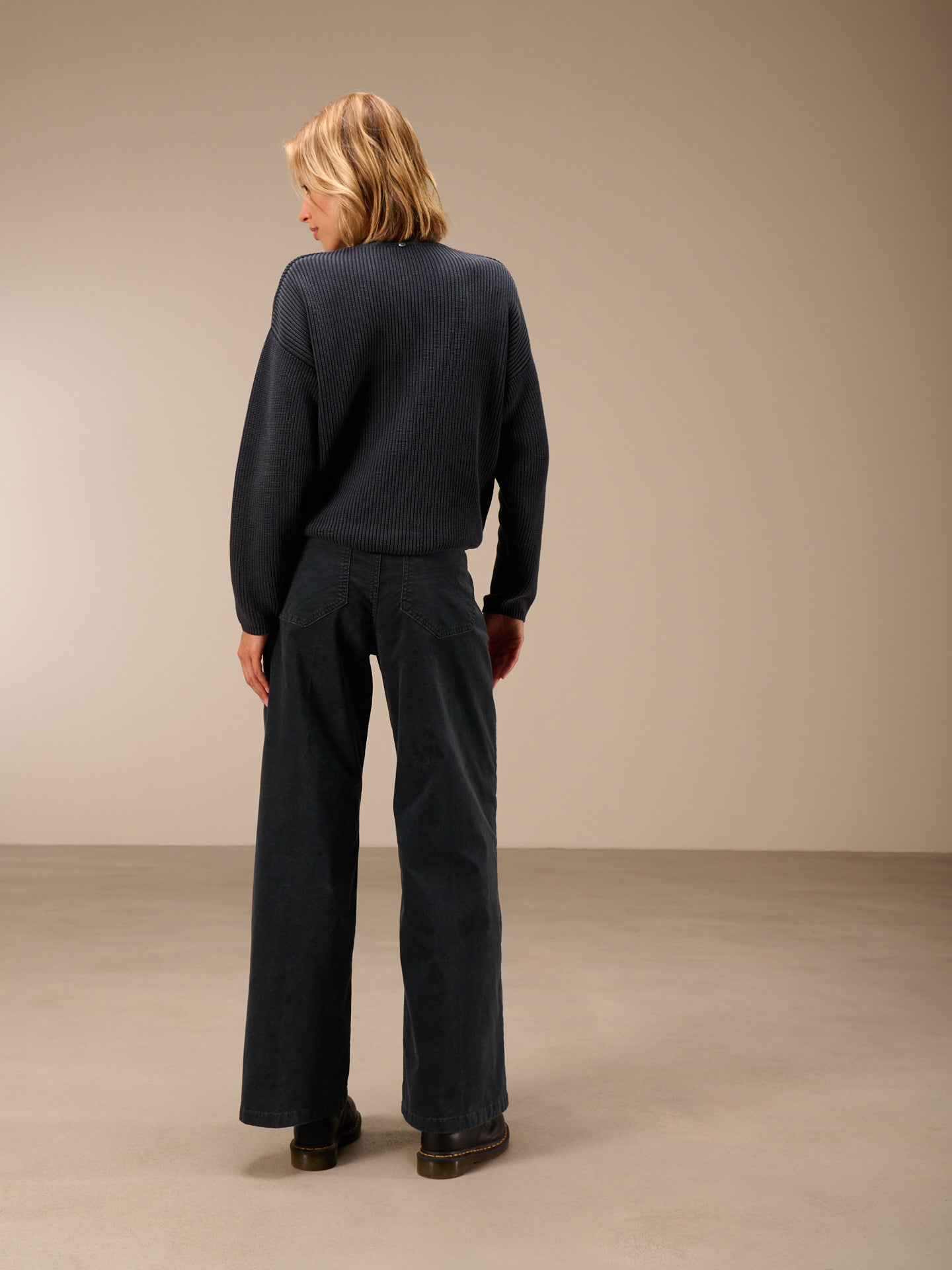 Hose mit weitem, dezent ausgestelltem Bein und einem mittelhohen Bund. Die Hose ist stückgefärbt, was zu Unregelmässigkeiten in der Farbe führt, den Ausbleicheffekt verstärkt und das Stück einzigartig macht.