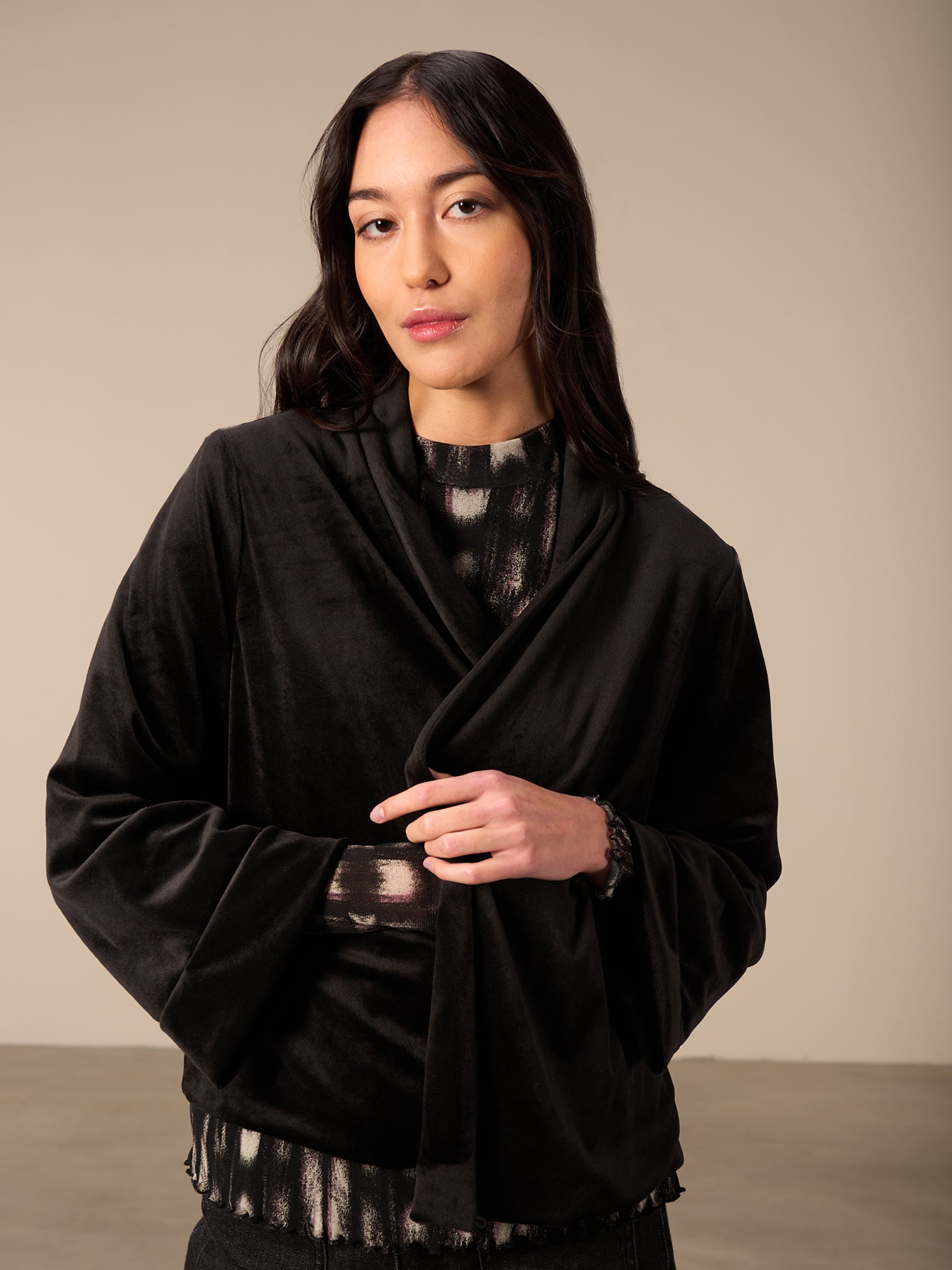 Weite Jacke mit Kimonoärmel aus weichem fallendem Samtstoff, verschliessbar im Wickel-Look.