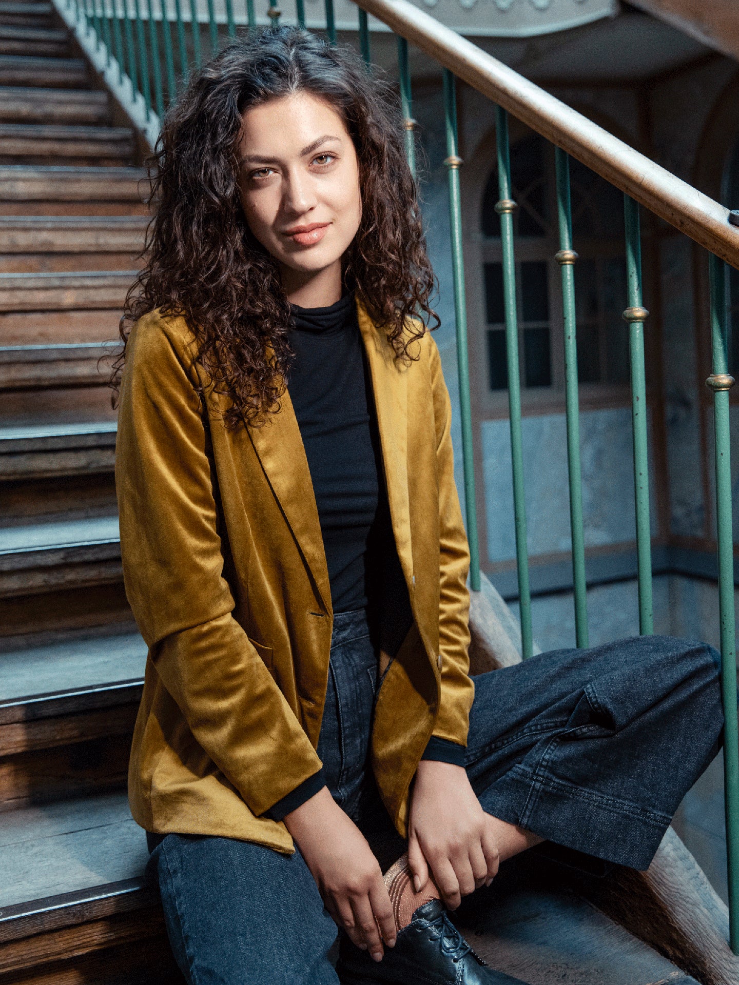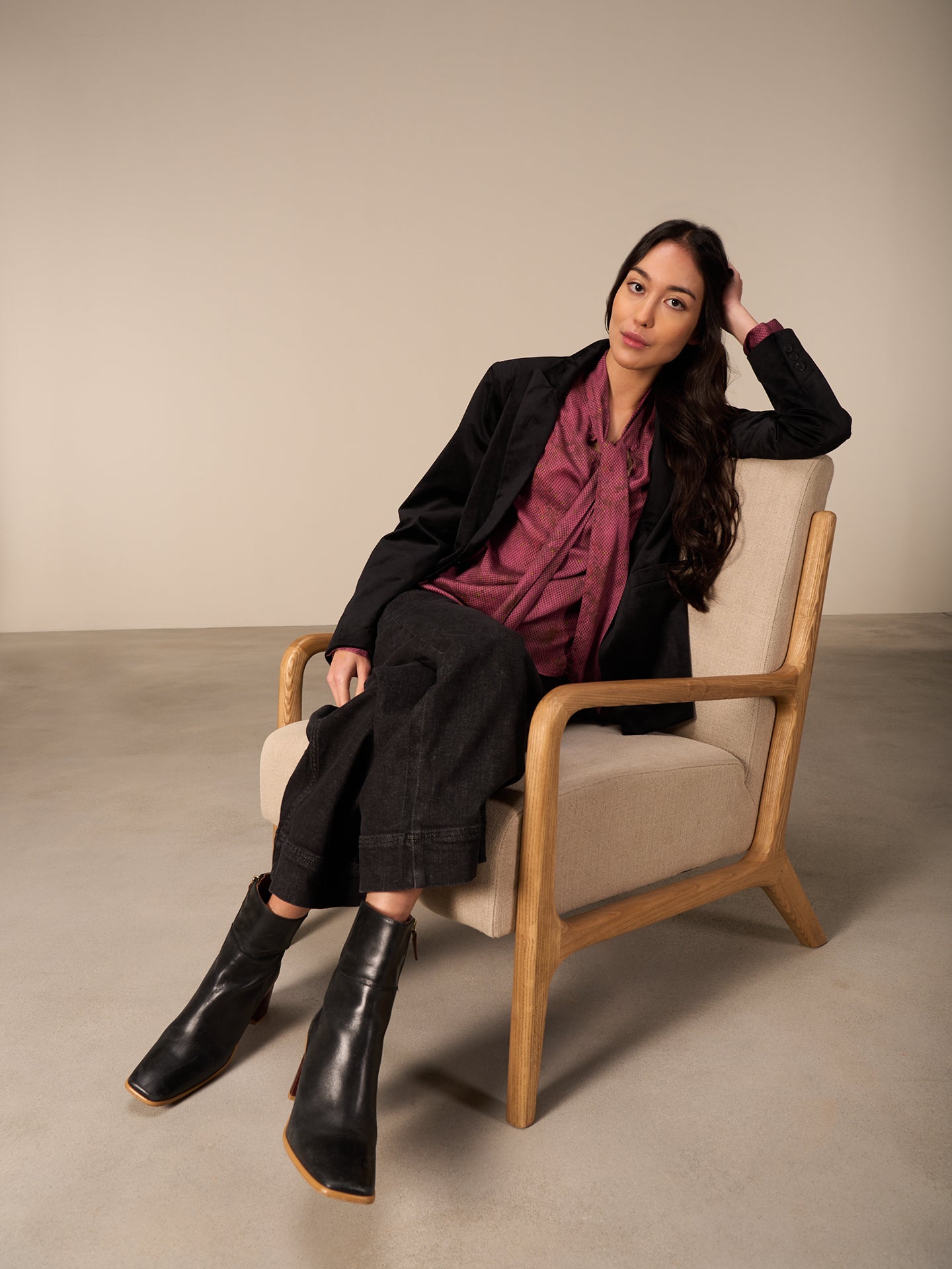 Leicht oversized geschnittener einreihiger Blazer aus elegantem leicht glänzendem Samtstoff. Mit Reverskragen, formenden Abnähern, Schulterpolster und fake Hornknöpfen.