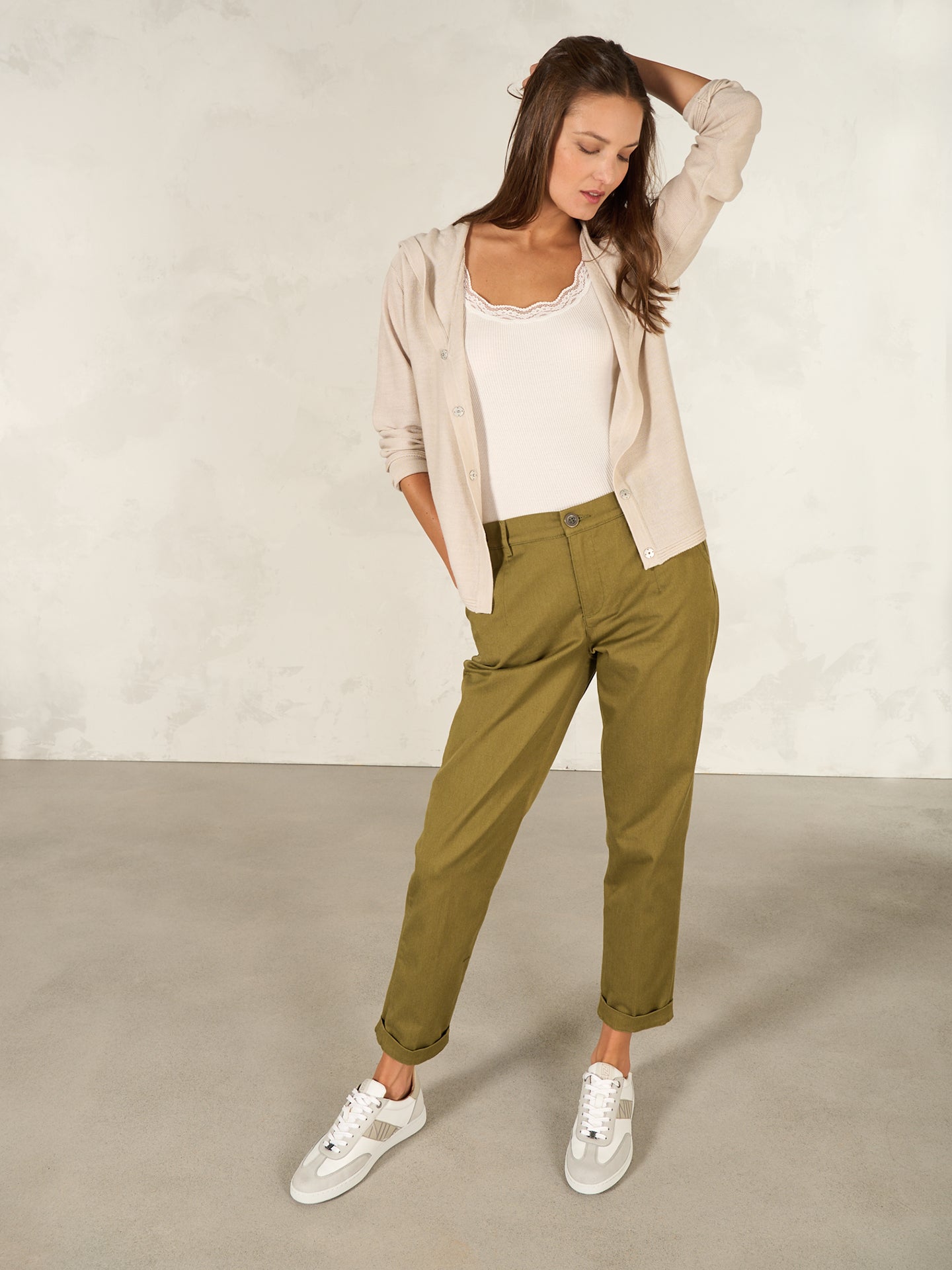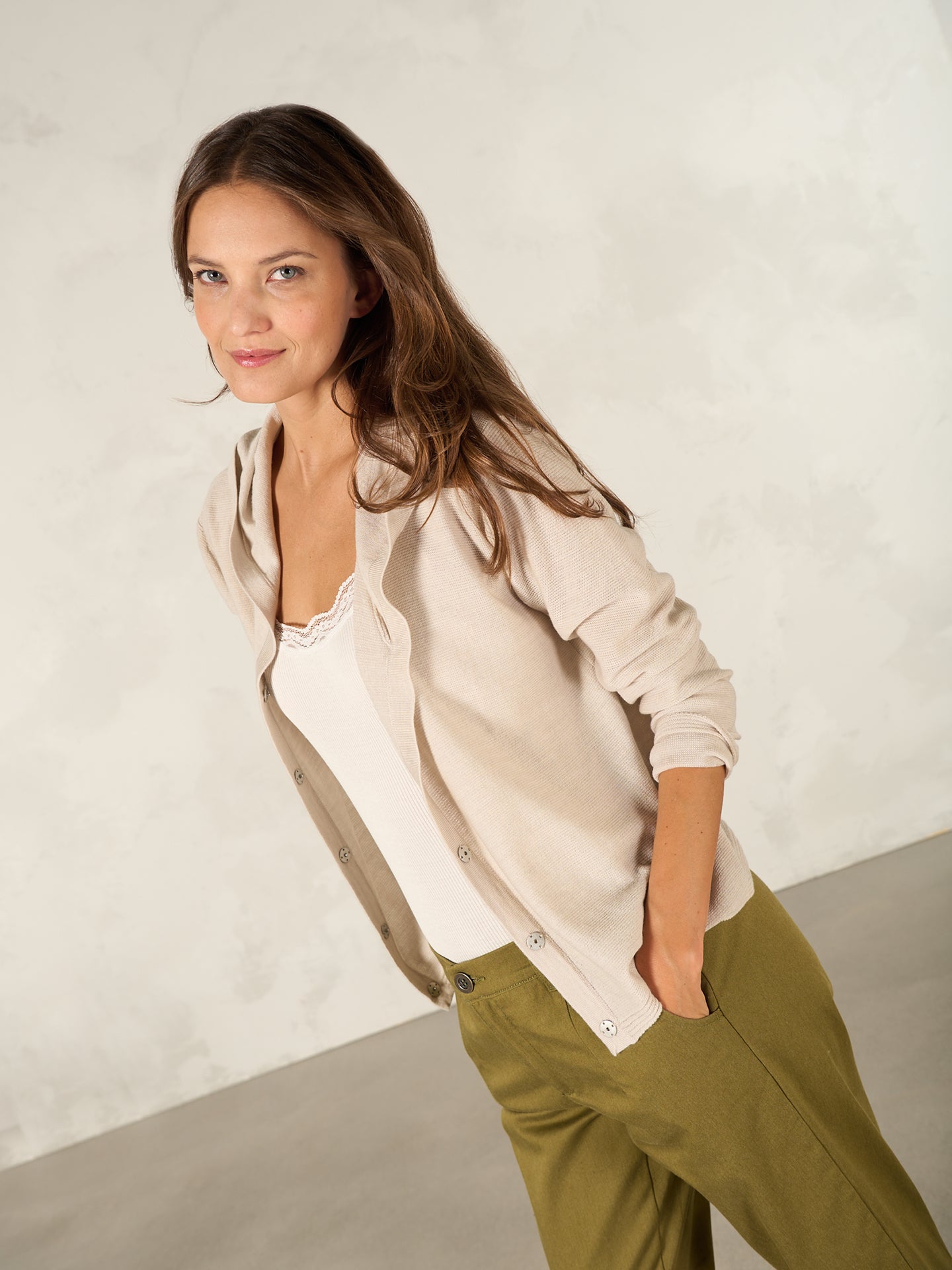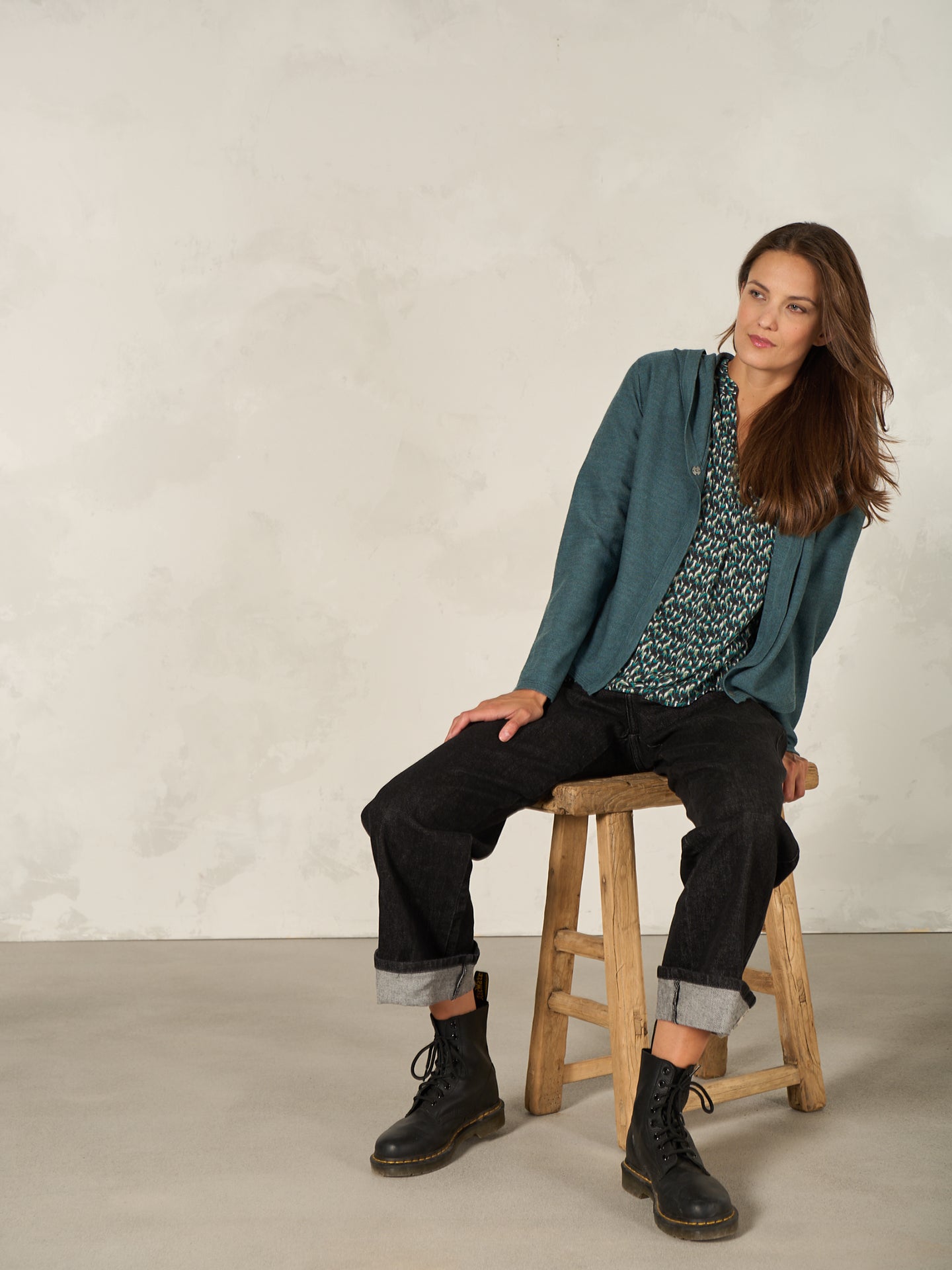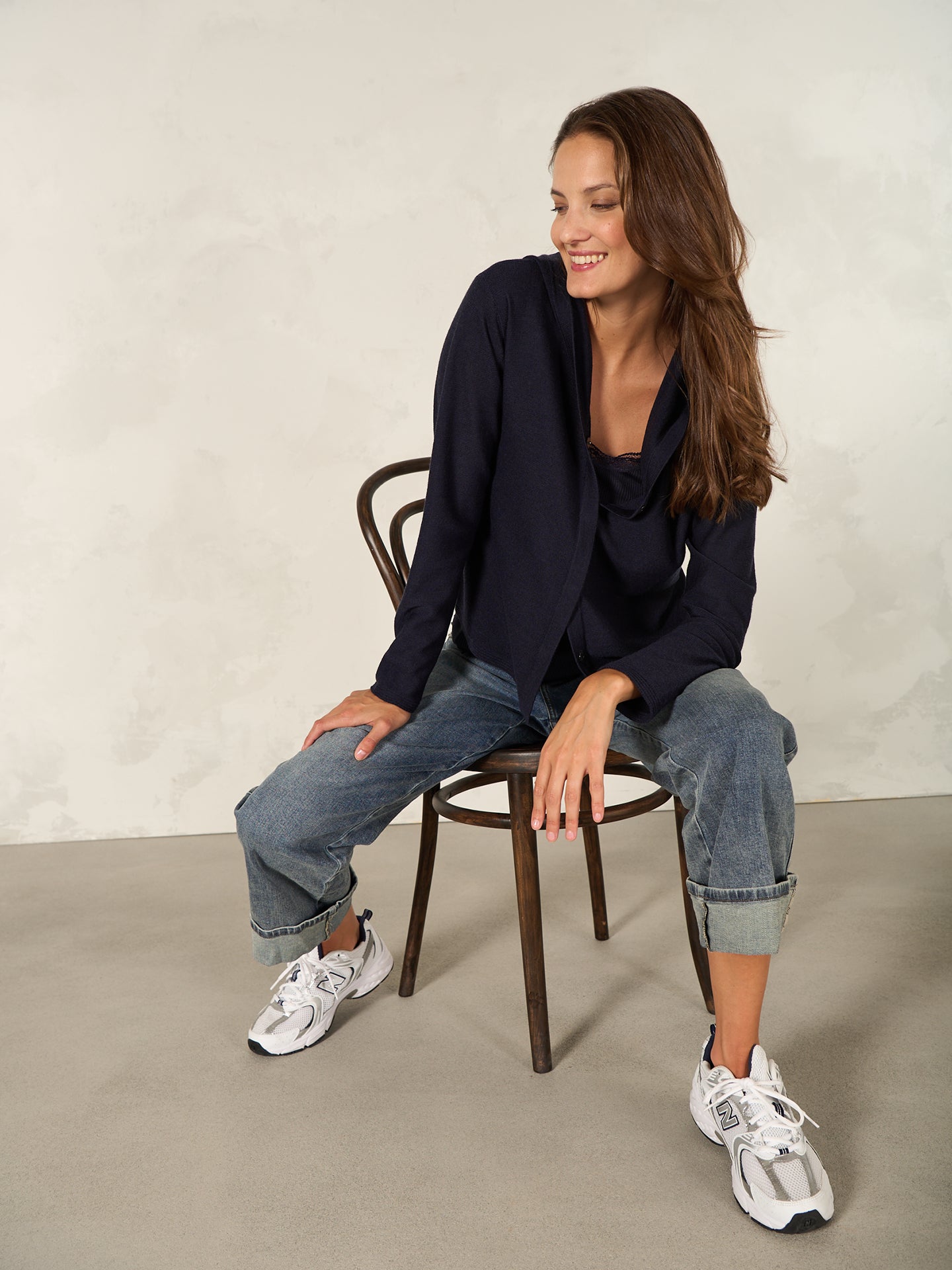 Gerade geschnittene Strickjacke in speziellem Melange-Garn und überschnittenen Schultern. Die dekorative Kapuze und die verdeckte Knopfleiste mit Metal Druckknöpfen runden den Style ab und machen die Strickjacke zu einem perfekten Begleiter für den Alltag.