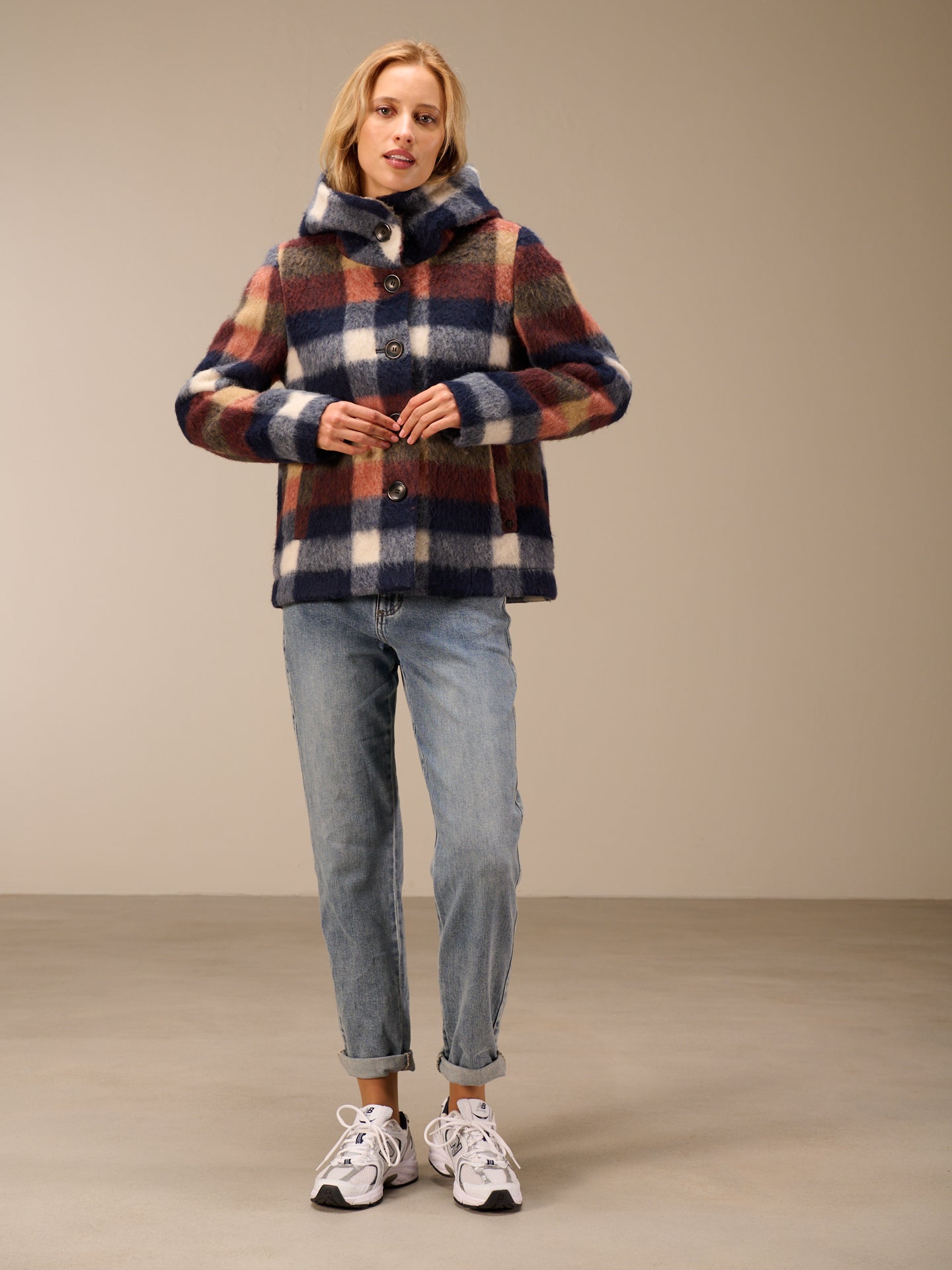 Angesagte Karojacke in leichtem A-Shape mit praktischen Leistentaschen und Kapuze.