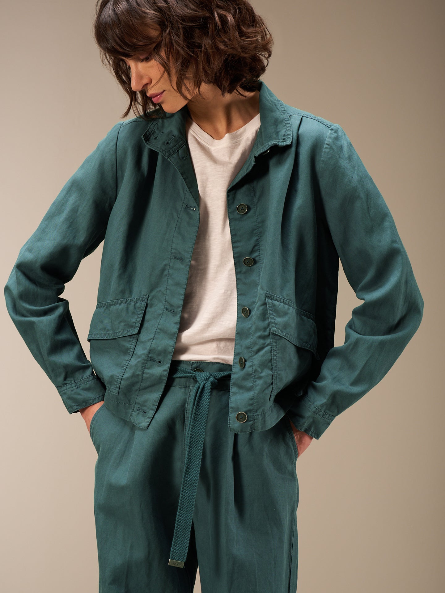 Kurze, weite, sportliche Jacke mit grossen aufgesetzten Taschen in angenehm sommerlicher Qualität. Der Kragen kann locker offen oder mit 2 Knöpfen geschlossen getragen werden. Der Knopfverschluss vorne und der Ärmelabschluss mit Knopf runden den edlen Look ab.