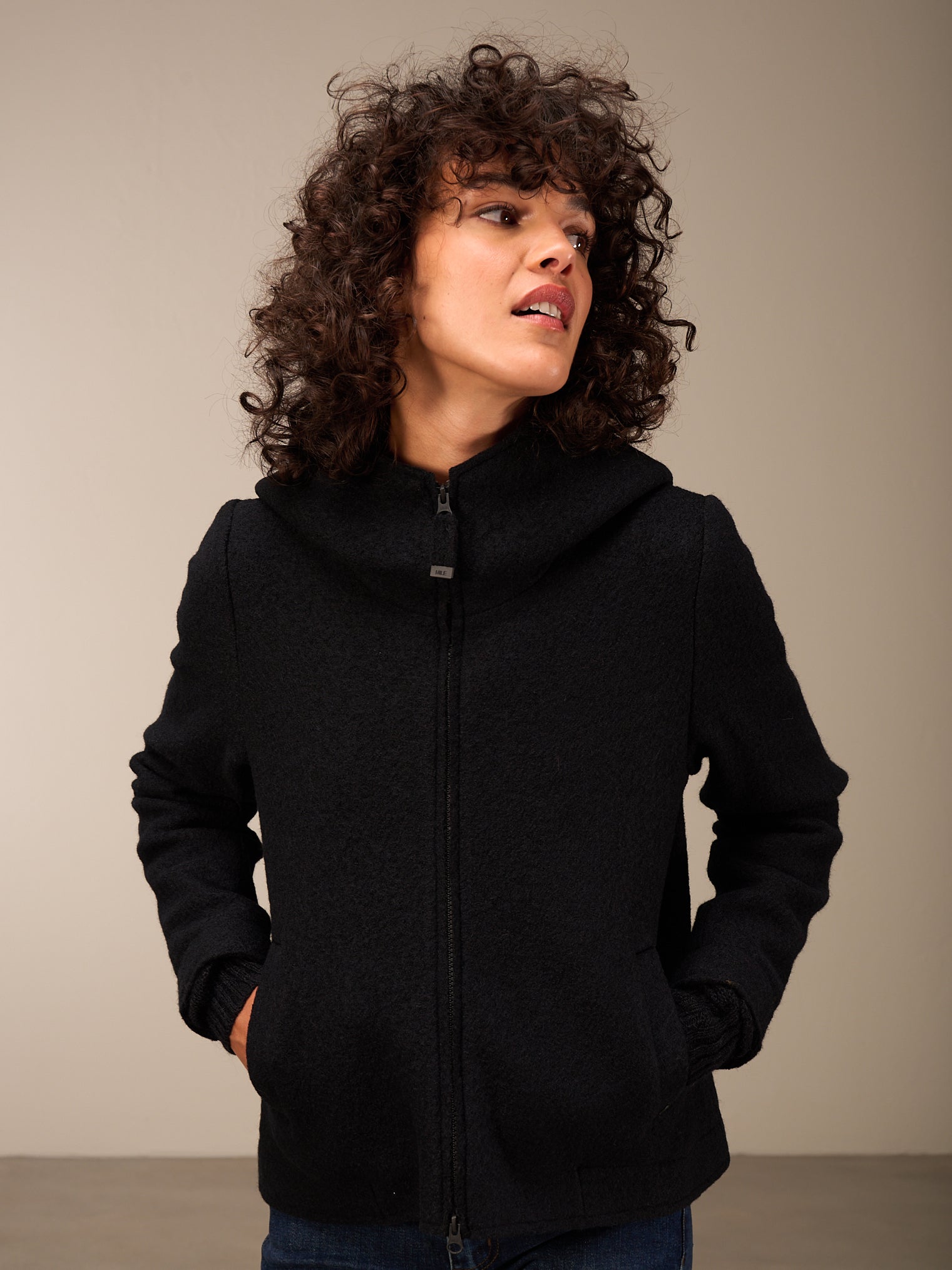 Gefütterte Jacke in bequemer Silhouette mit praktischem Zip, dekorativer Kapuze und Taschen mit seitlichem Eingriff. Soft gefilzte Wollqualität, angenehm leicht und doch warm.