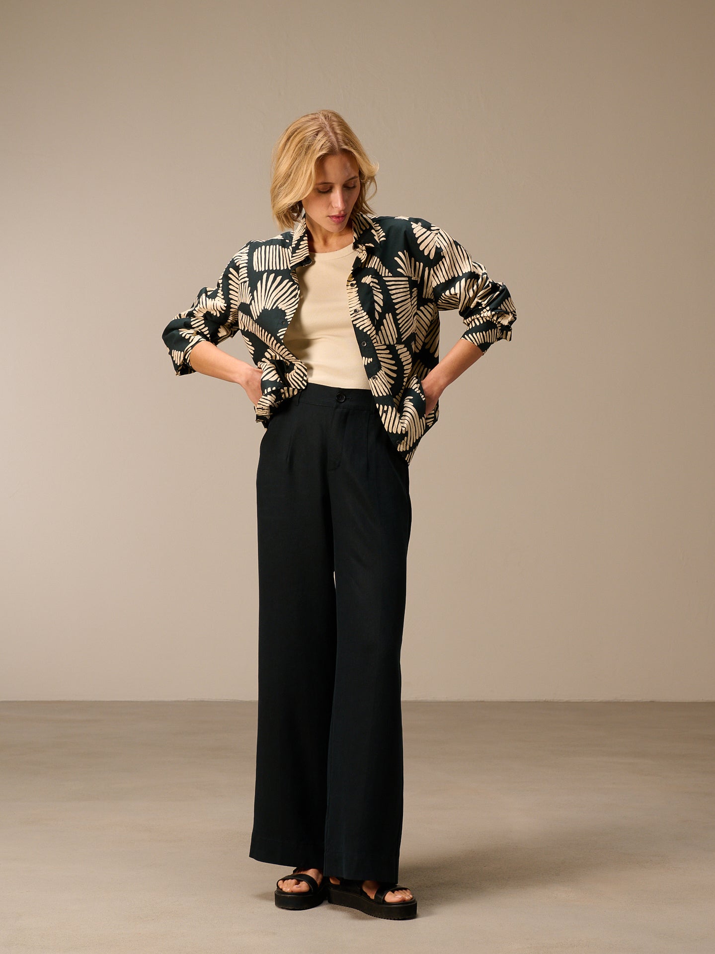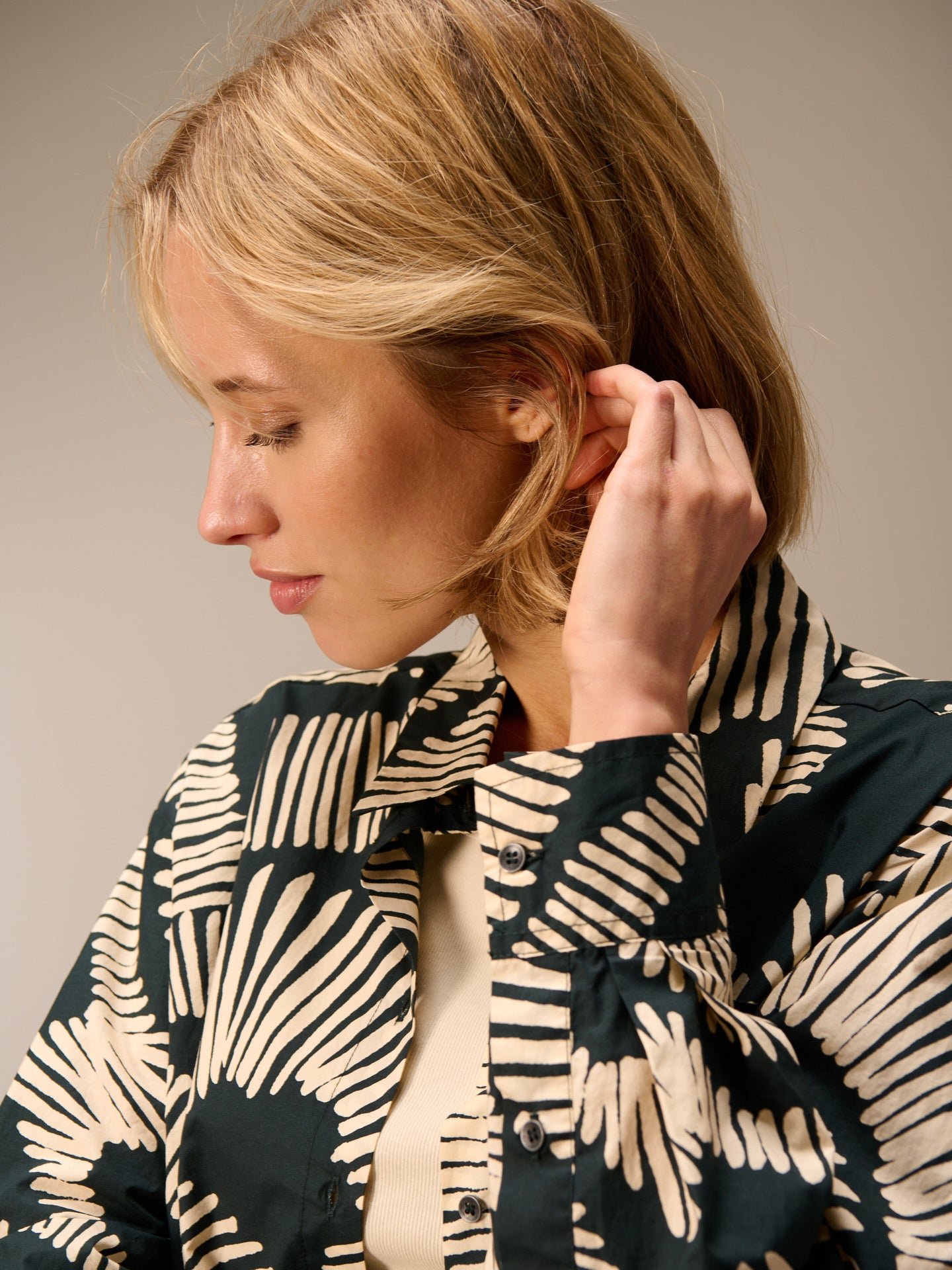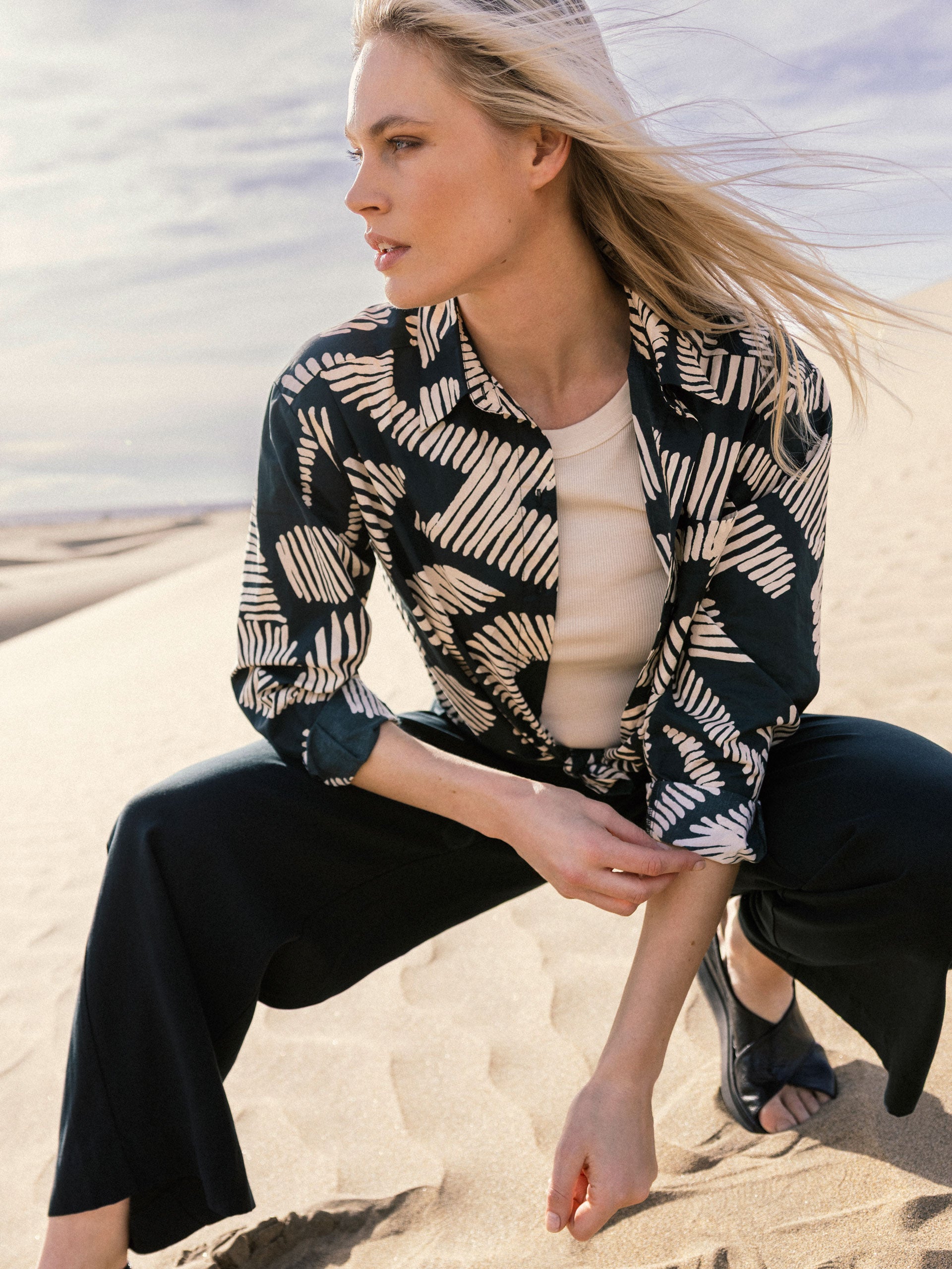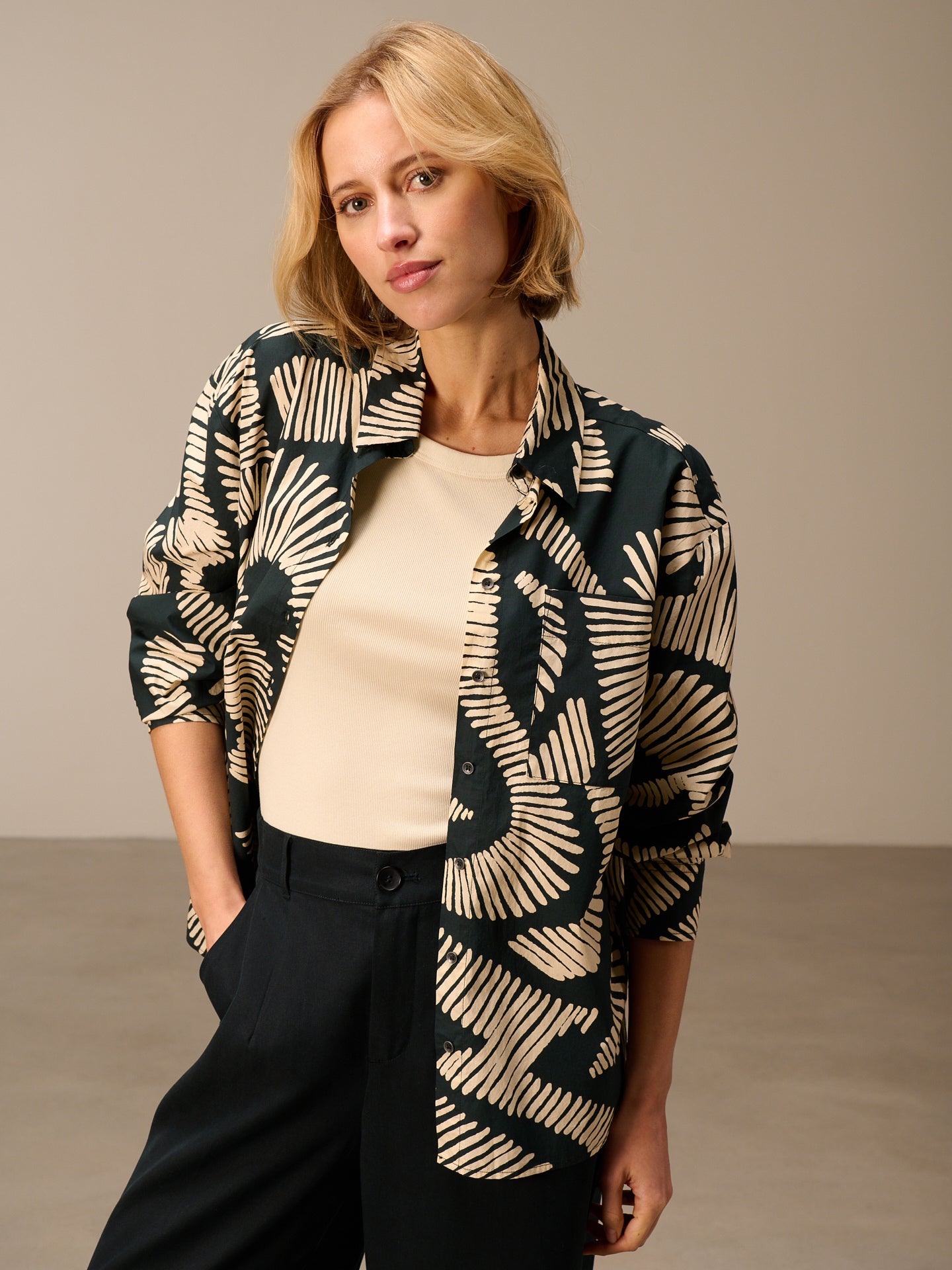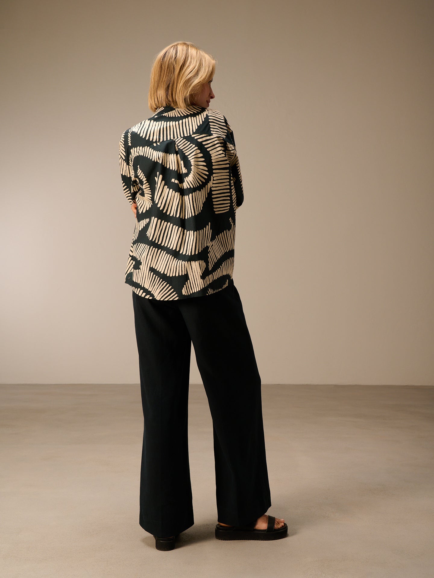 Lässiges oversize Hemdjacket mit Hemdkragen, das sich als Hemd oder Jacket stylen lässt. Die handgezeichneten geometrischen Prints runden den Style ab. In 100% Bio-Baumwolle mit einem kühlen papierigem Touch.