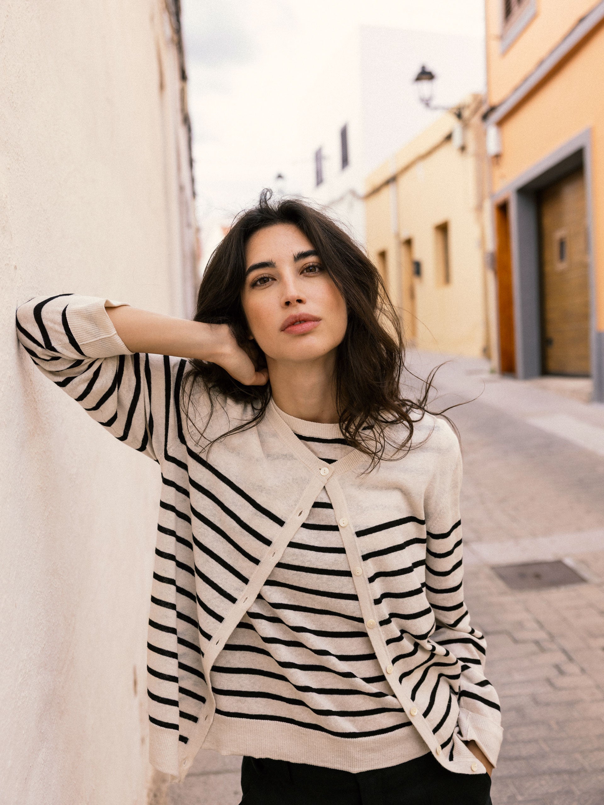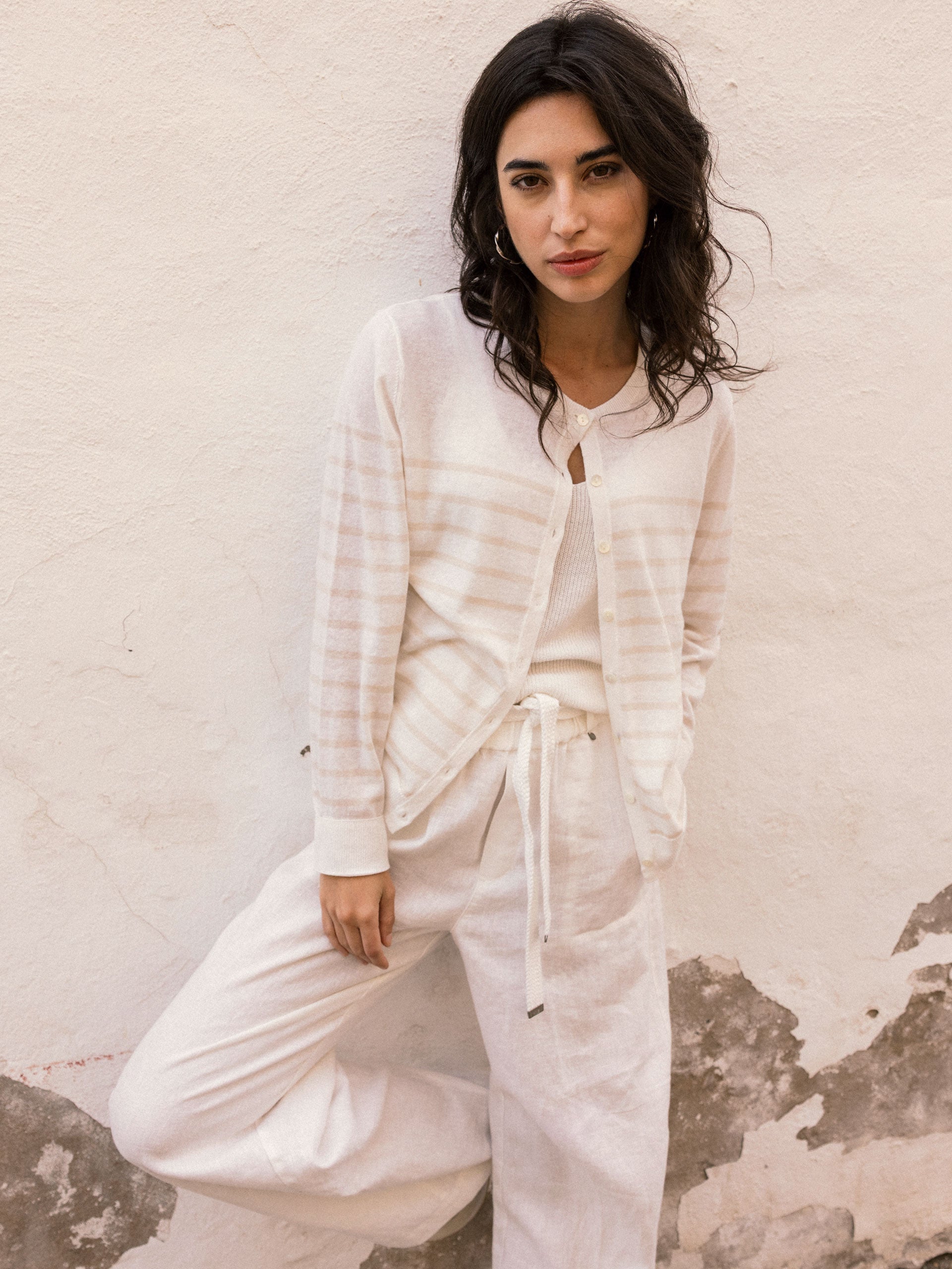Schmal geschnittene Strickjacke in edler Feinstrickoptik mit Rundhalskragen, edlen Perlmutknöpfen und trendigem Streifenmuster. Für einen hohen Tragekomfort sorgt die hochwertige Leinen- und Baumwollmischung.