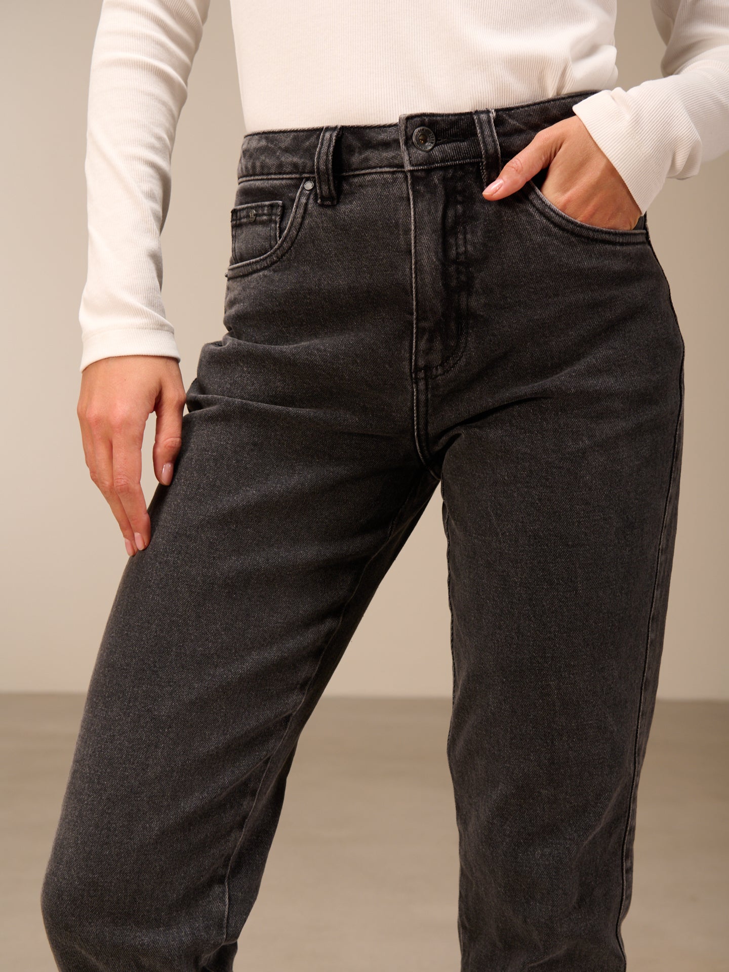 In der Hüfte anliegende alltagstaugliche Denimhose in klassischer Waschung mit mittelhohem Bund lockerem Bein.