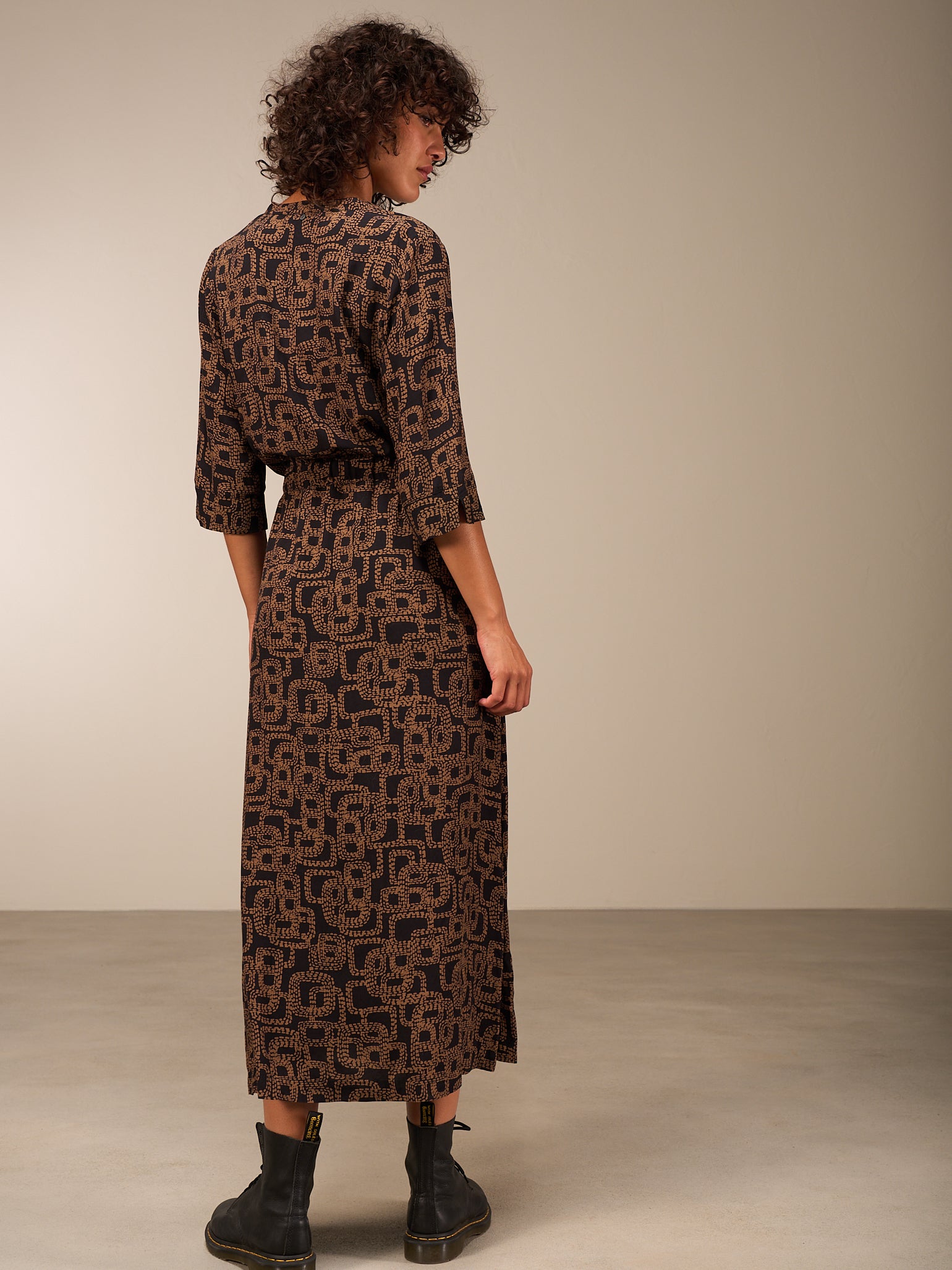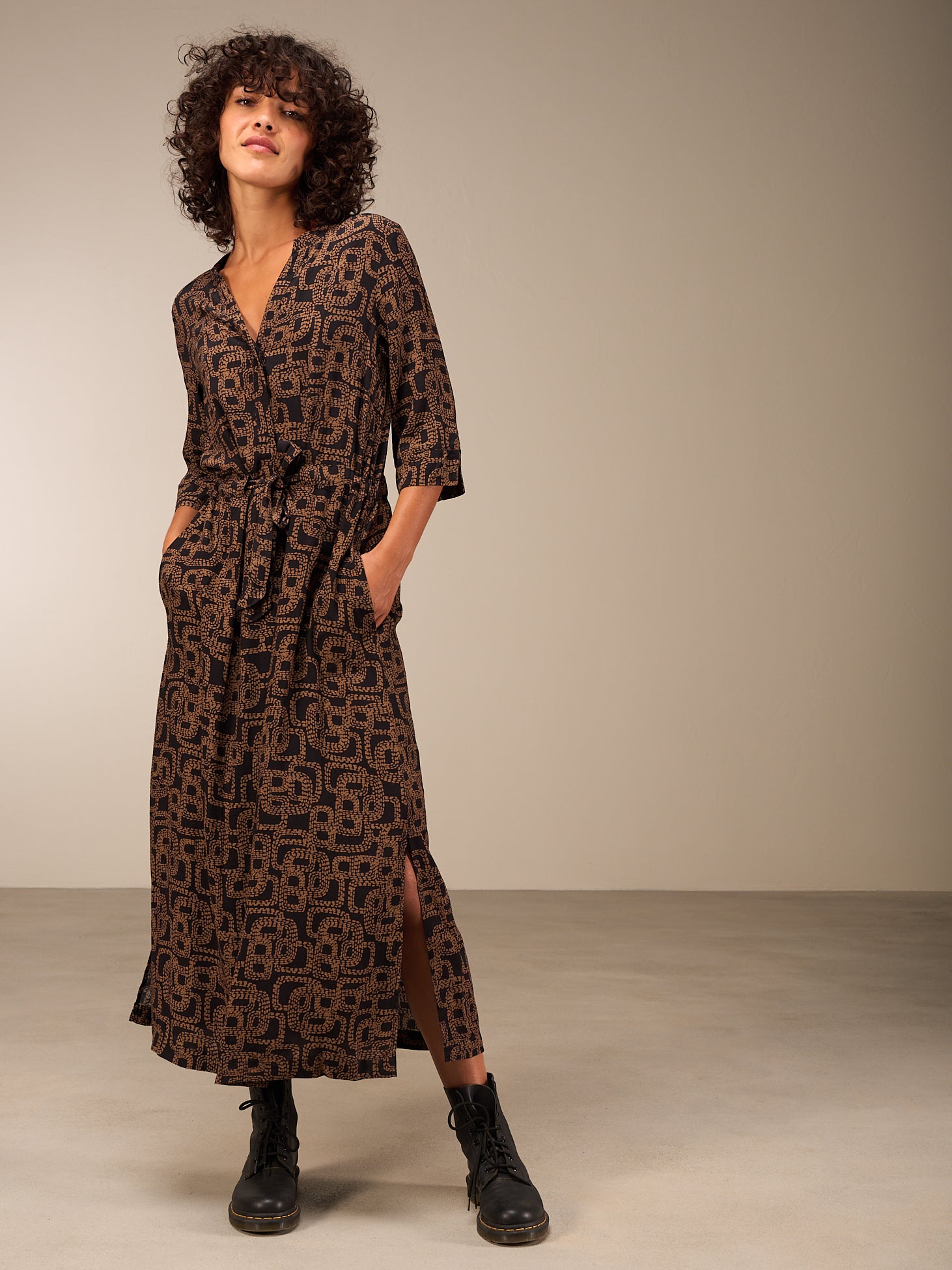 Langes Kleid mit Stehkragen, V-Ausschnitt und 3/4-Ärmeln. Der raffinierte Gürtel in einem Tunnelzug sorgen für ein variantenreiches Styling. Der passende handgezeichnete Alloverprint und das weich fliessende, blickdichte Material runden den Look ab.