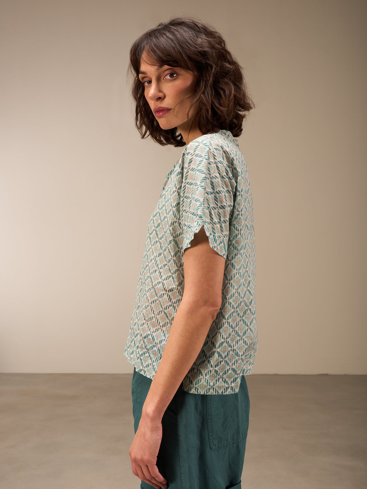 Sommerlich leichte, kastig geschnittene Kurzarmbluse mit kleinem Stehkrage und kleinen Metallknöpfen in handgezeichnetem Alloverprint. 100% Bio-Baumwolle aus zertifiziertem Anbau.