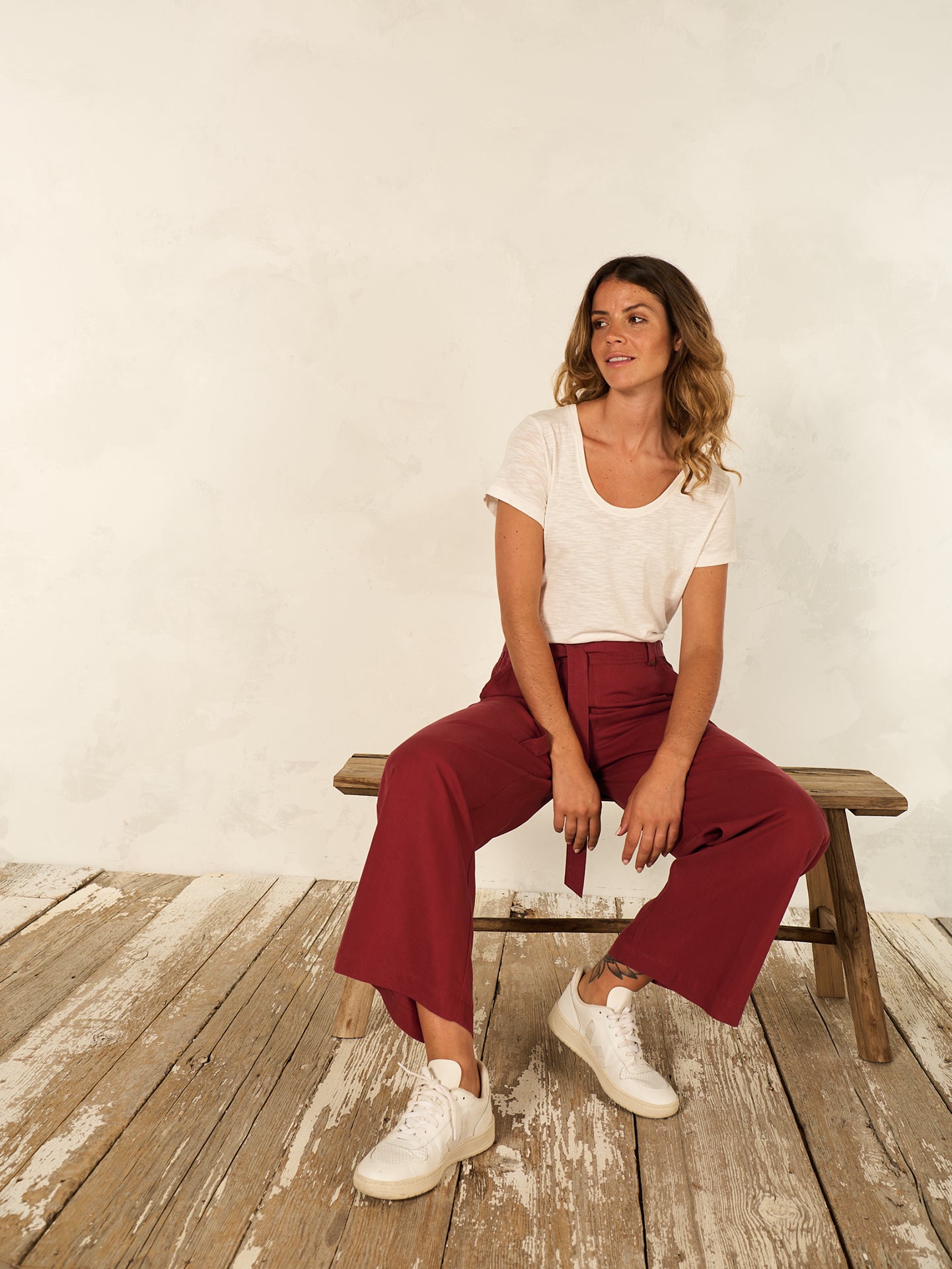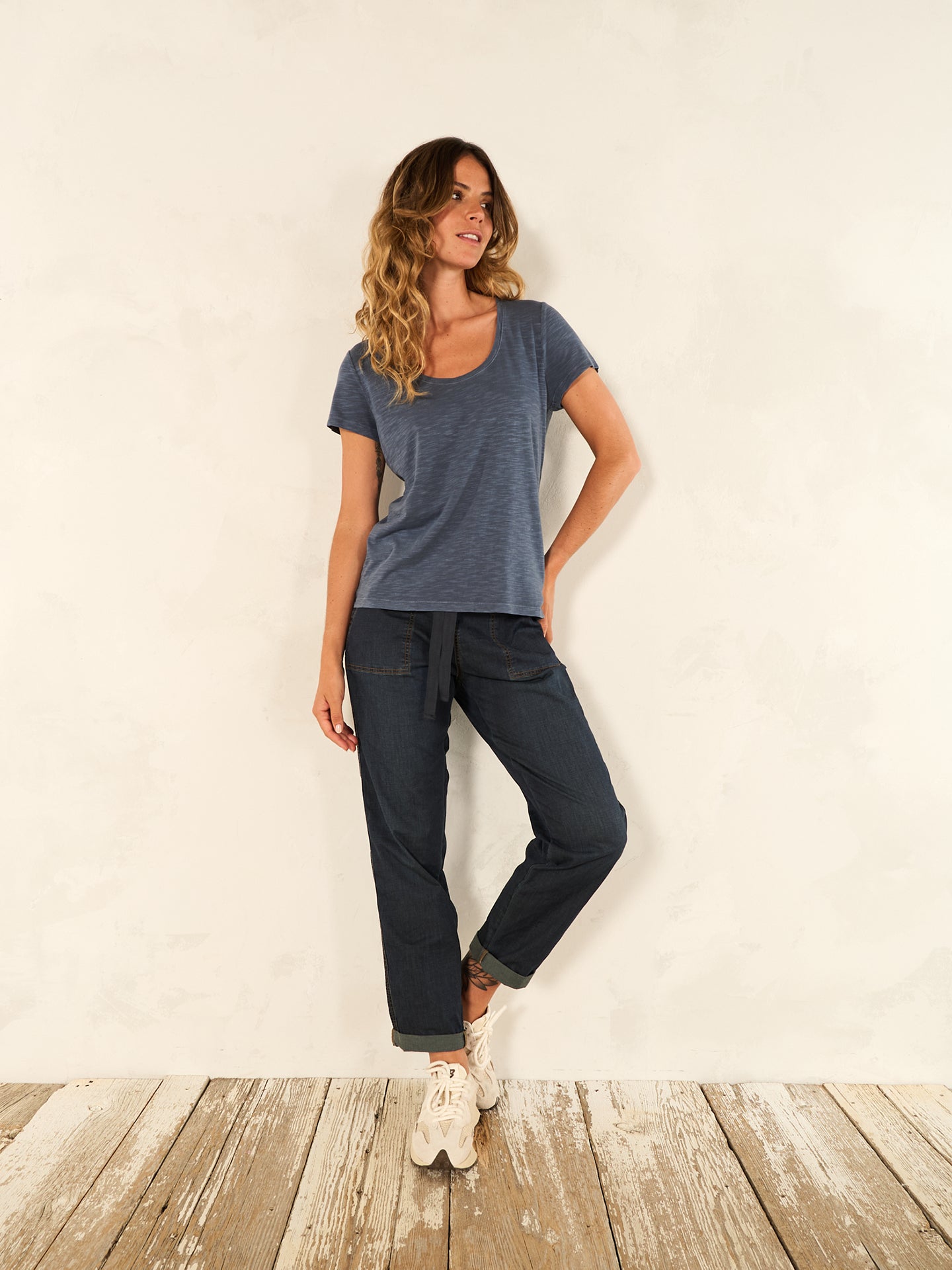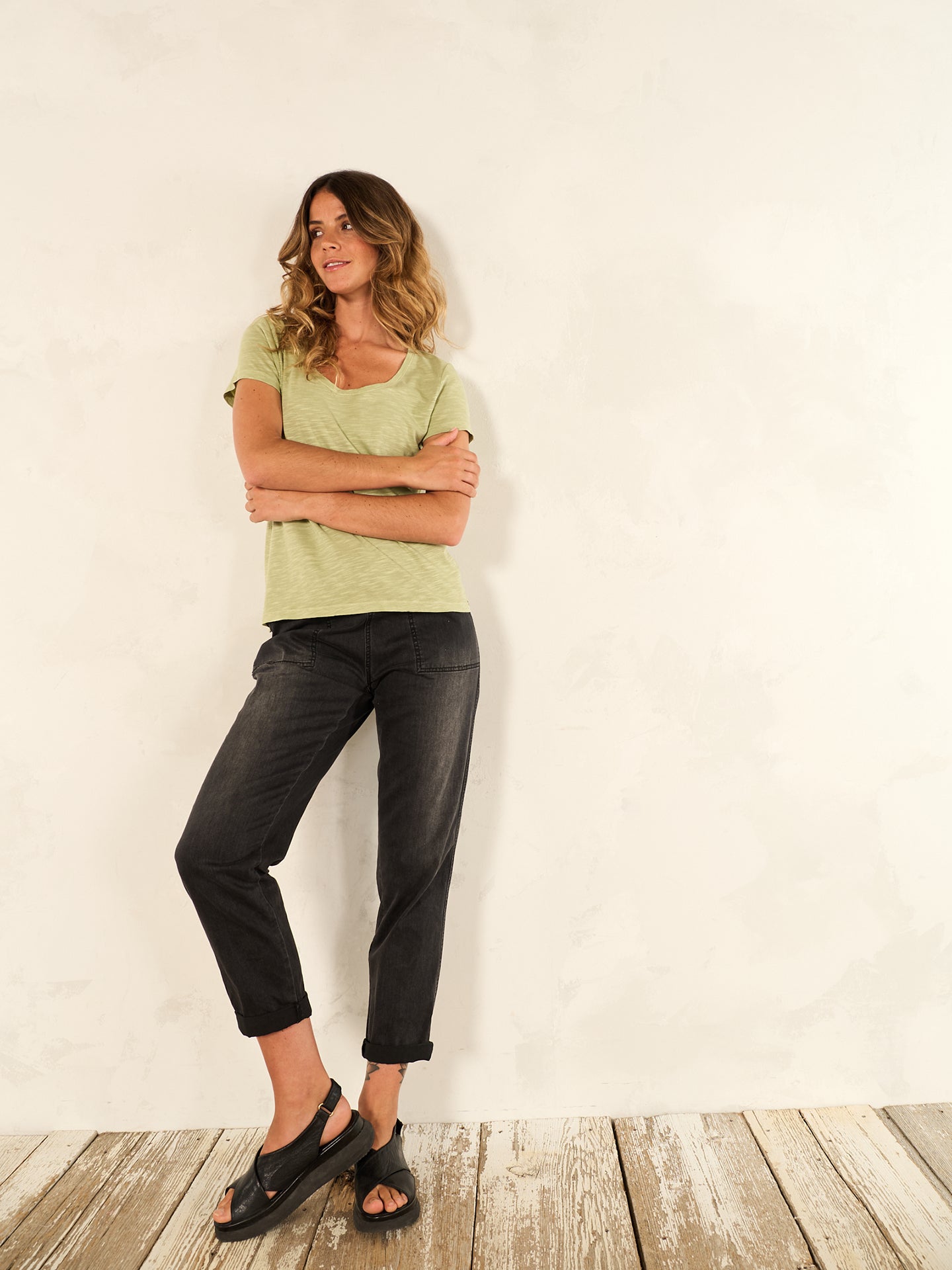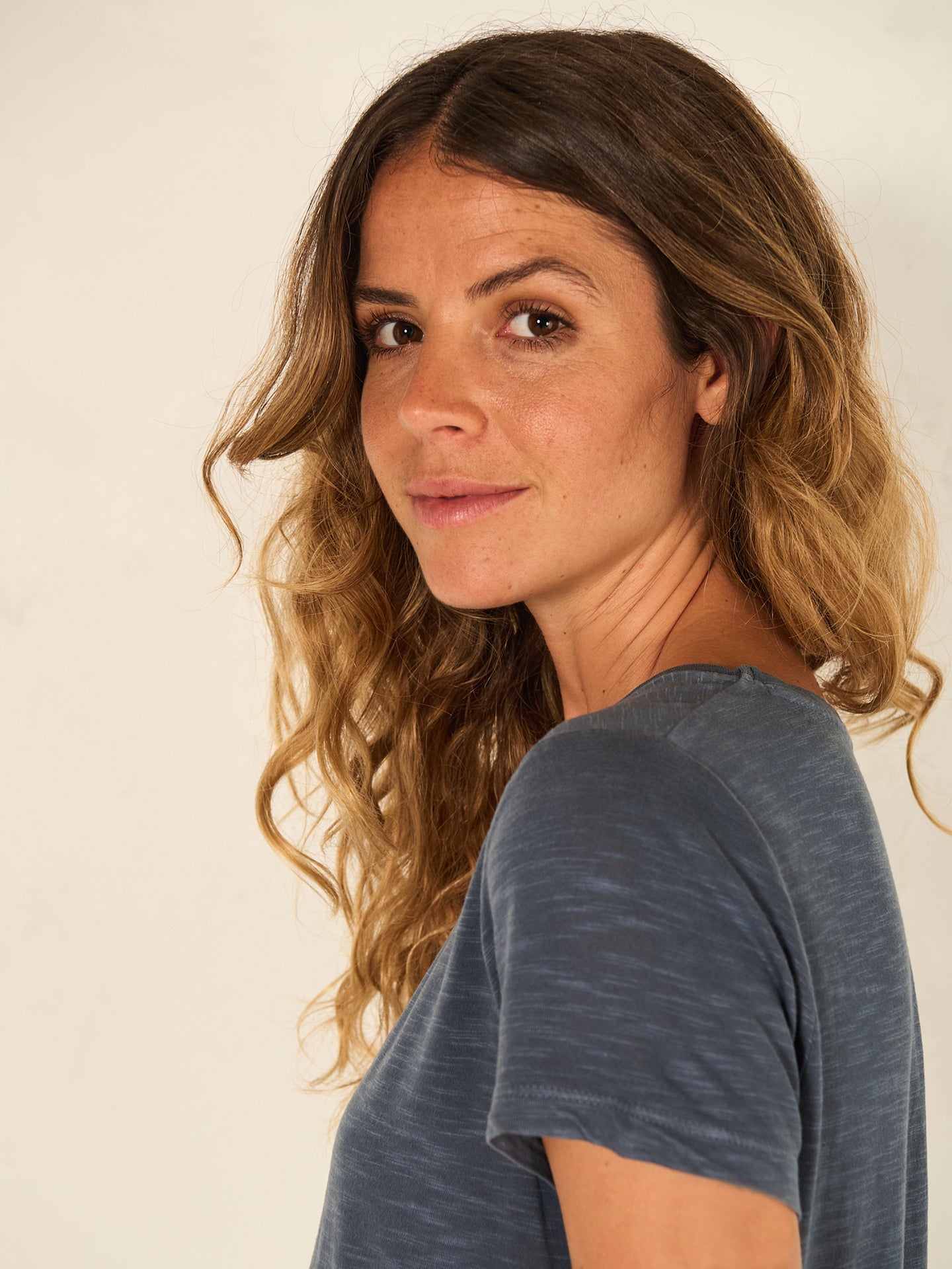 Locker geschnittenes T-Shirt mit offenkantigem Rundhals aus geflammtem Jersey. Aus 52% Biobaumwolle und 48% Viscose. Durch ein spezielles inwendiges Färbeverfahren erhält das Shirt einen schönen ausgewaschenen Look. Unregelmässigkeiten in der Farbe machen das Stück einzigartig. Der Ausbleicheffekt wird beim Waschen verstärkt.