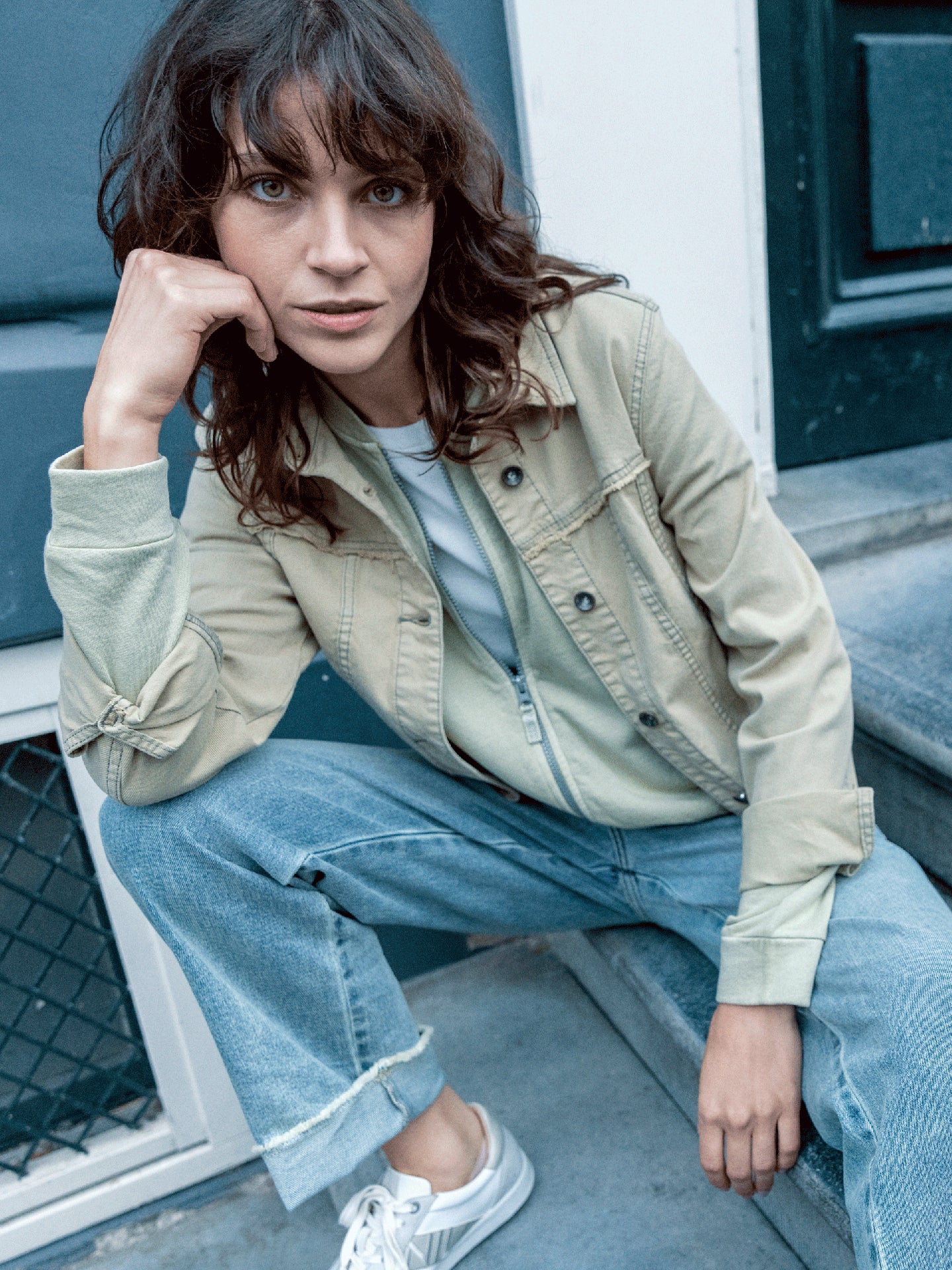 Sportliche Jacke mit aufgenähten Brusttaschen und Kapuze. 98% Bio-Baumwolle aus zertifiziertem Anbau und 2% Elasthan. Stückgefärbt. Unregelmässigkeiten in der Farbe machen das Stück einzigartig. Der Ausbleicheffekt wird verstärkt.