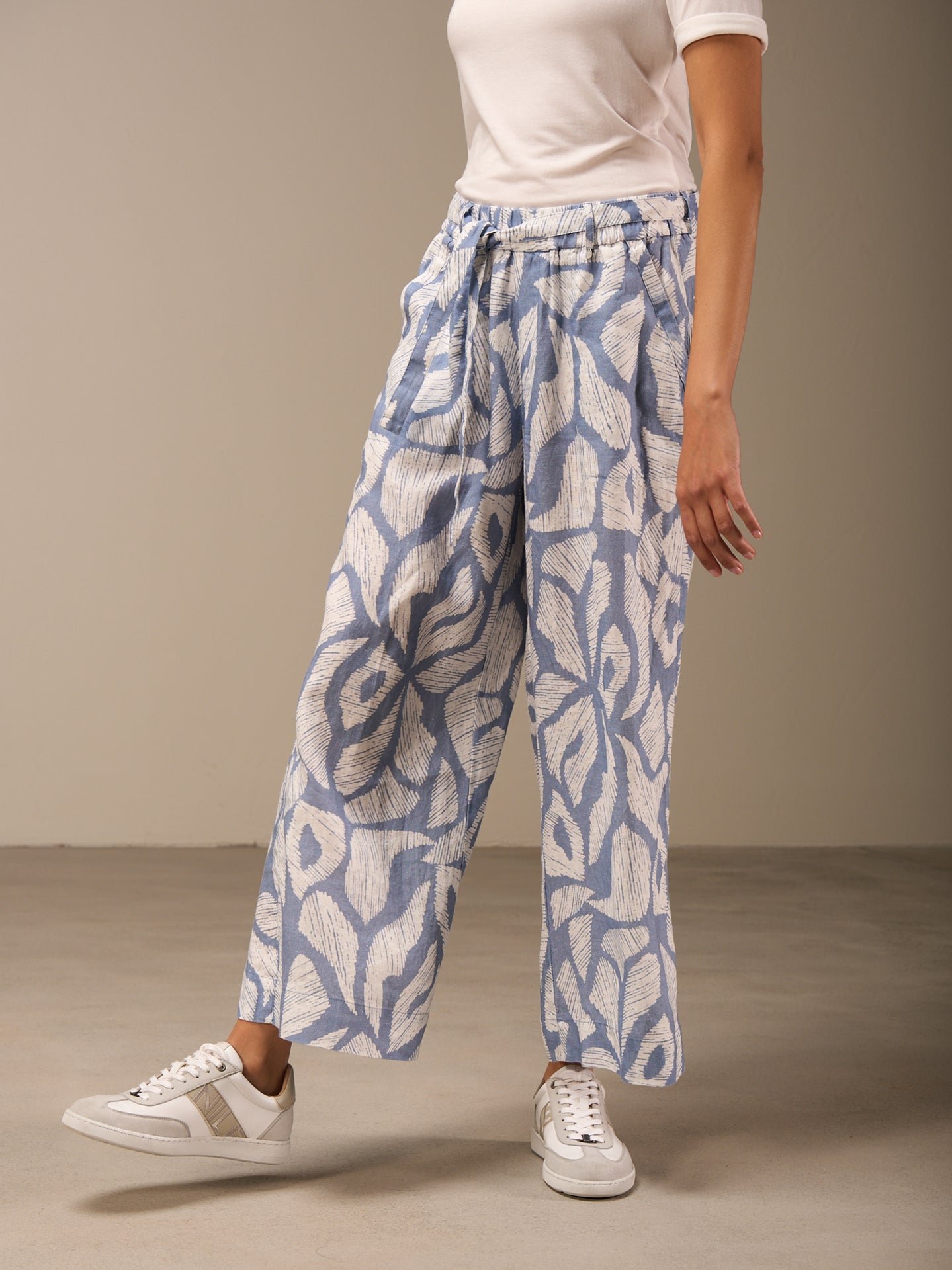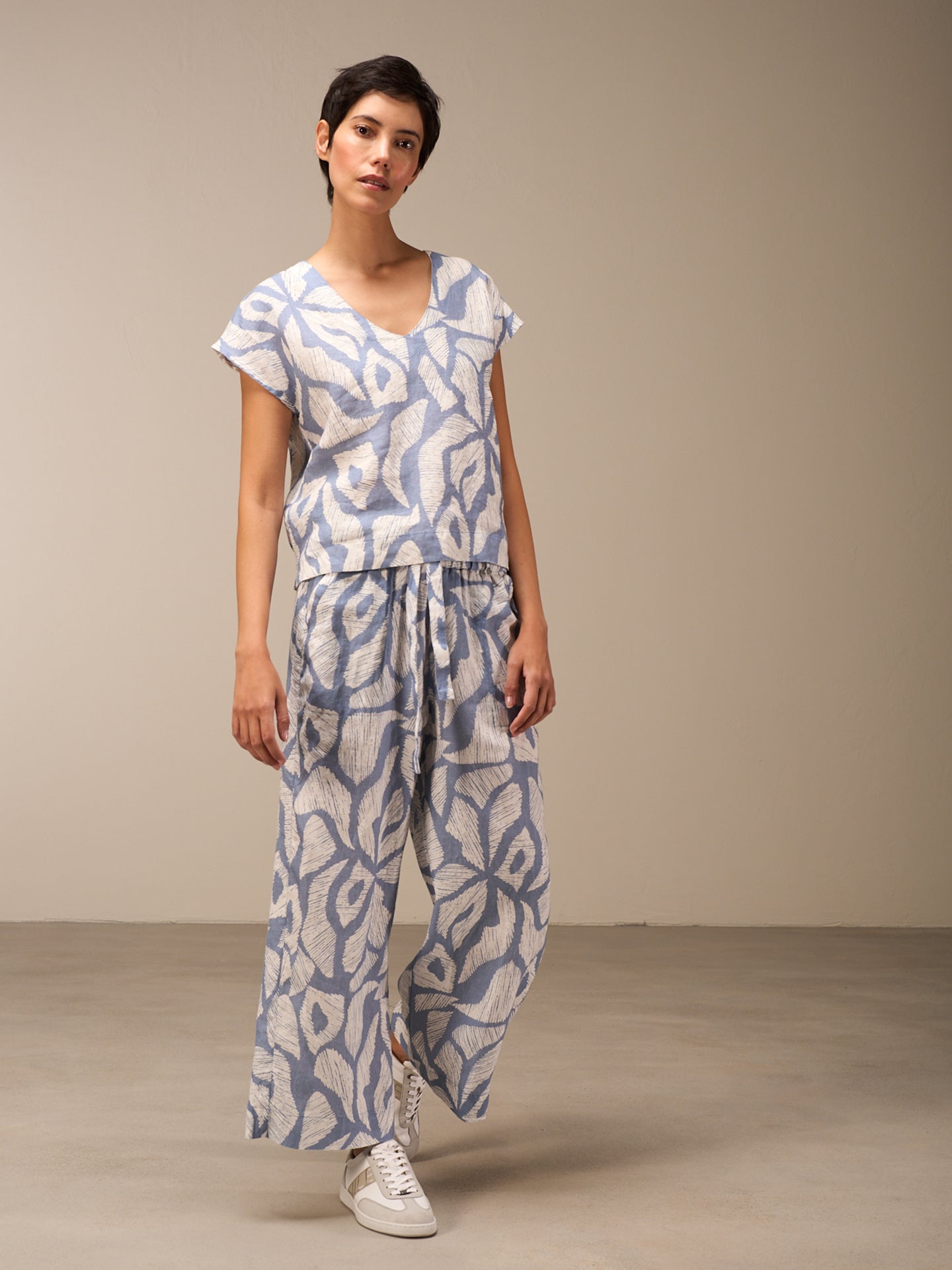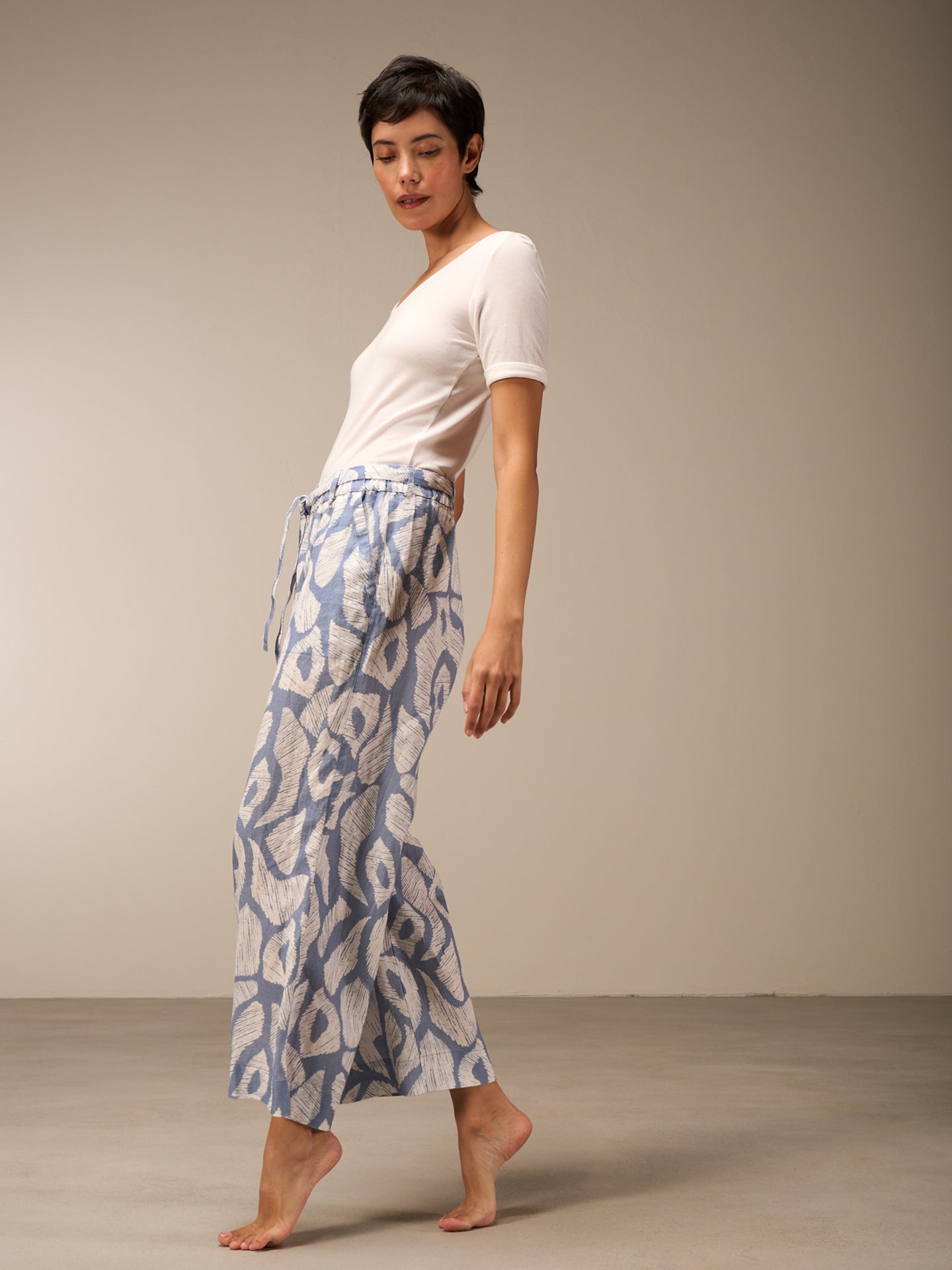 Luftige Hose mit weitem gerade geschnittenem Bein und elastischem Bund, mit Stoffgürtel und Gurtschlaufen. Die 100% Leinenqualität sorgt für Sommergefühle und den idealen Tragekomfort auch bei heissen Temperaturen.
