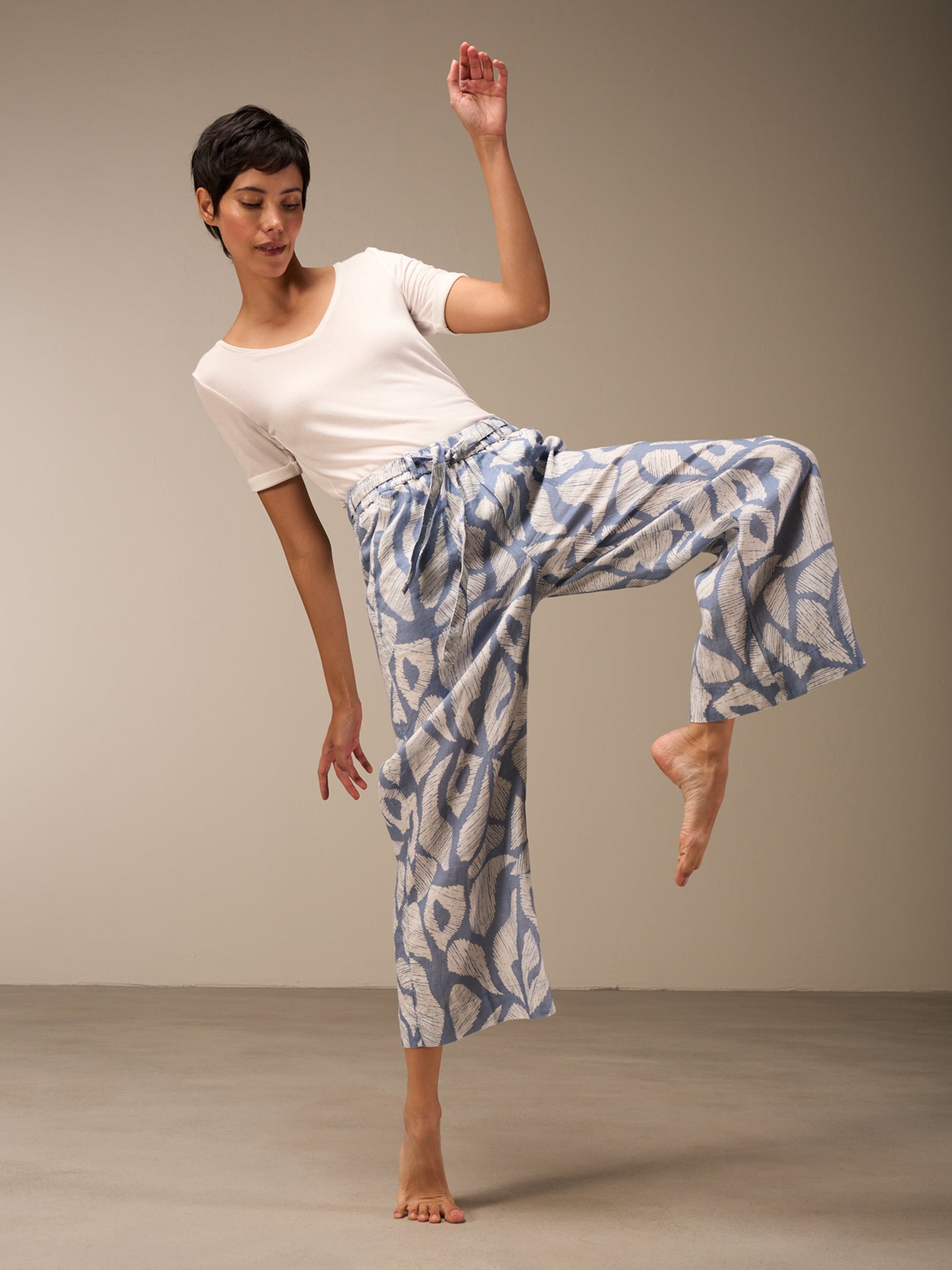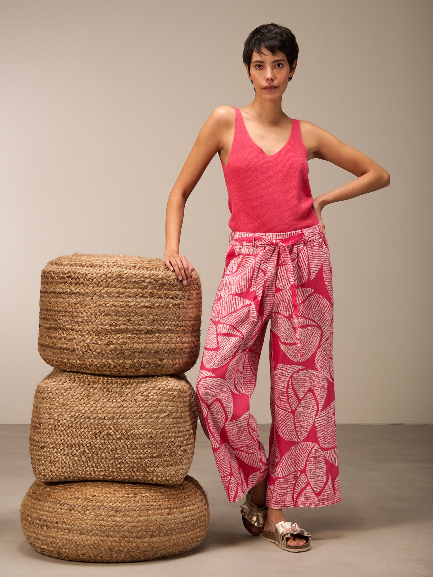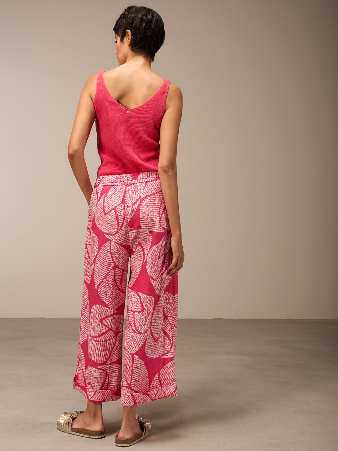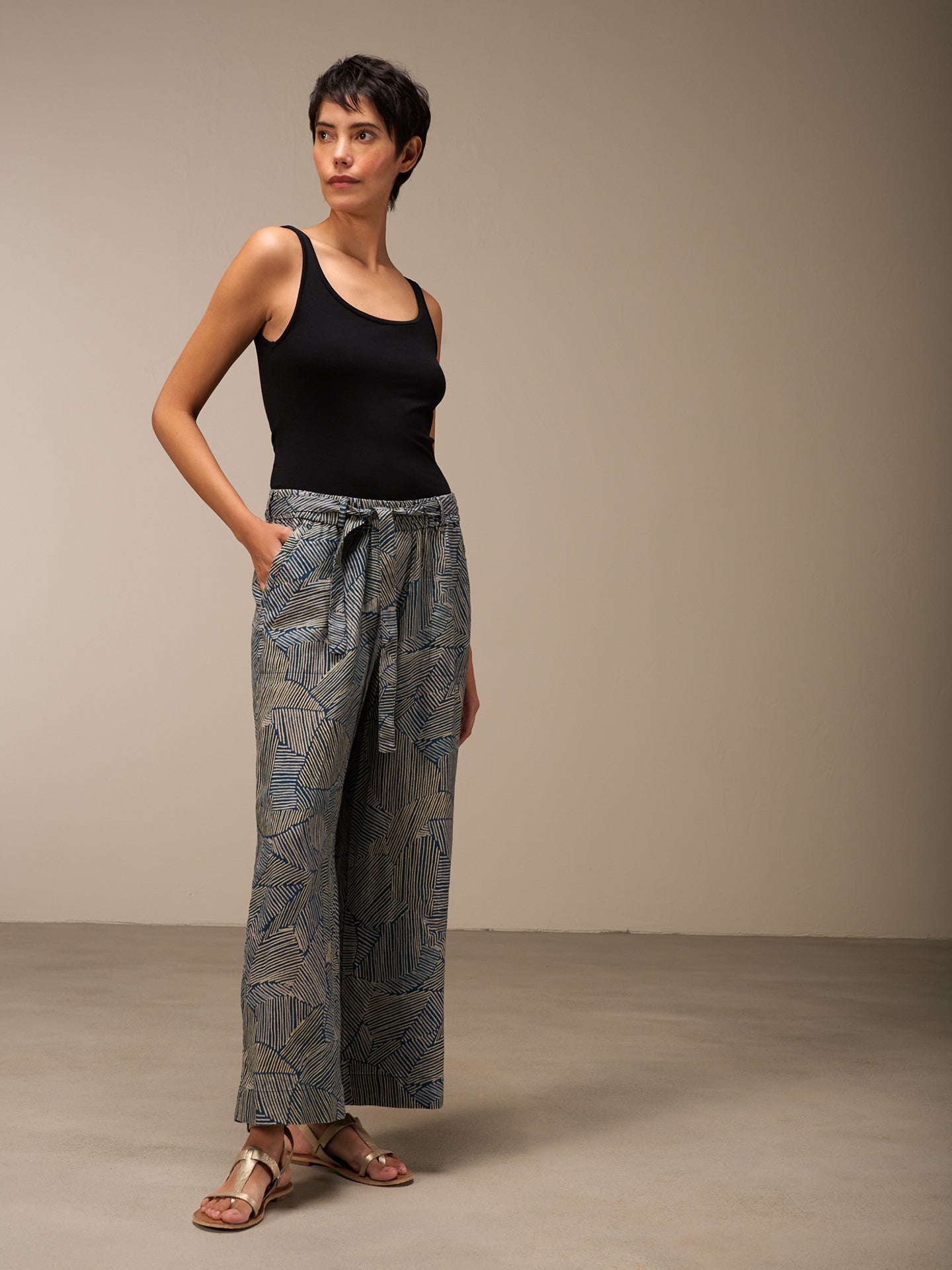 Luftige Hose mit weitem gerade geschnittenem Bein und elastischem Bund, mit Stoffgürtel und Gurtschlaufen. Die 100% Leinenqualität sorgt für Sommergefühle und den idealen Tragekomfort auch bei heissen Temperaturen.
