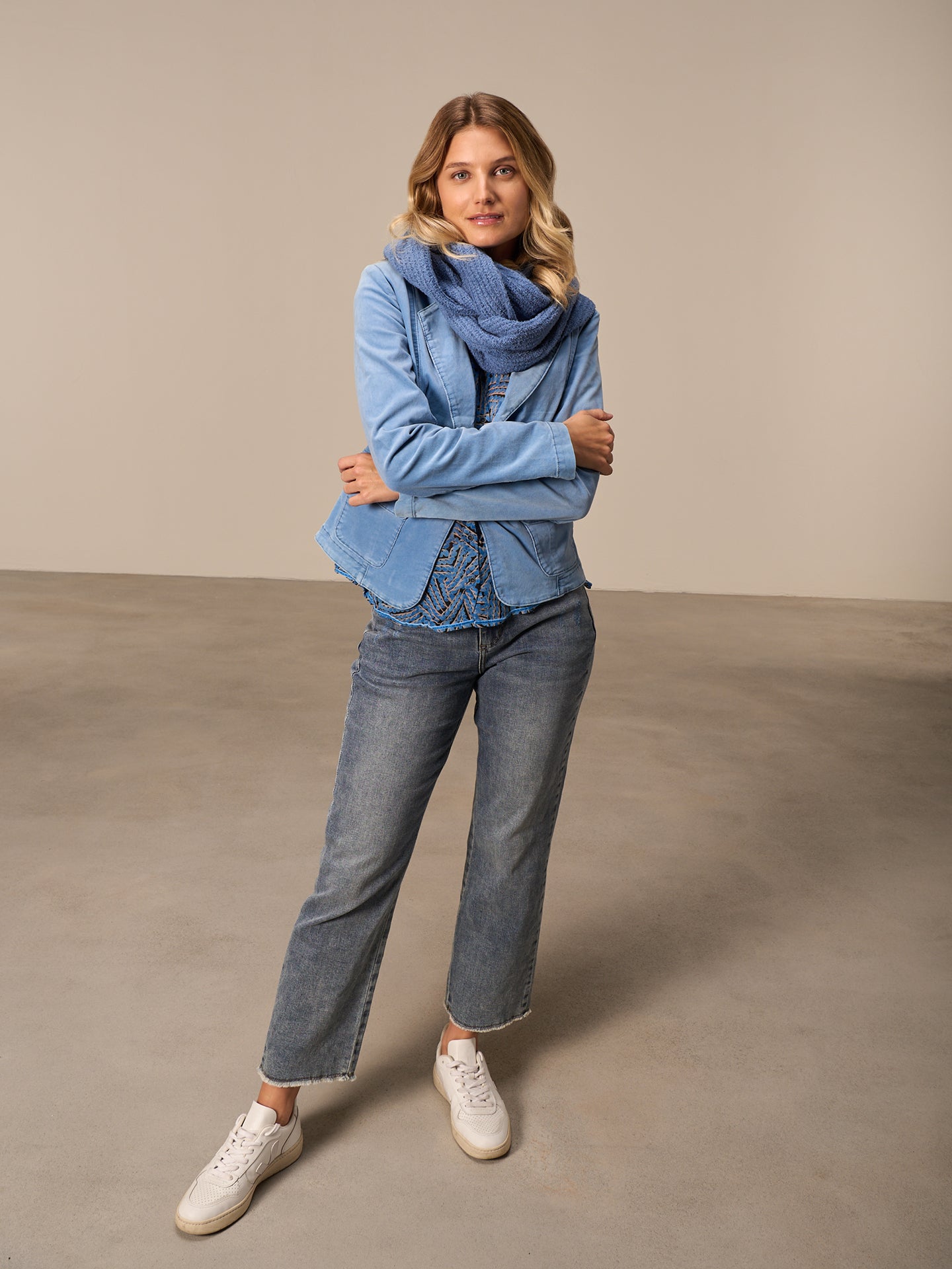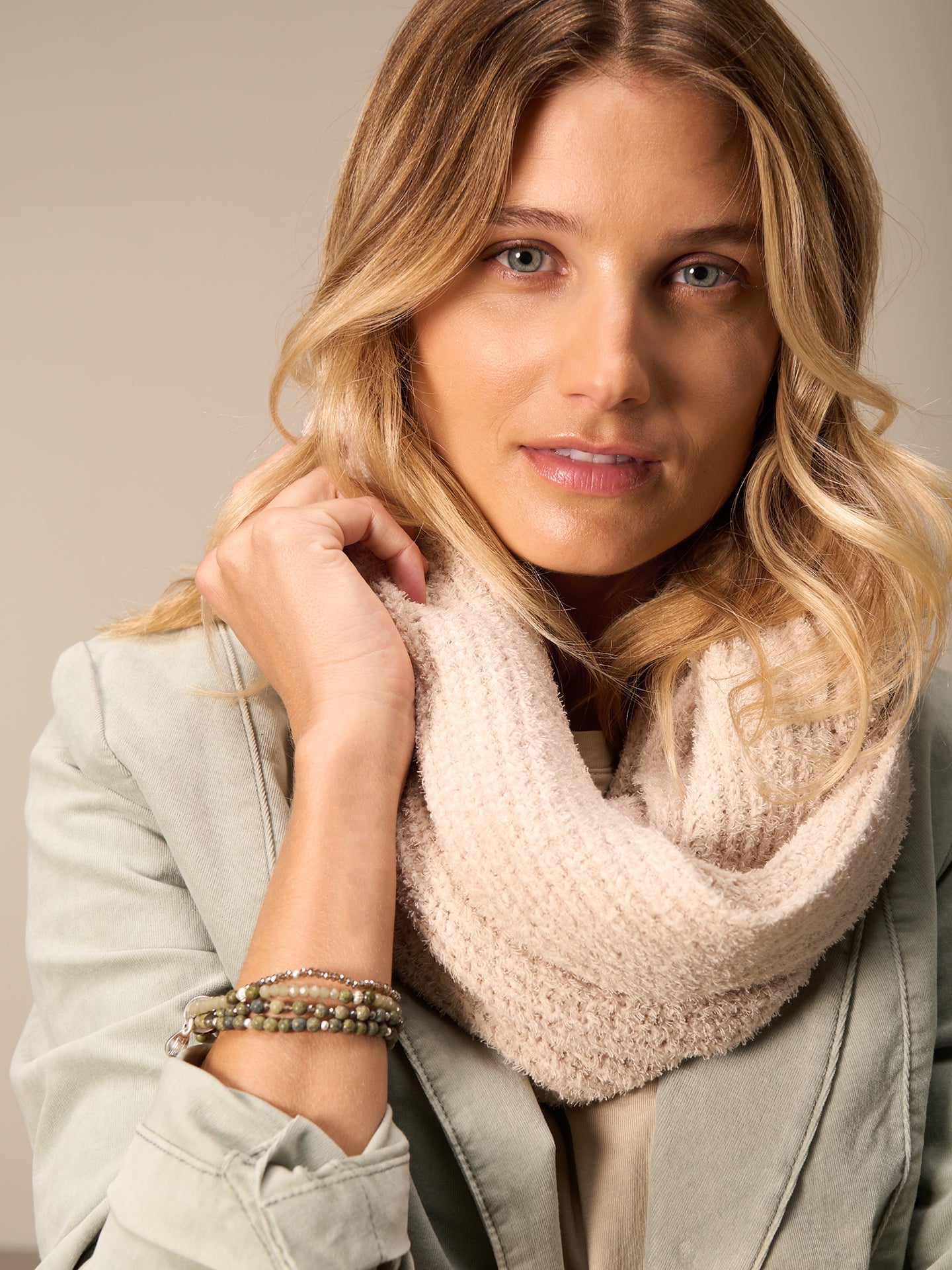 Ein im Patentmuster gestrickte Rundschal aus speziellem Frottee Garn. 80% Bio-Baumwolle aus zertifiziertem Anbau.