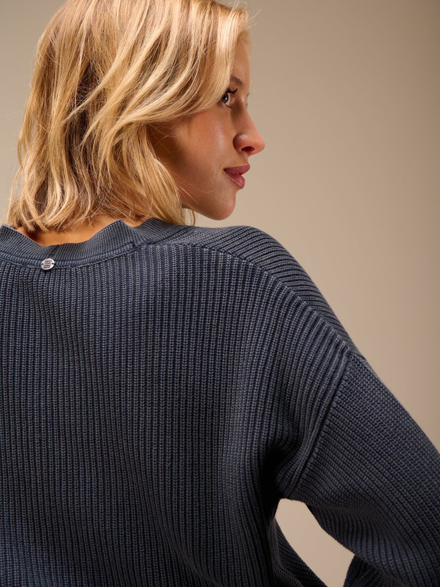 Locker geschnittene Strickjacke mit V-Ausschnitt in Ripp Optik und dekorativem Bund. Stückgefärbt. Unregelmässigkeiten in der Farbe machen das Stück einzigartig. Der Ausbleicheffekt wird verstärkt.