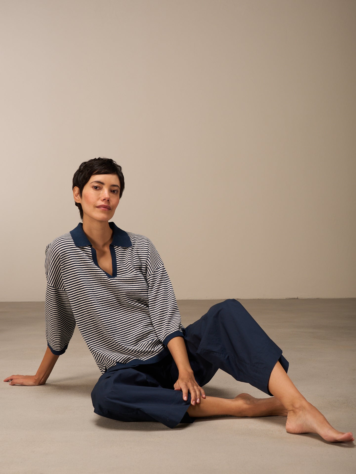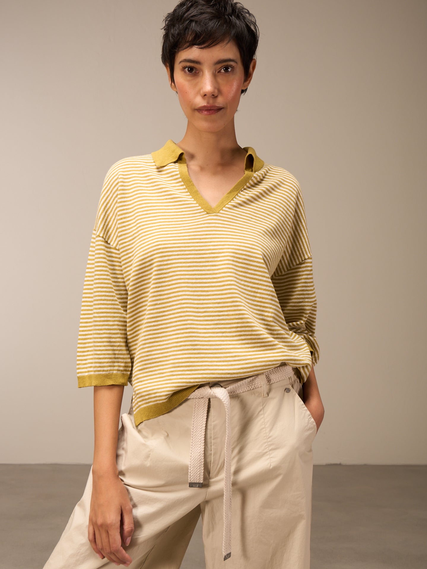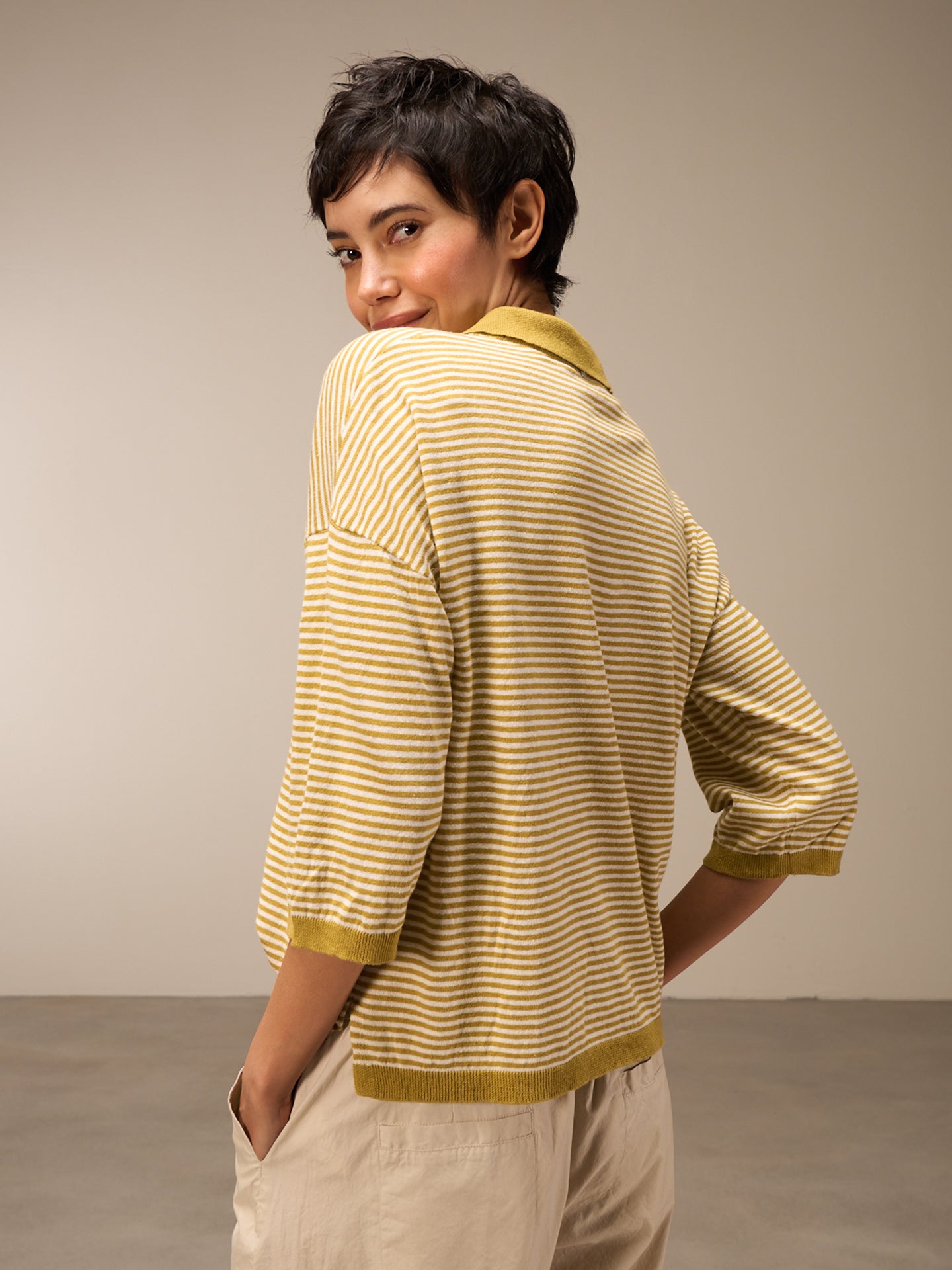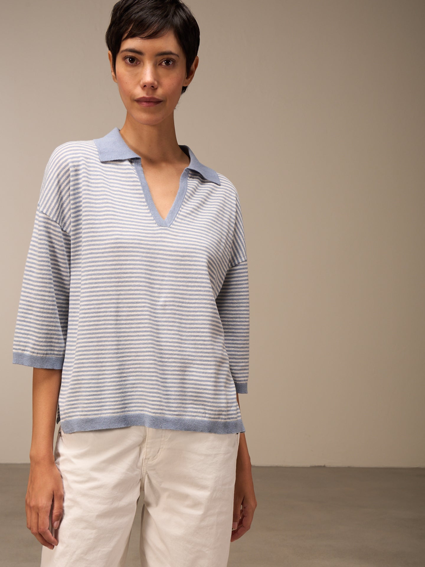 Lockerer 3/4-Arm Pullover im Patentmuster mit überschnittener Schulter, stylishem Polokragen und einer speziellen Rippenborte an Saum und Ärmeln. Die Streifen verleihen dem Pullover eine sportlich-lässige Note.