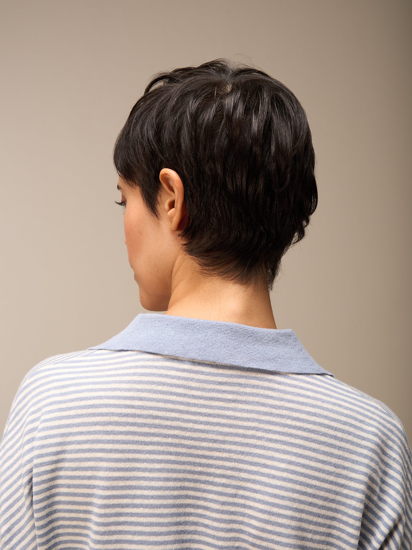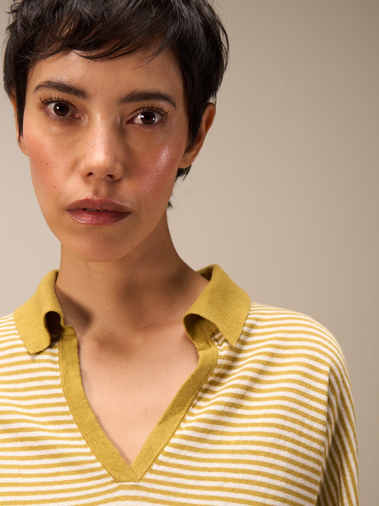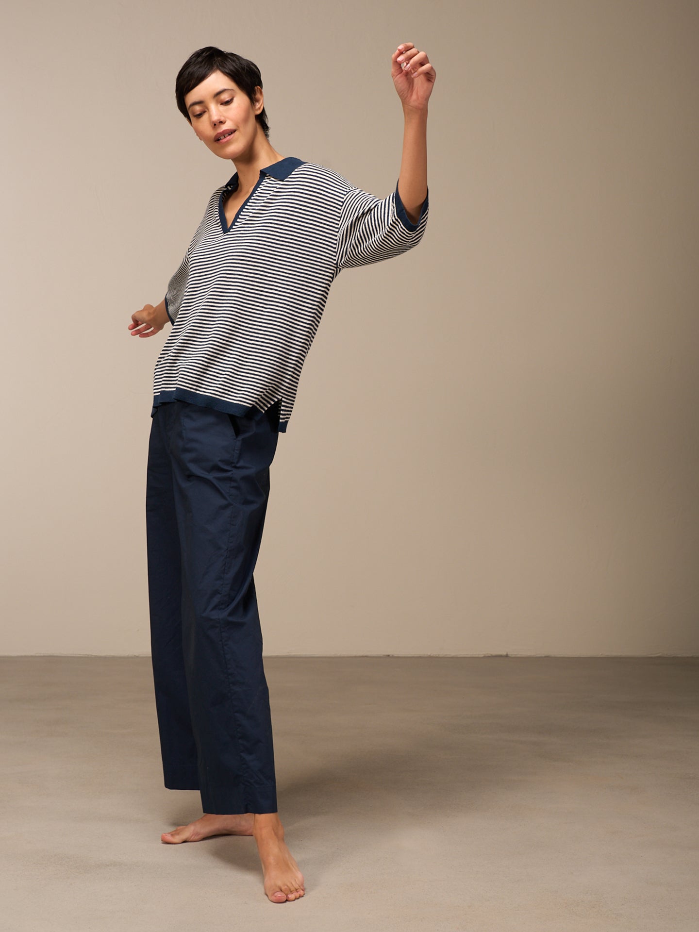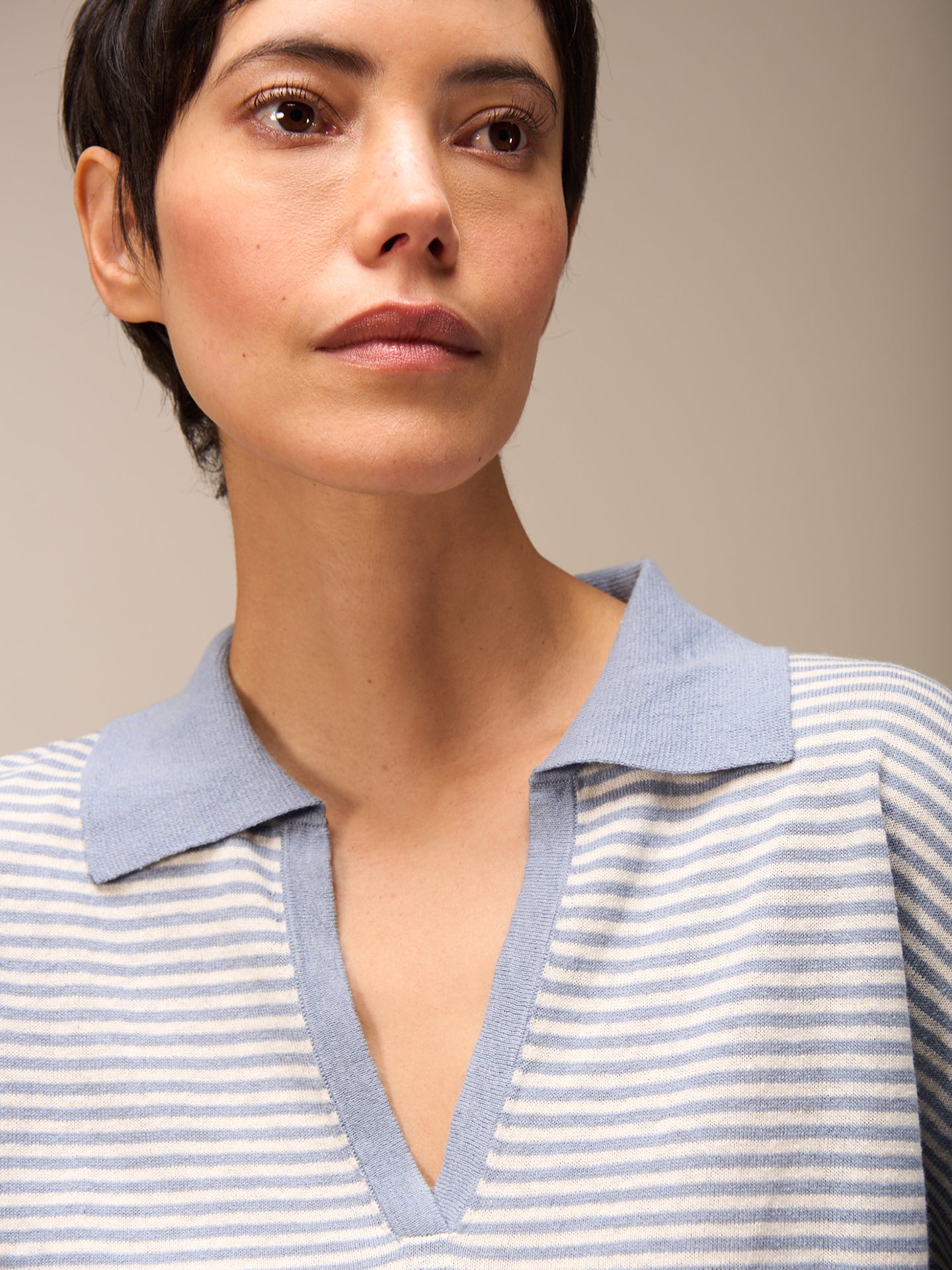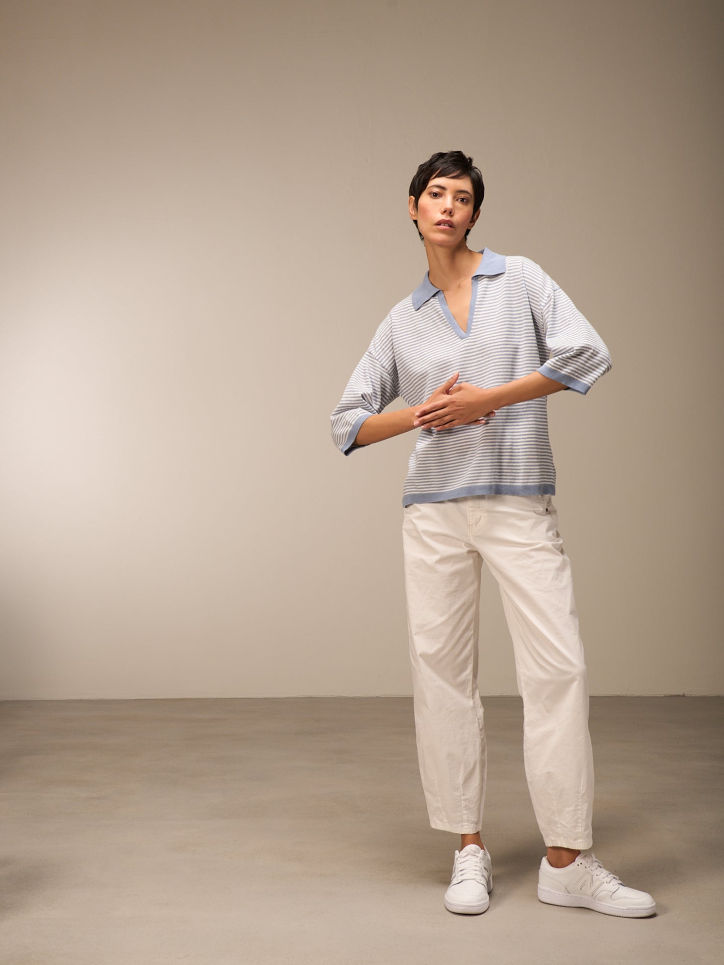 Lockerer 3/4-Arm Pullover im Patentmuster mit überschnittener Schulter, stylishem Polokragen und einer speziellen Rippenborte an Saum und Ärmeln. Die Streifen verleihen dem Pullover eine sportlich-lässige Note.