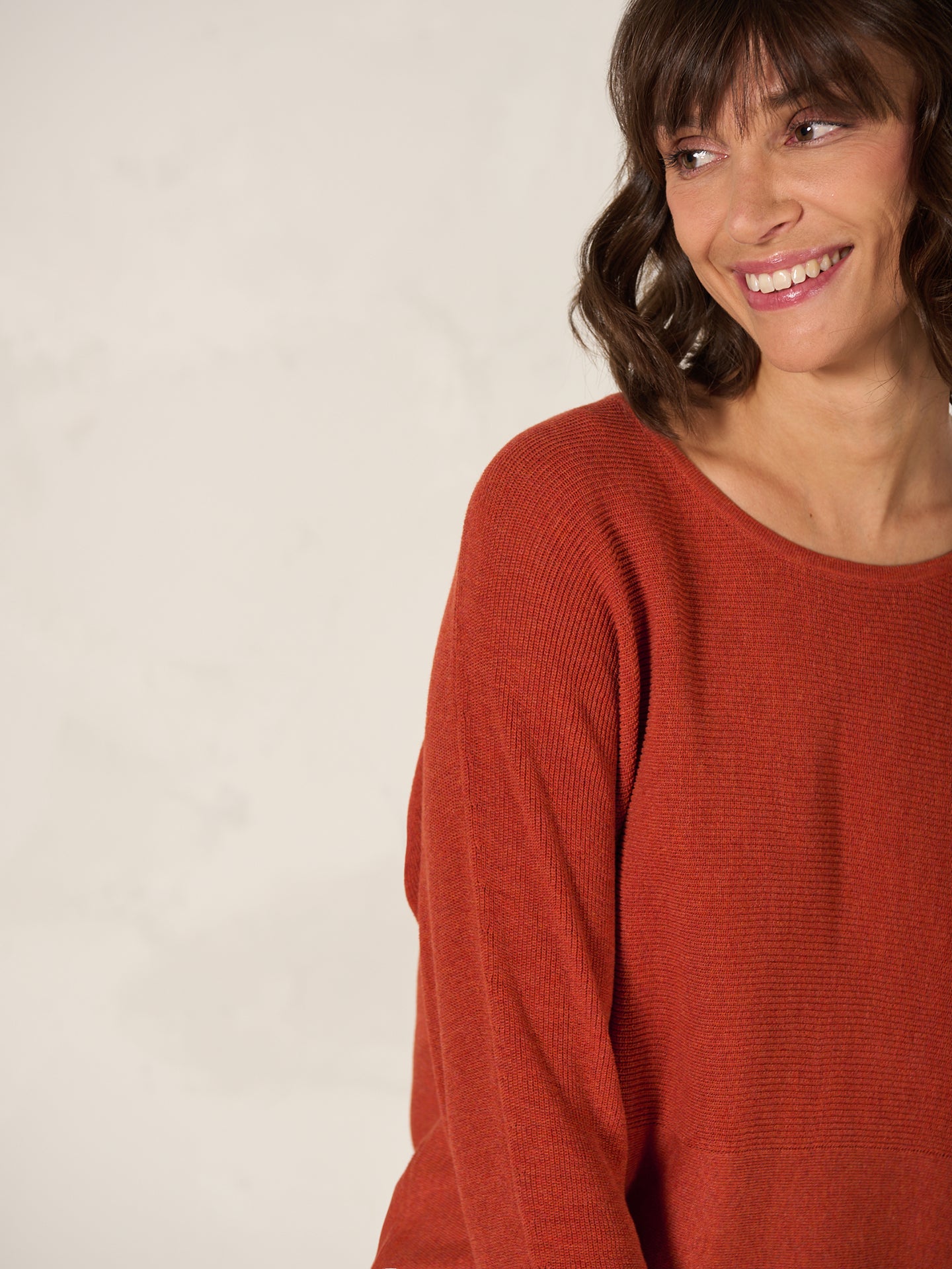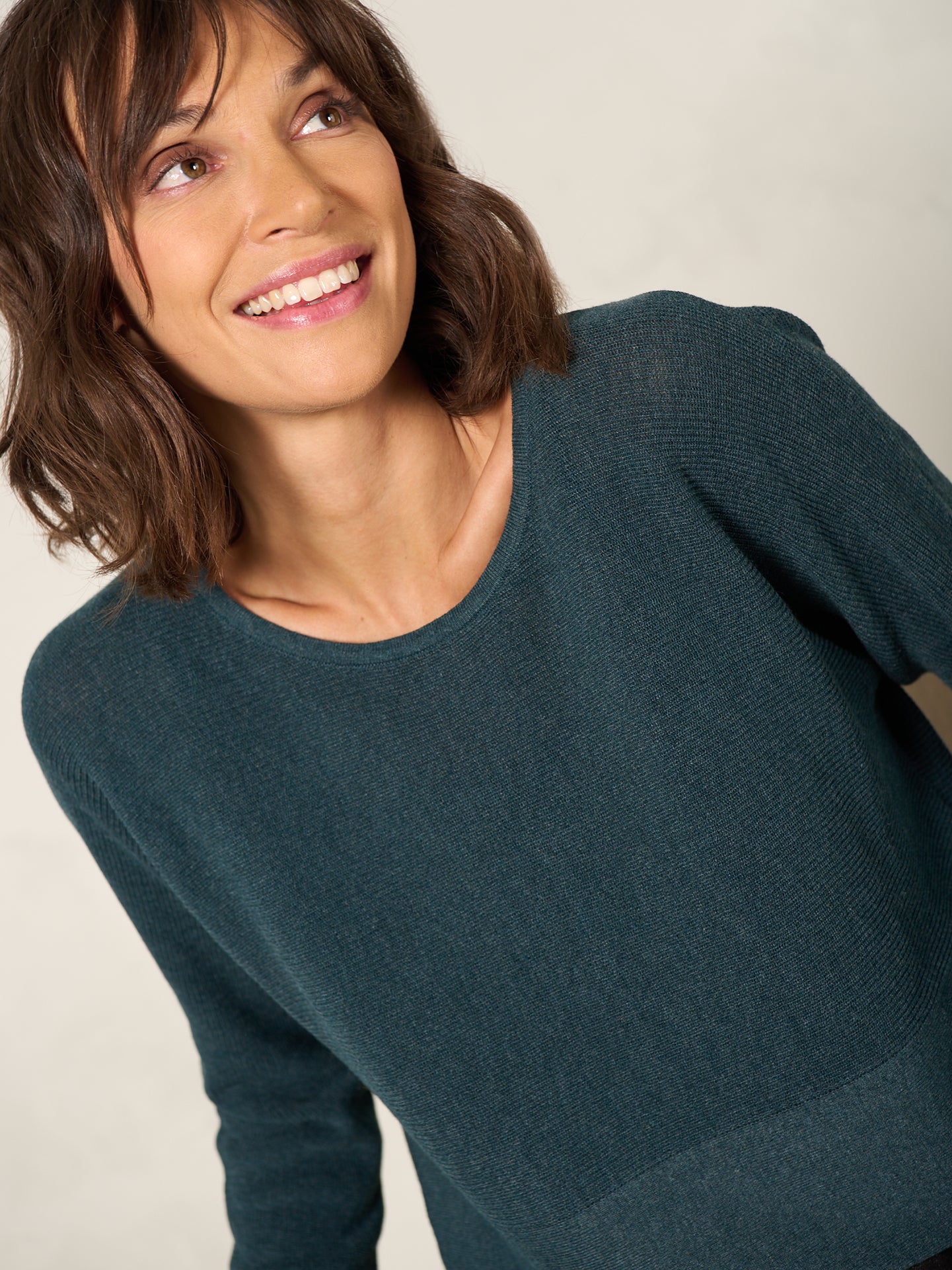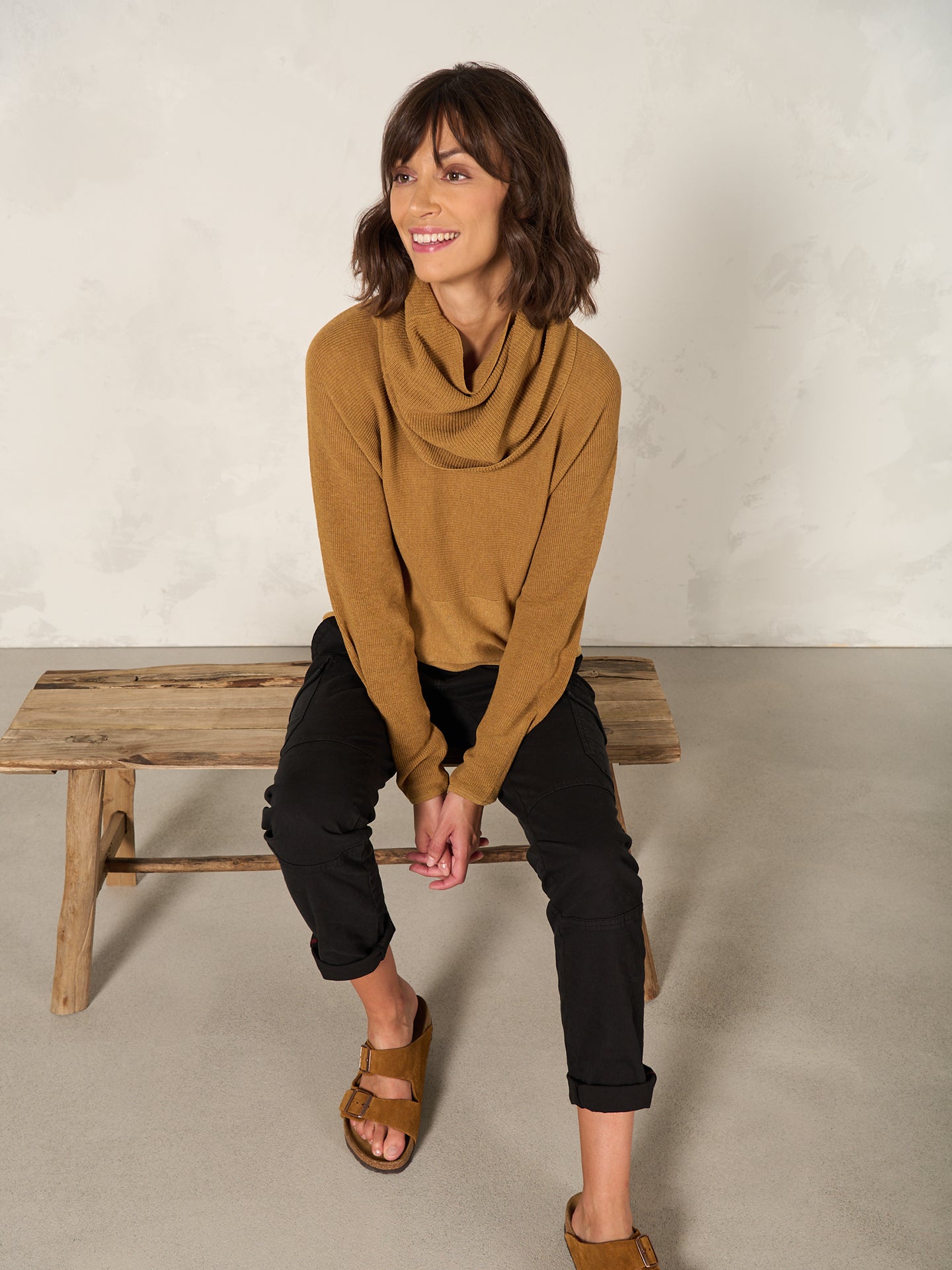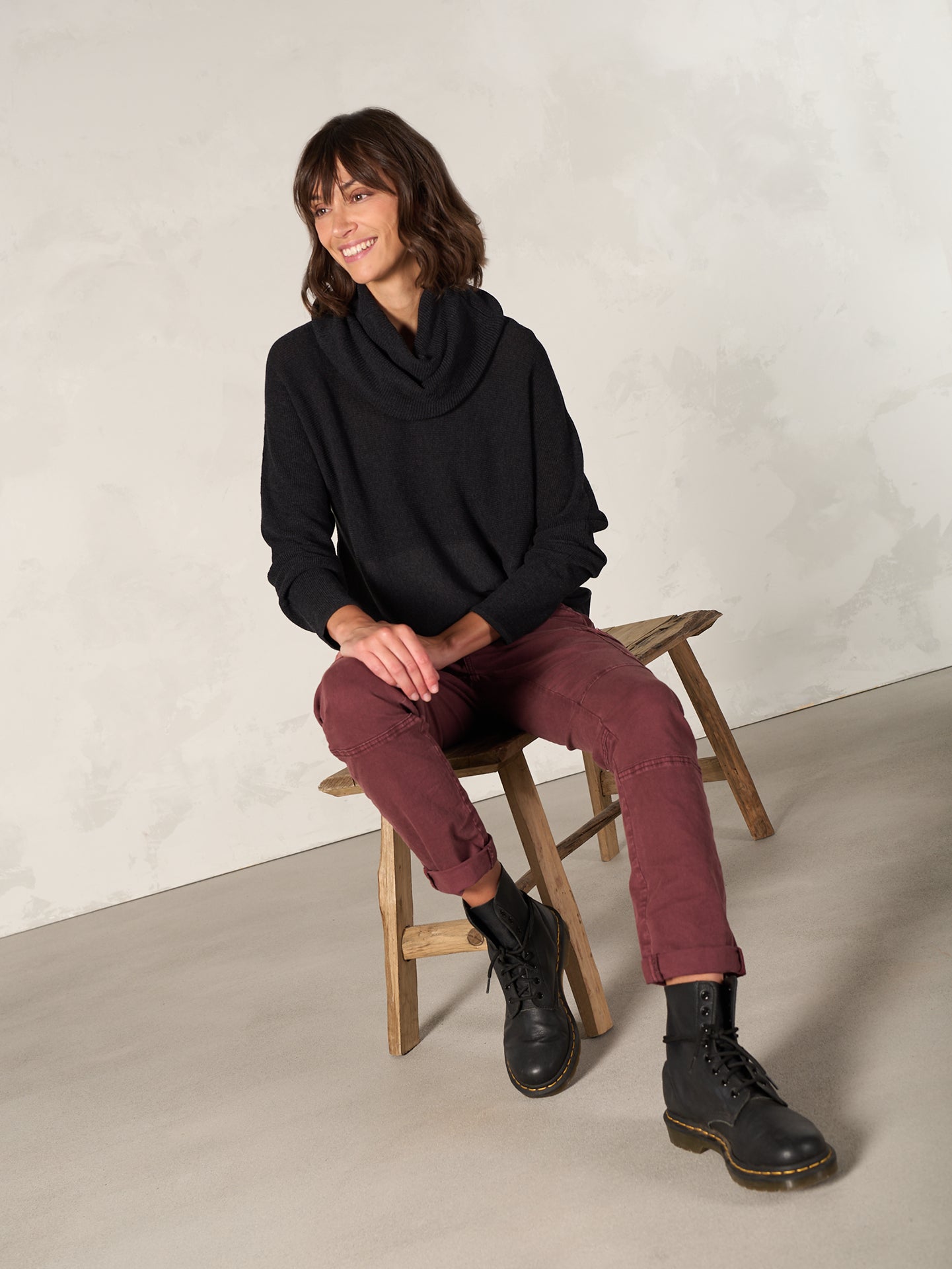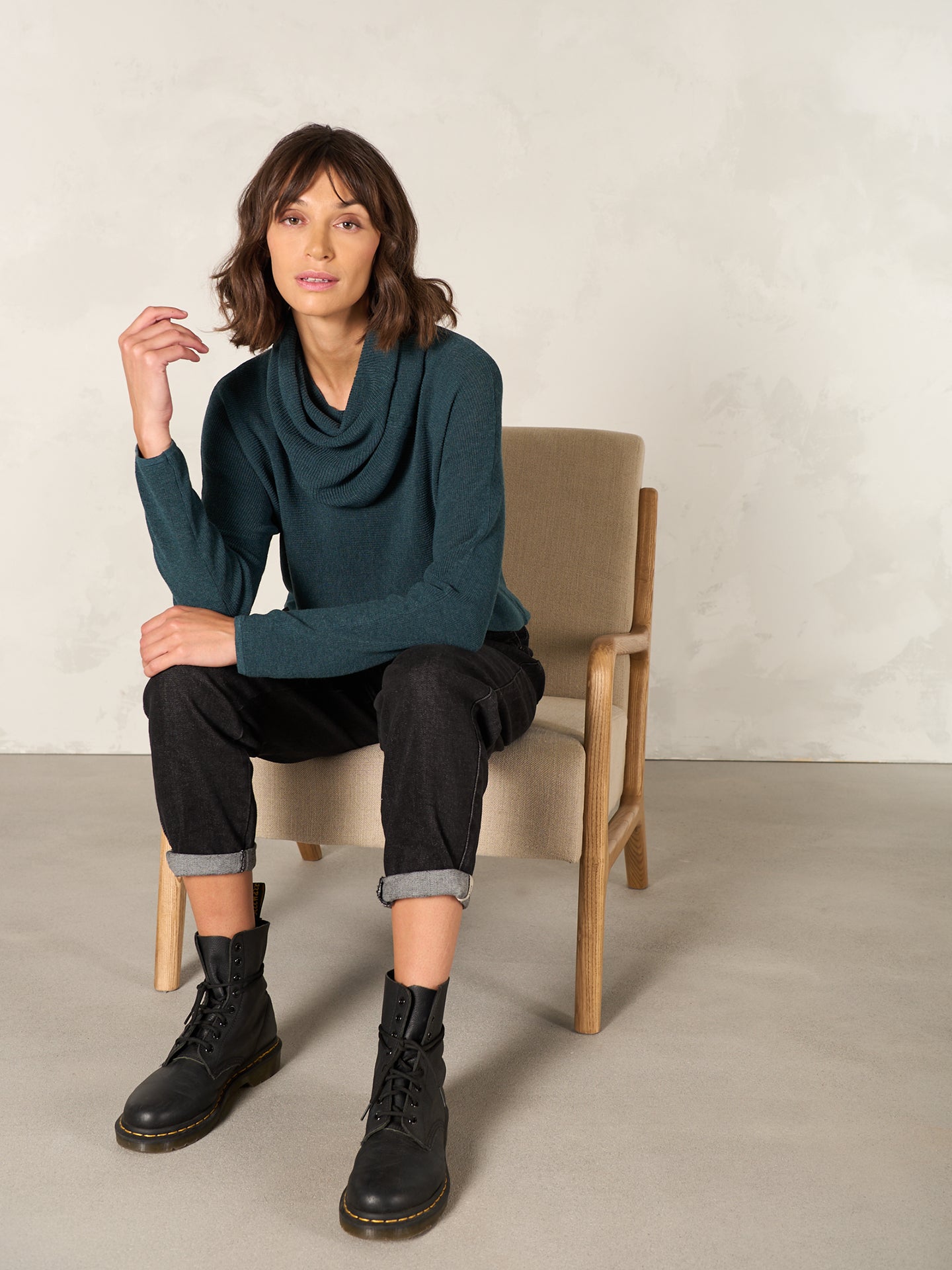 Leichter Pullover mit spannendem Strickmustermix, angeschnittenem Fledermausärmel und separatem Kragen. 60% Bio-Baumwolle aus zertifiziertem Anbau und 40% recyceltes Polyester.