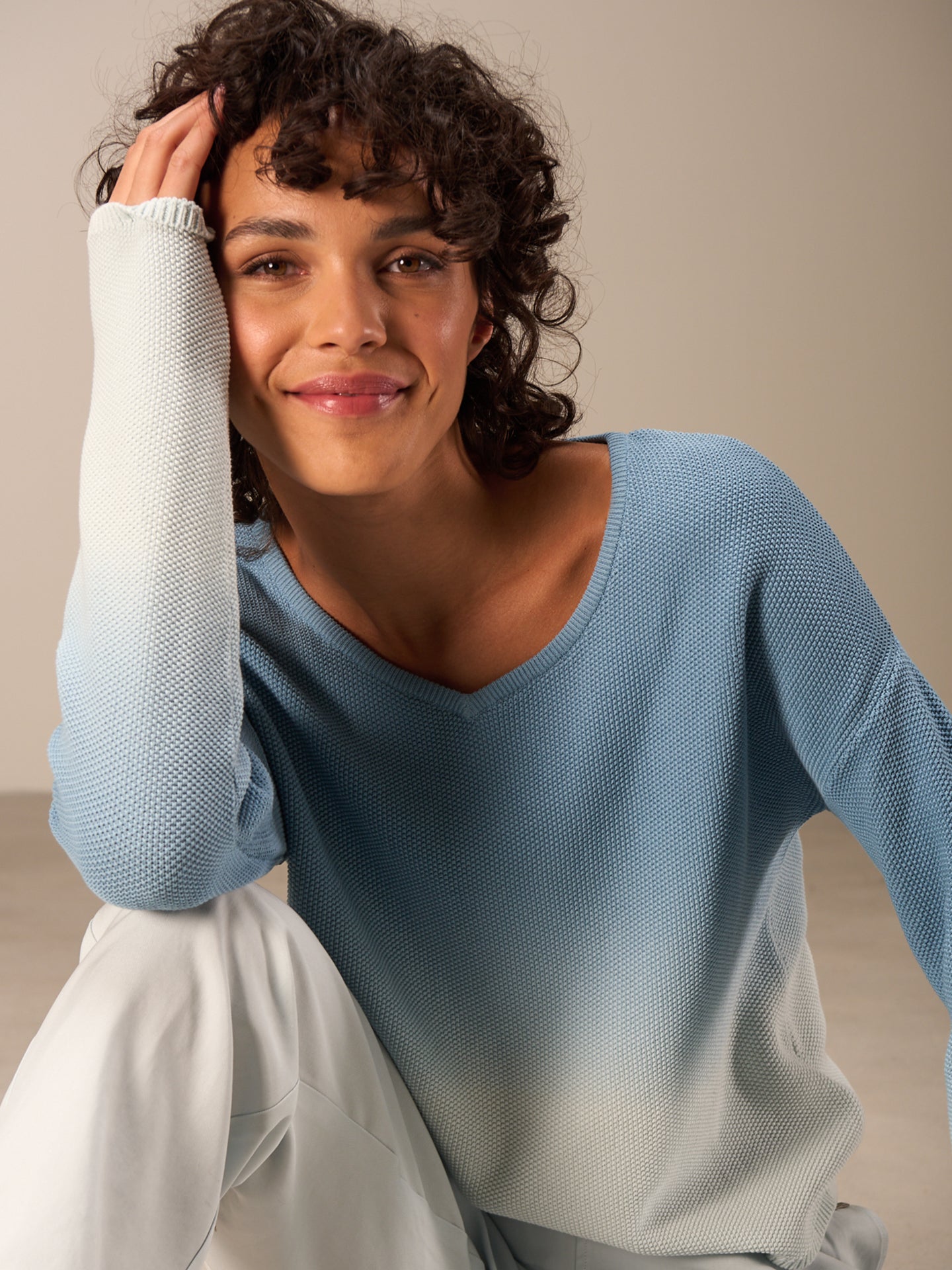 Locker geschnittener Strickpulli mit Perlmuster und leichtem V-Ausschnitt. Aus 100% GOTS zertifizierter Bio-Baumwollqualität.
