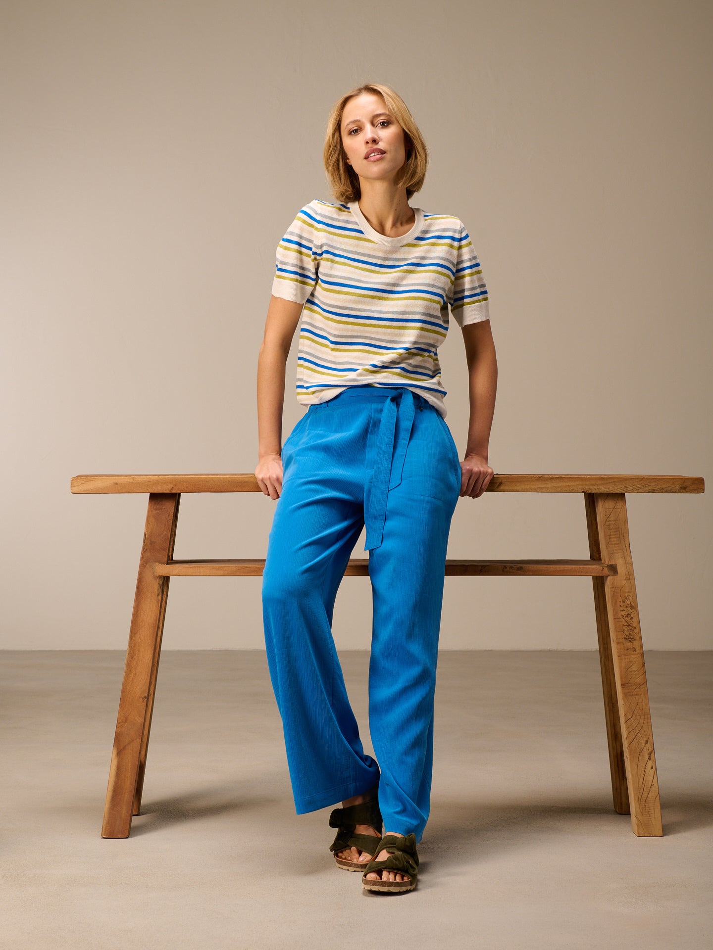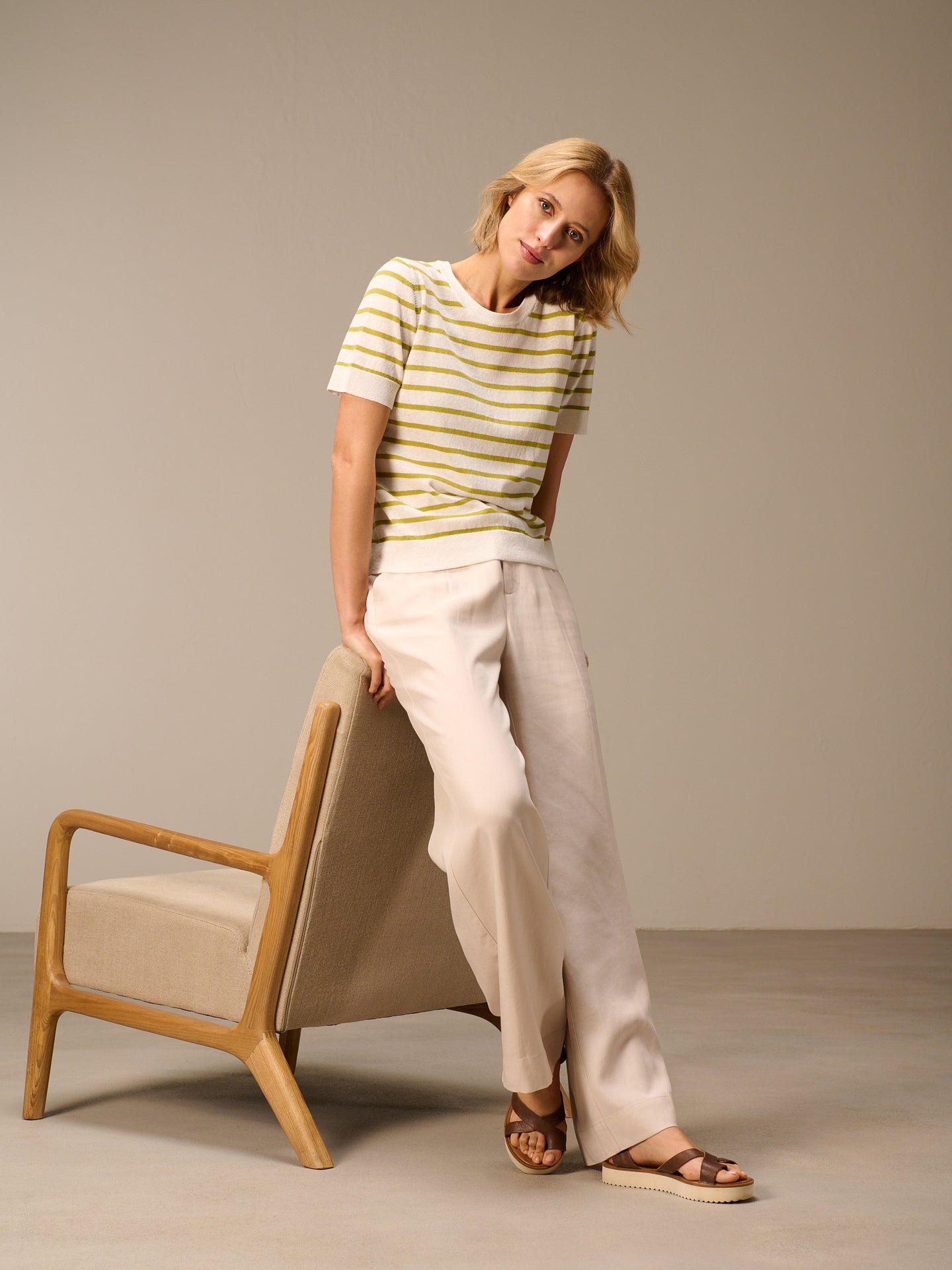 Schmal geschnittener Kurzarmpullover in edler Feinstrickoptik mit Rundhalskragen und trendigen Streifenmuster. Für einen hohen Tragekomfort sorgt die hochwertige Leinen- und Baumwollmischung.