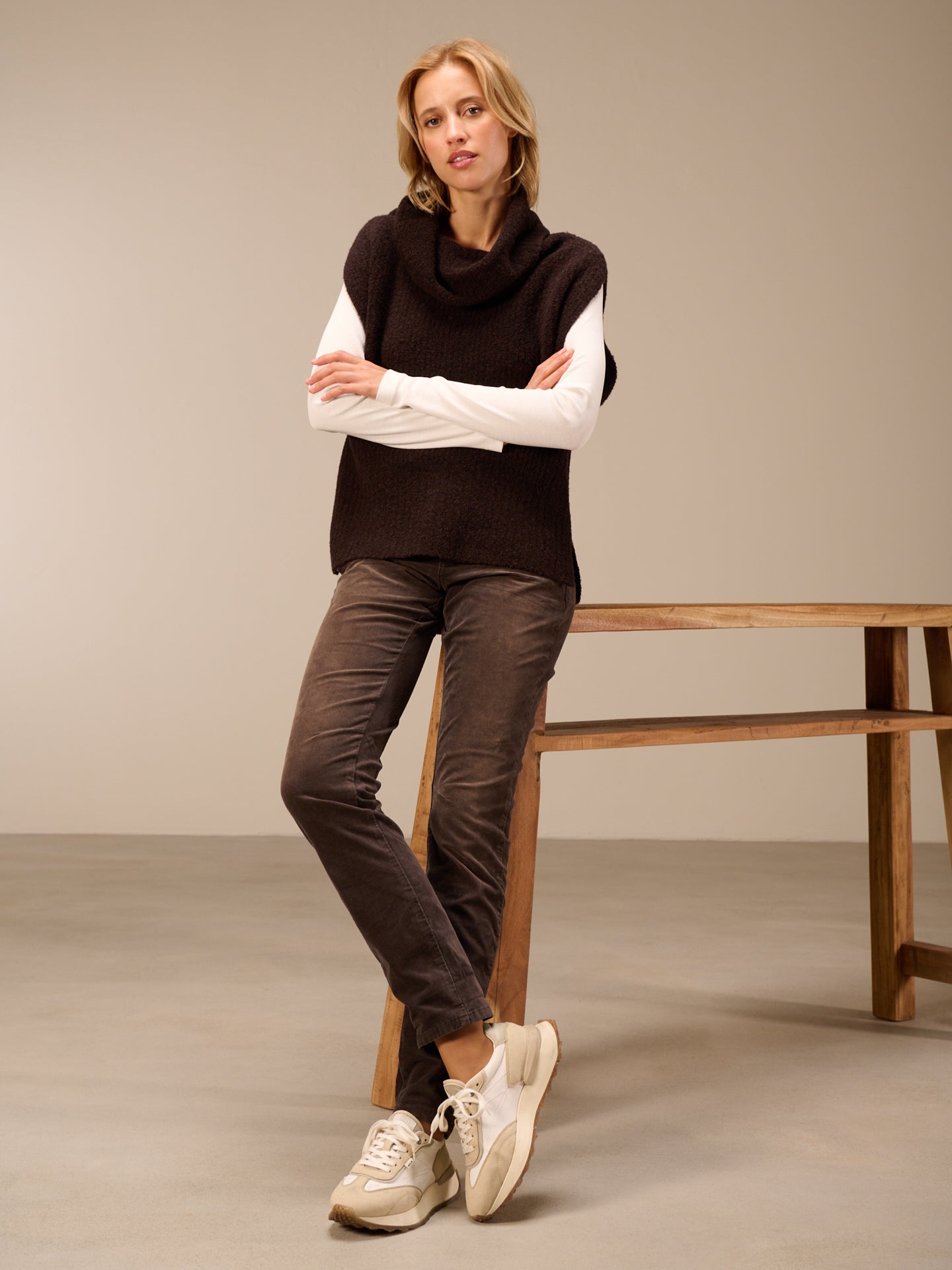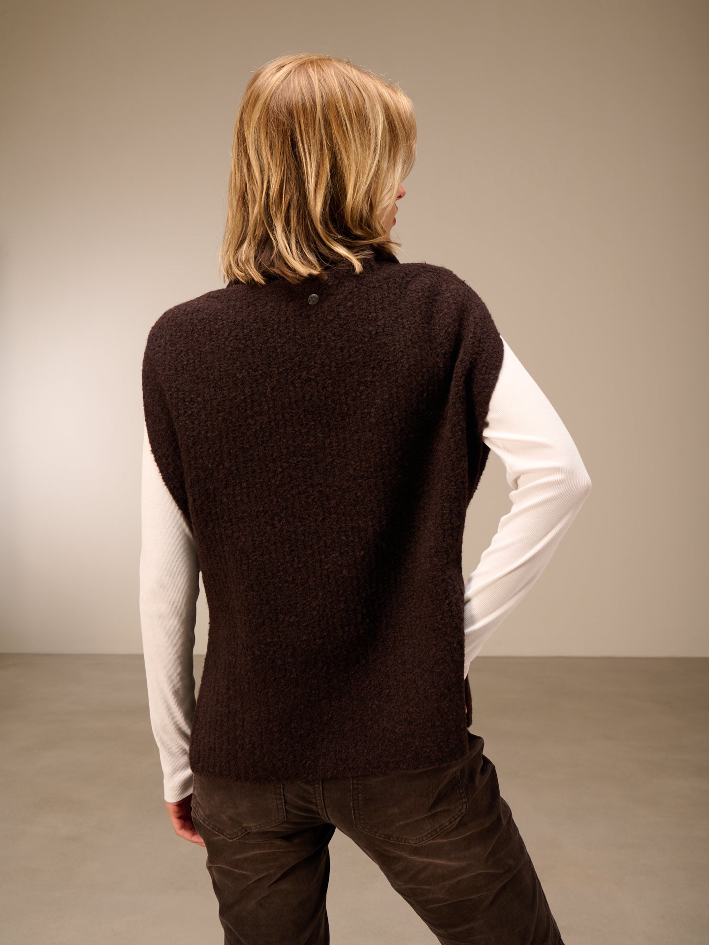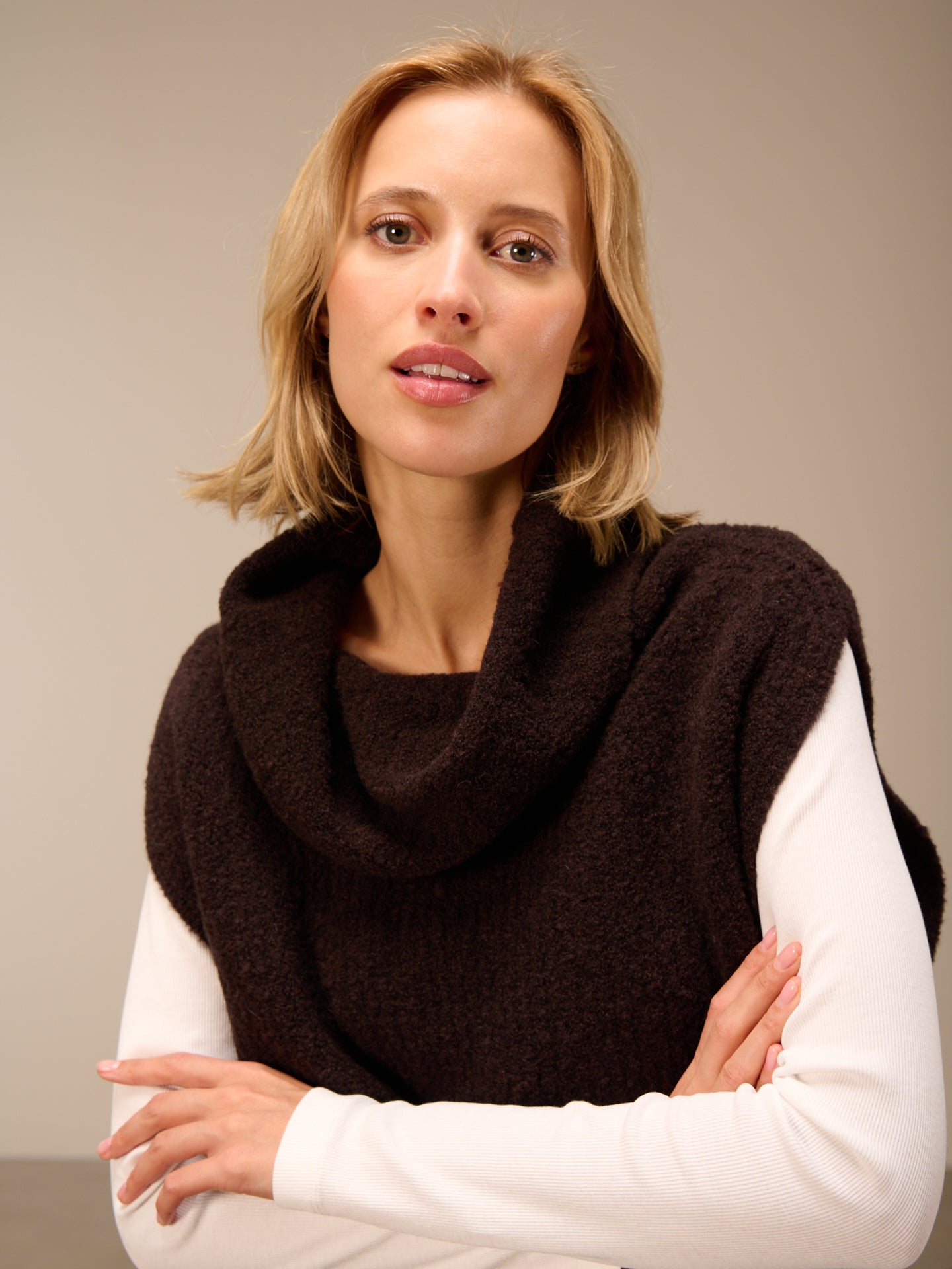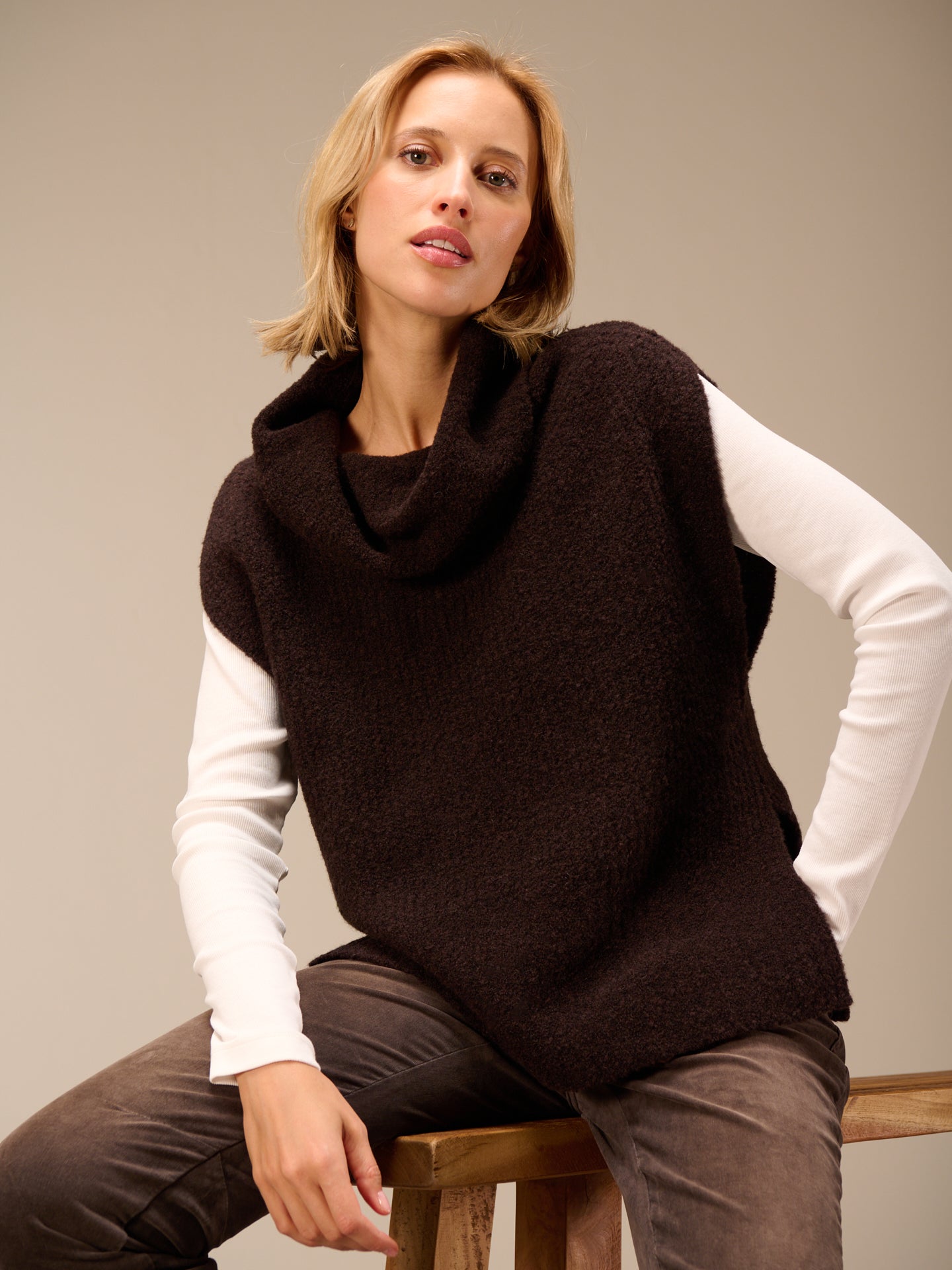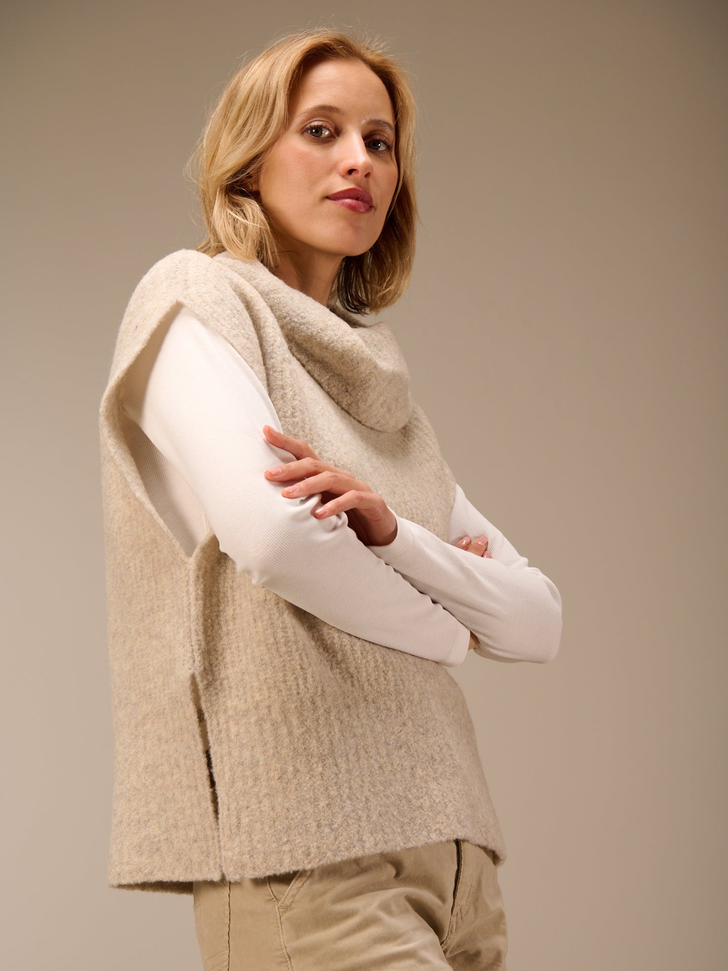 Ärmelloser Strickpullover mit weitem Rollkragen und Rippenborte aus Bouclé Garn.