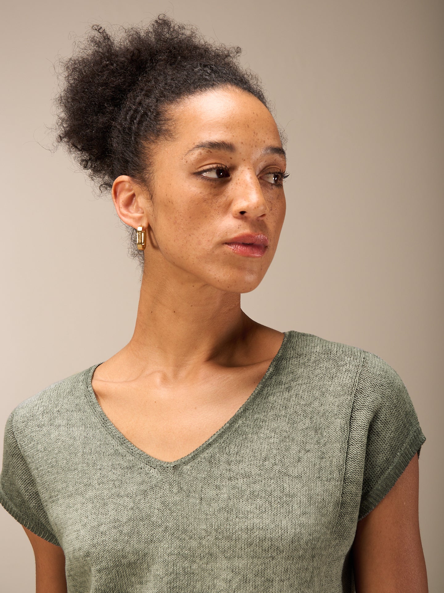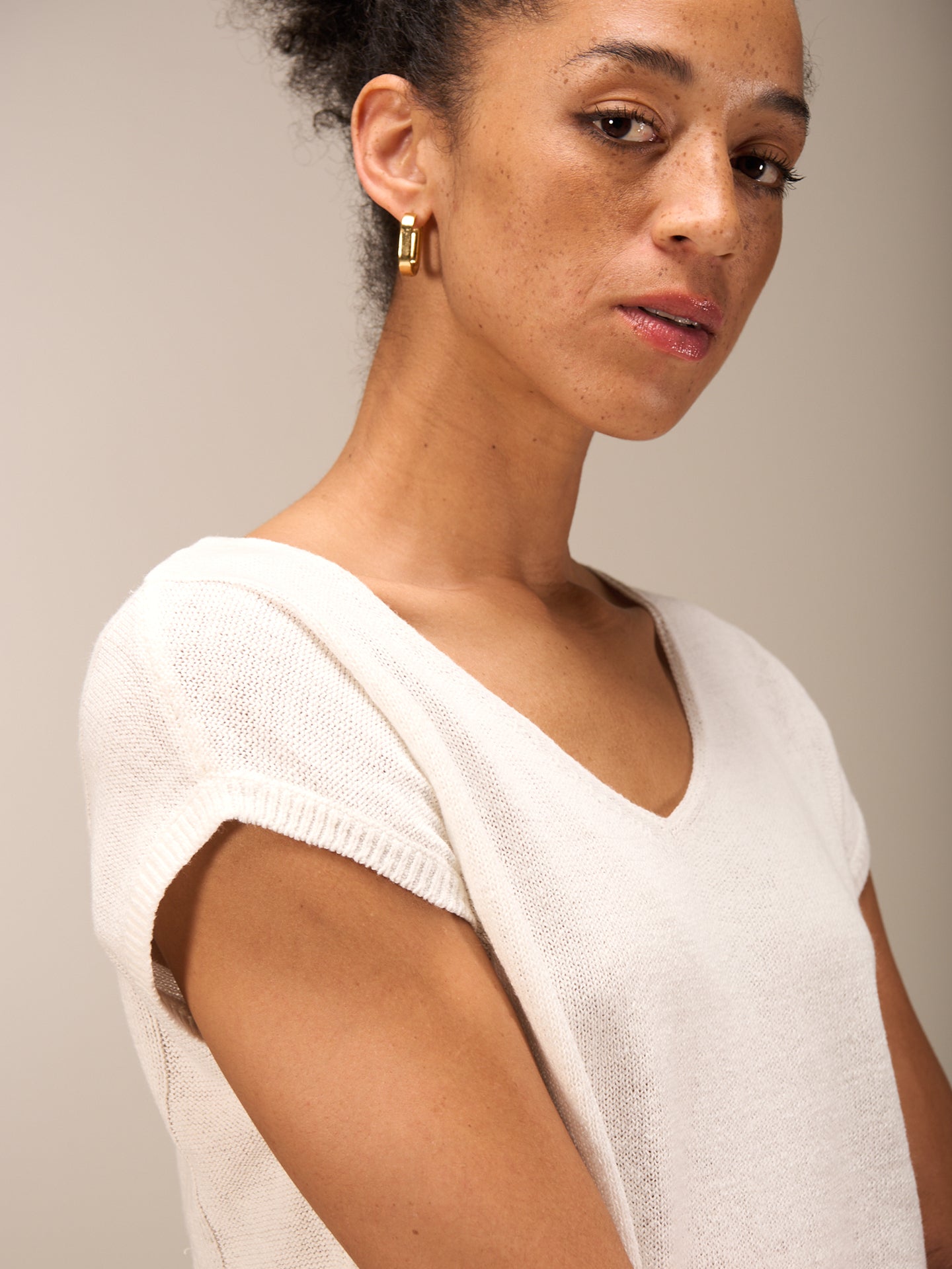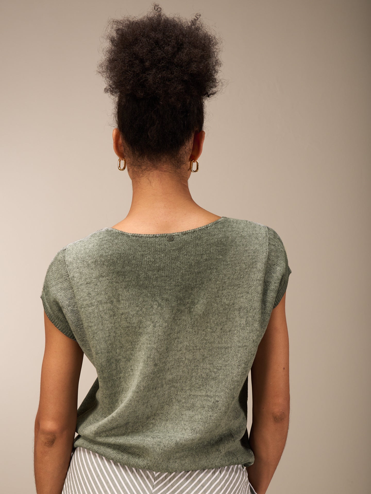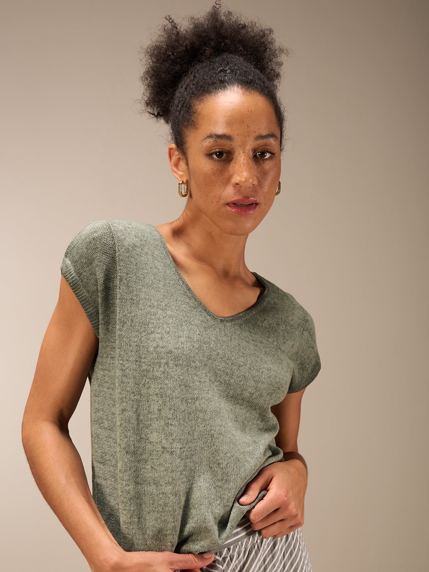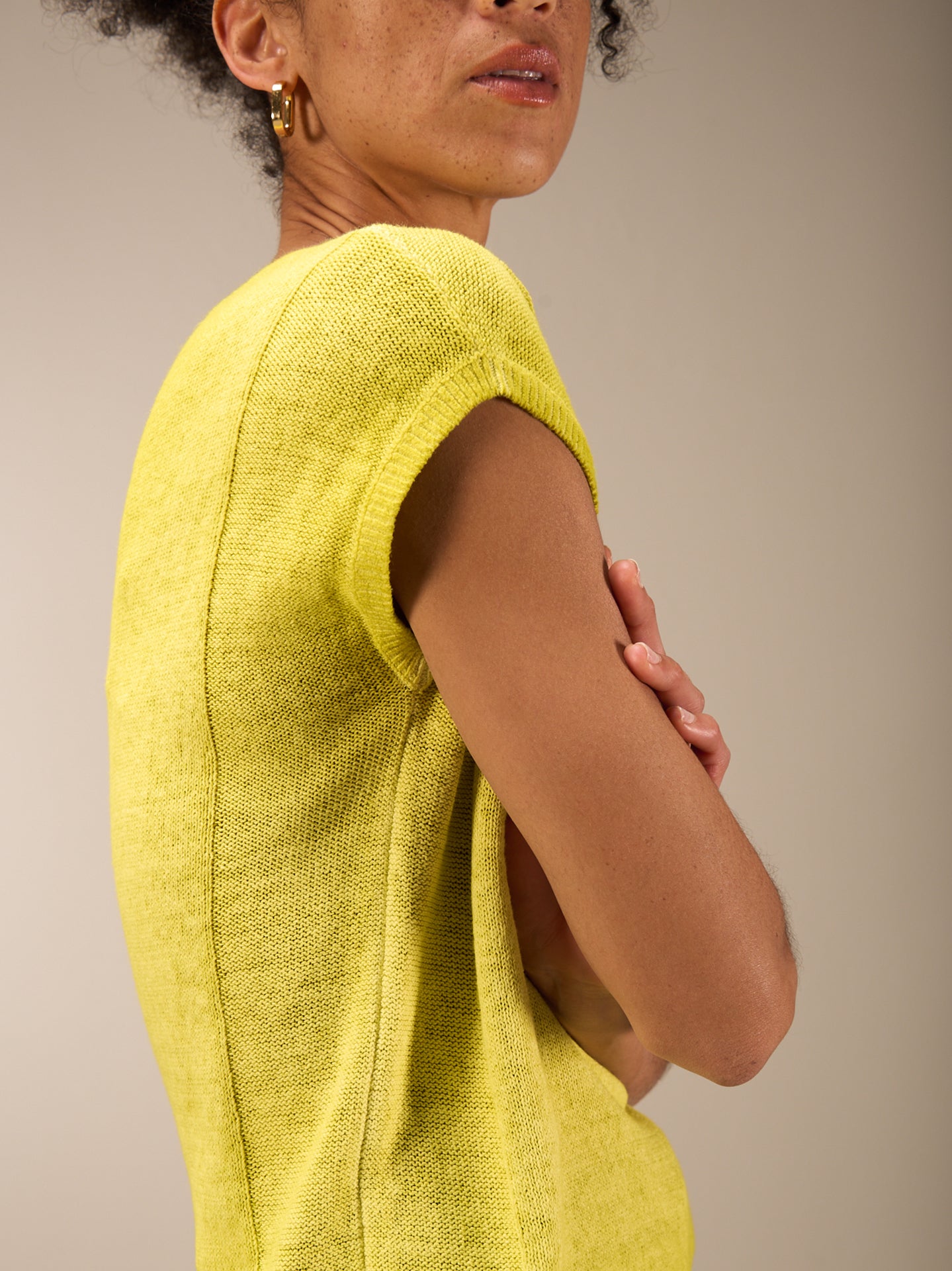 Ärmelloser Pullunder mit überschnittener Schulter und hohem V-Ausschnitt und einem spannenden Strickmuster an der Seite. Durch ein spezielles inwendiges Färbeverfahren erhält das Teil einen schönen Look. Unregelmässigkeiten in der Farbe machen das Stück einzigartig. Der Ausbleicheffekt wird verstärkt. Für einen hohen Tragekomfort sorgt die Leinen-Baumwollequalität.