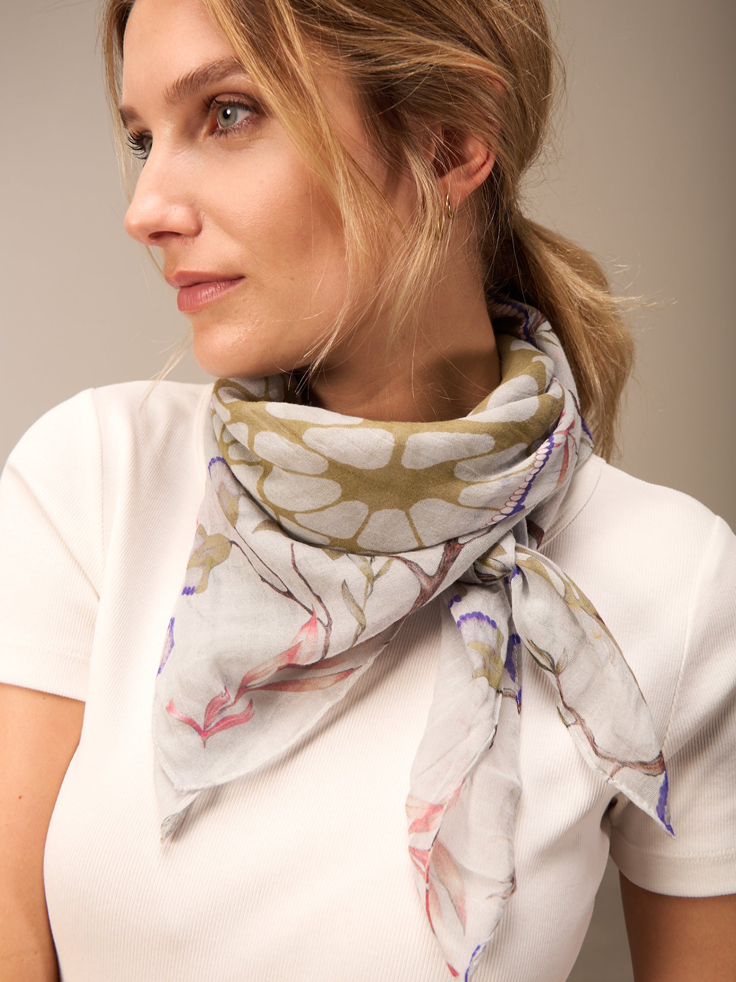 Lässiger Schal in der Grösse 90 x 90 cm wertet jedes Outfit im Nu auf und wird so zu einem Lieblingsaccessoire. Der Schal ist vollflächig bedruckt, die Kanten abgesteppt und aus 100% Bio-Baumwolle aus zertifiziertem Anbau.