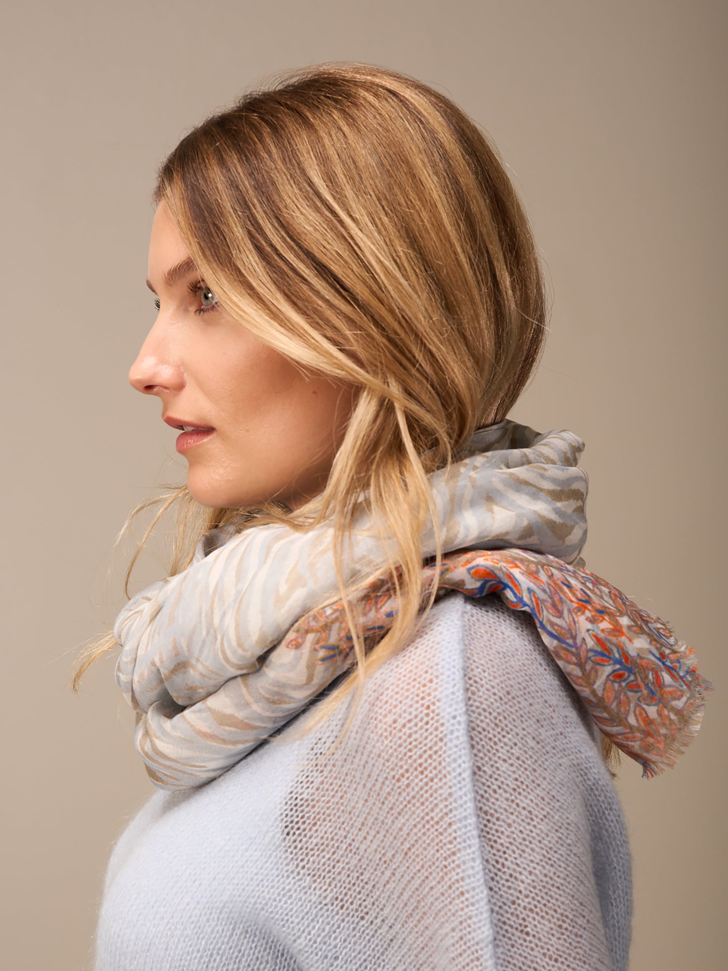 Rechteckiger, leicht transparenter Schal mit Alloverprint mit Fransen an der kürzeren Kante. 100% Modal (TENCELTM-zertifiziert).