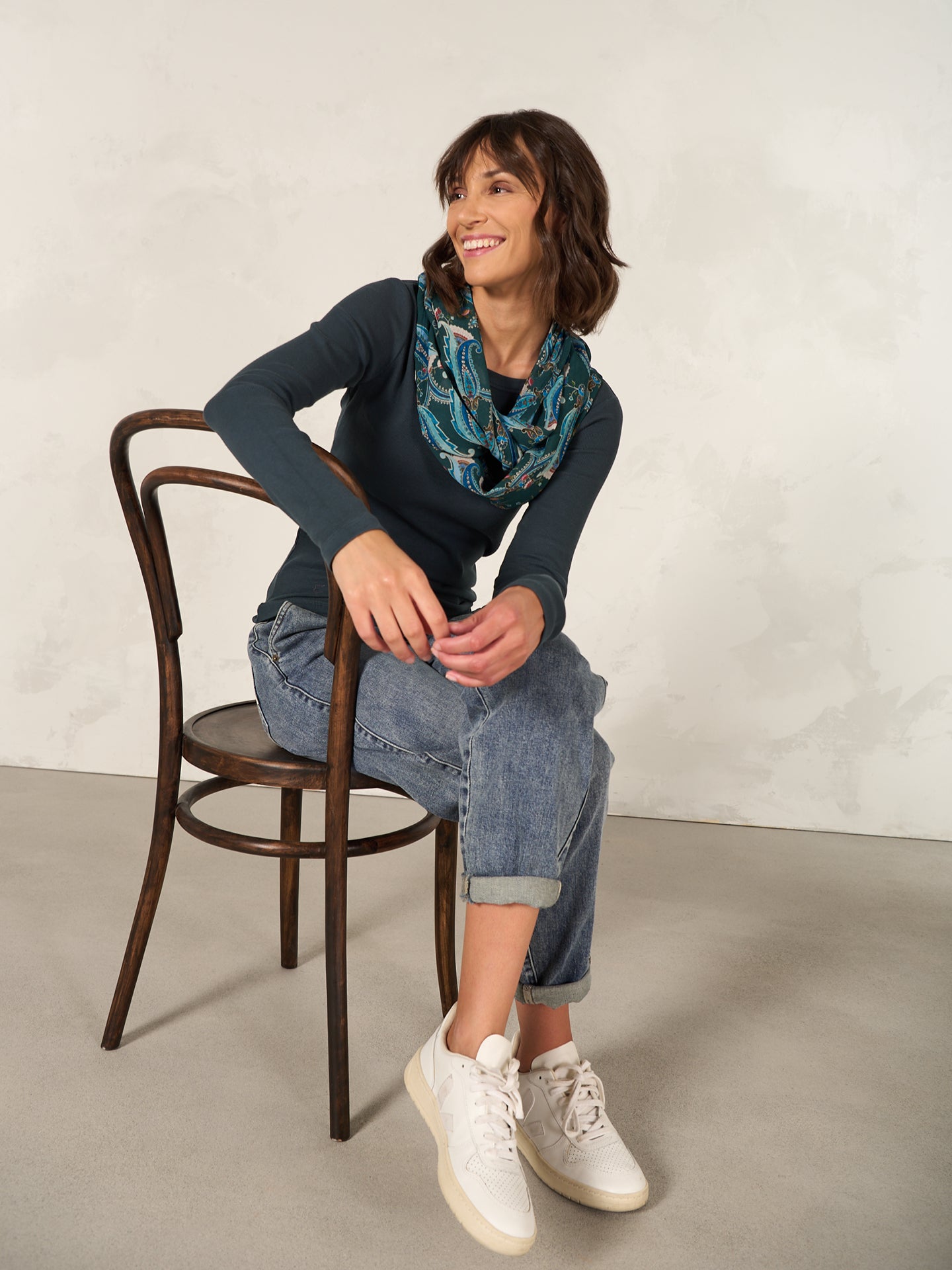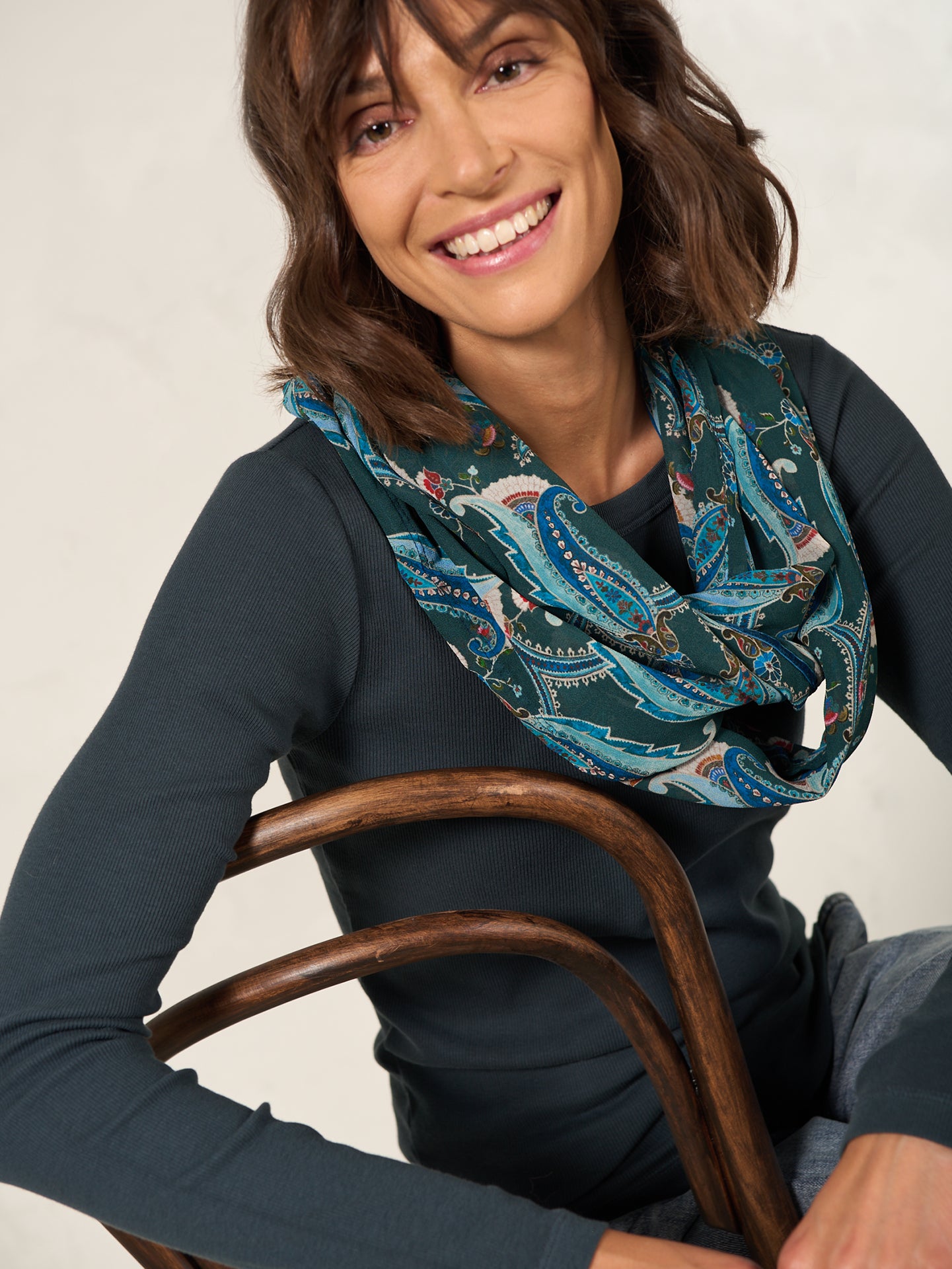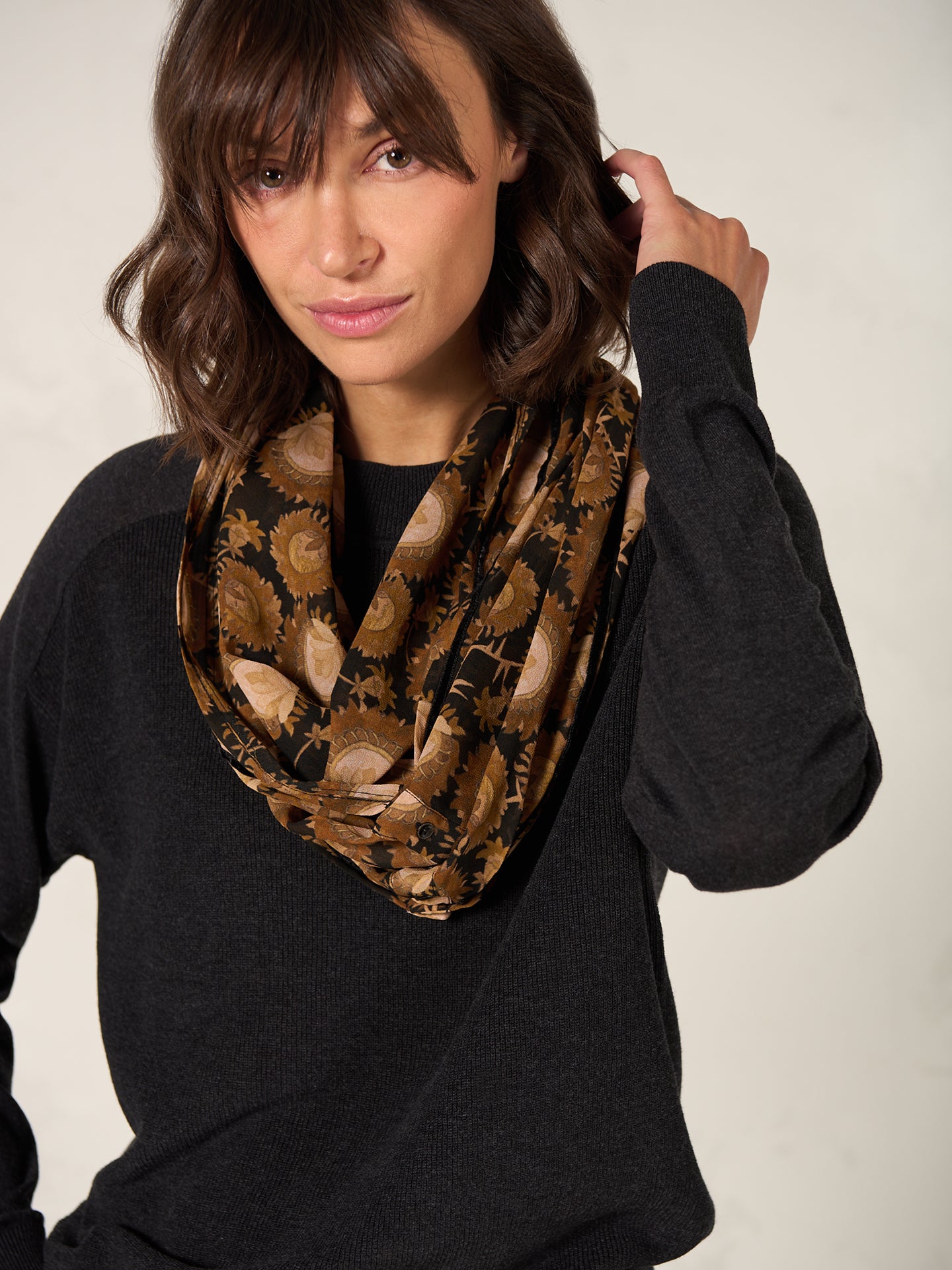 Fliessender Loopschal mit Spitzendetails, Knöpfen und Alloverprint. Aus 100% Eco Viskose, die aus nachhaltiger Holzwirtschaft gewonnen wird.